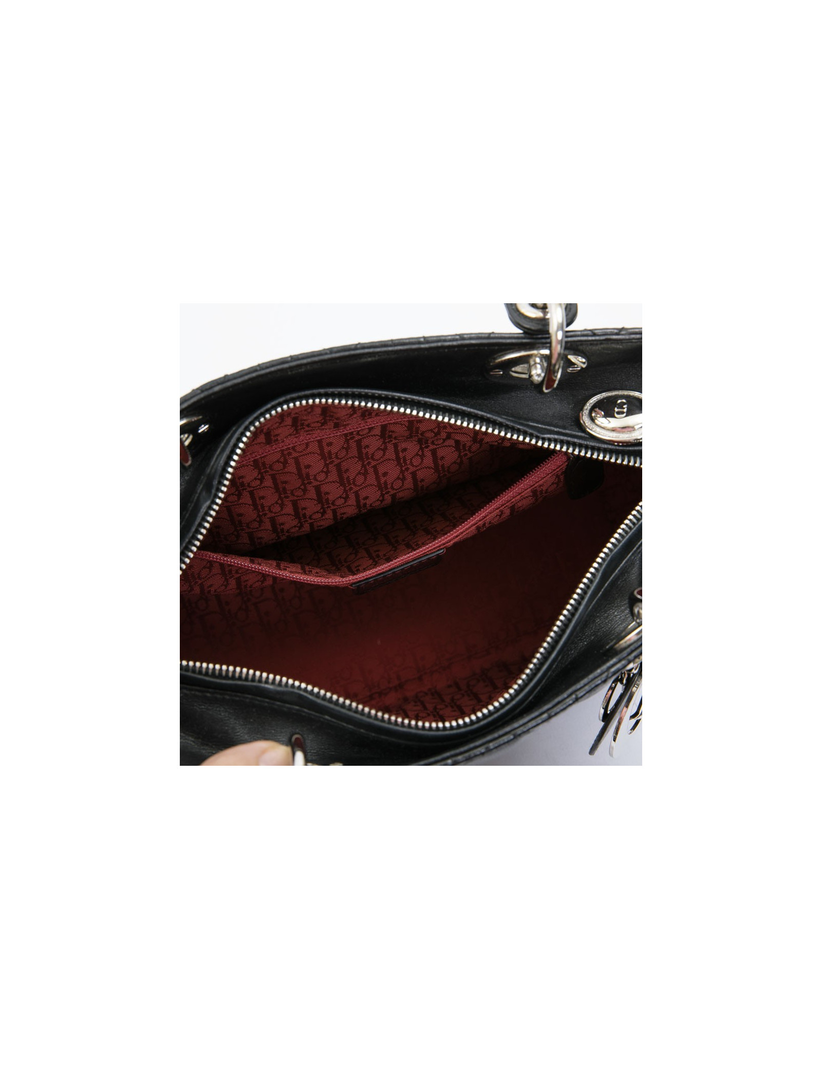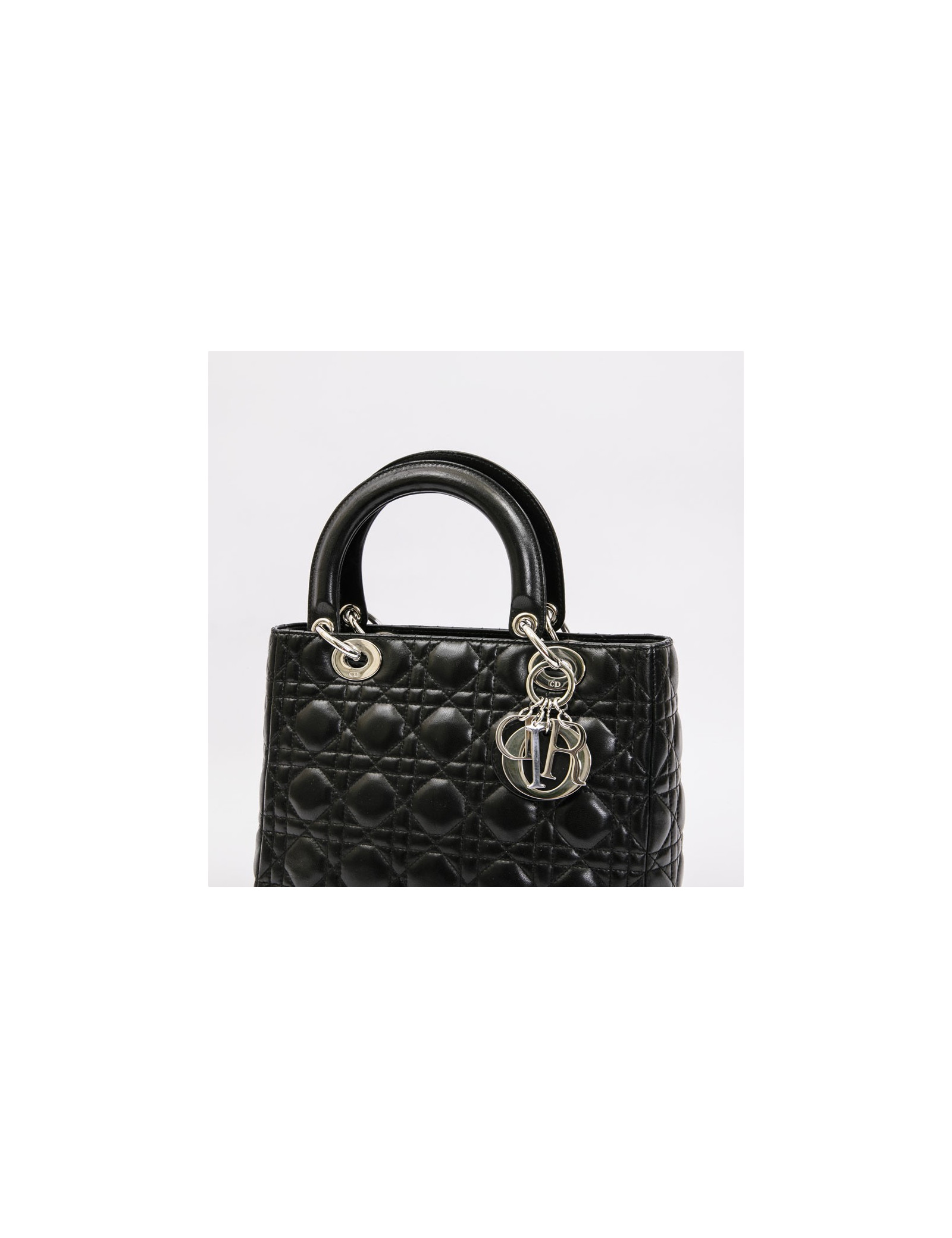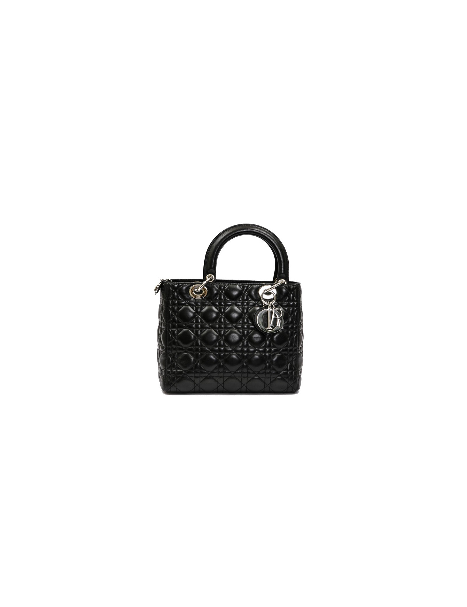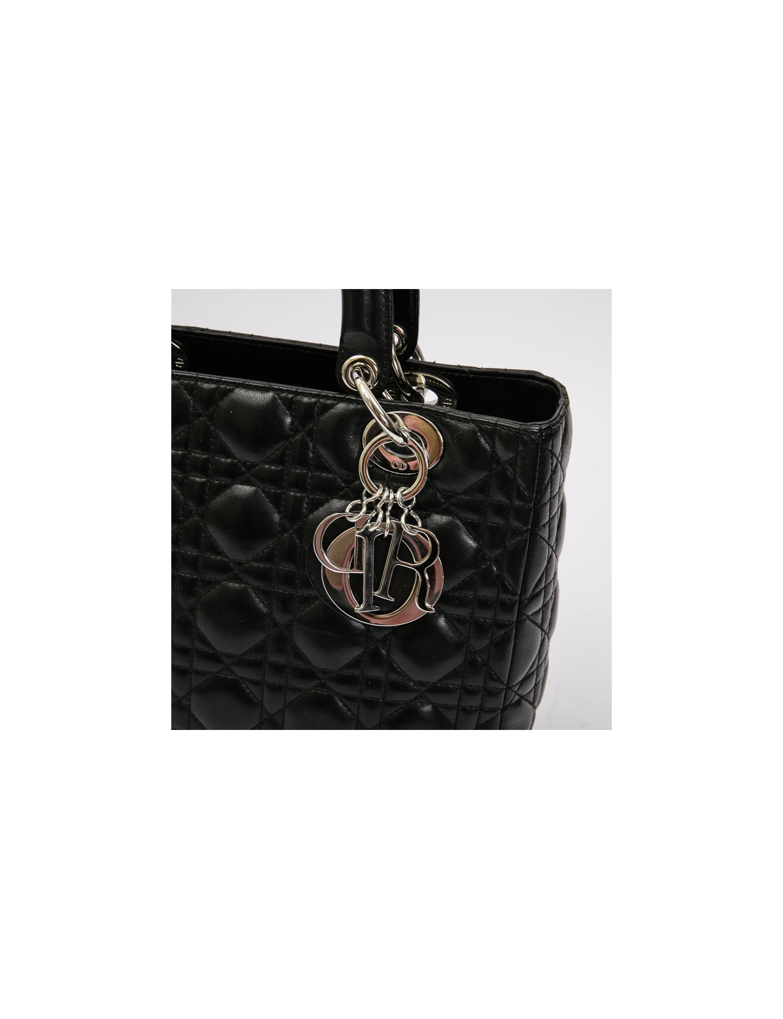 Christian Dior 'Lady D' bag in black lambskin leather with stitching. Palladium silver metal hardware. Zipper.