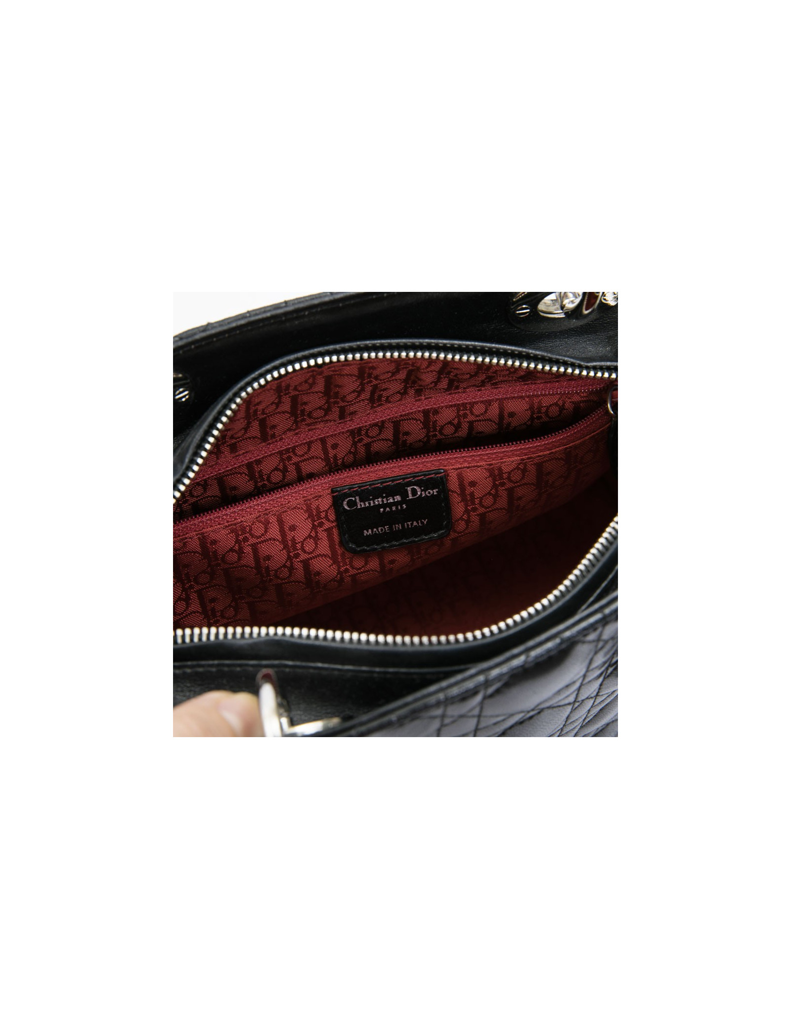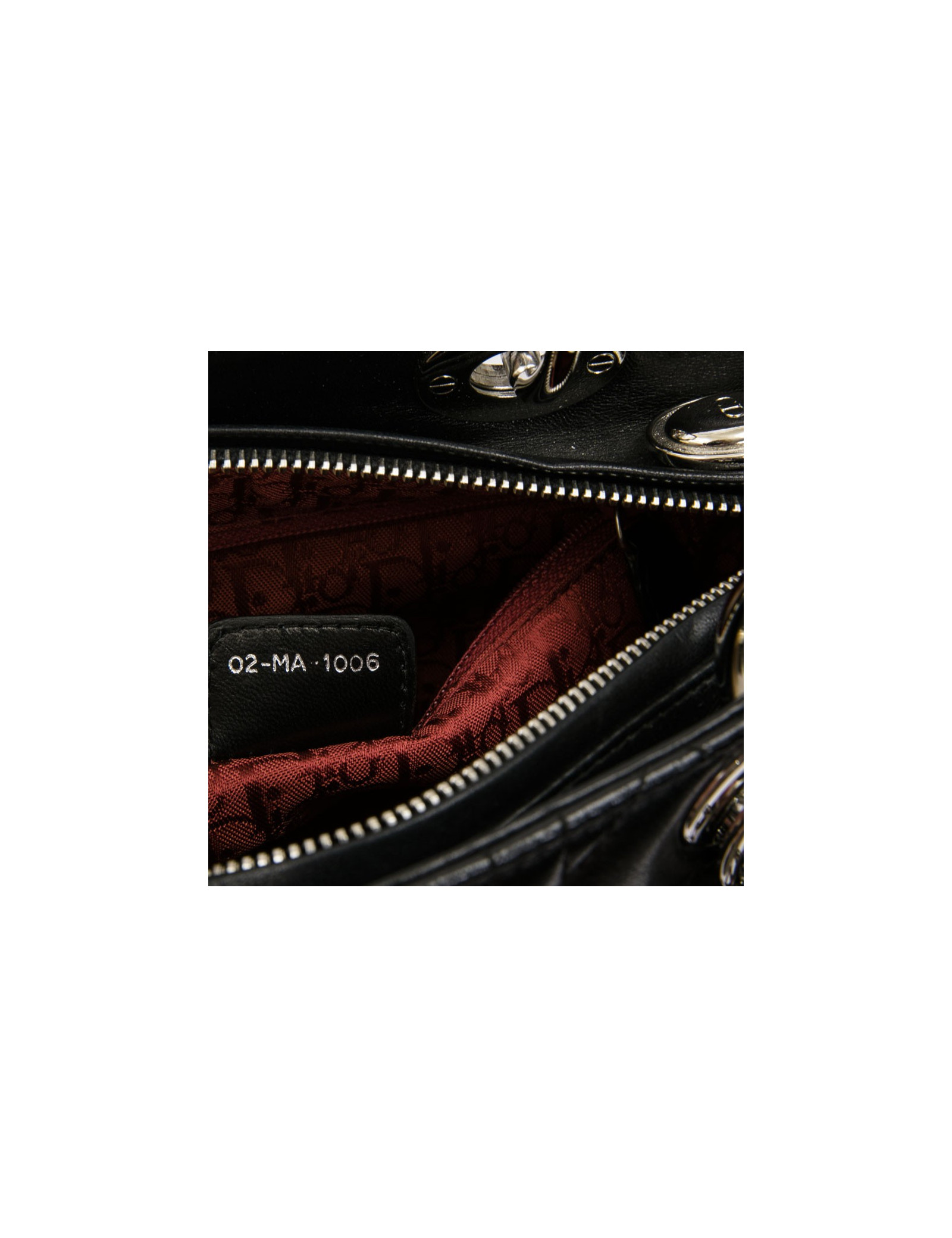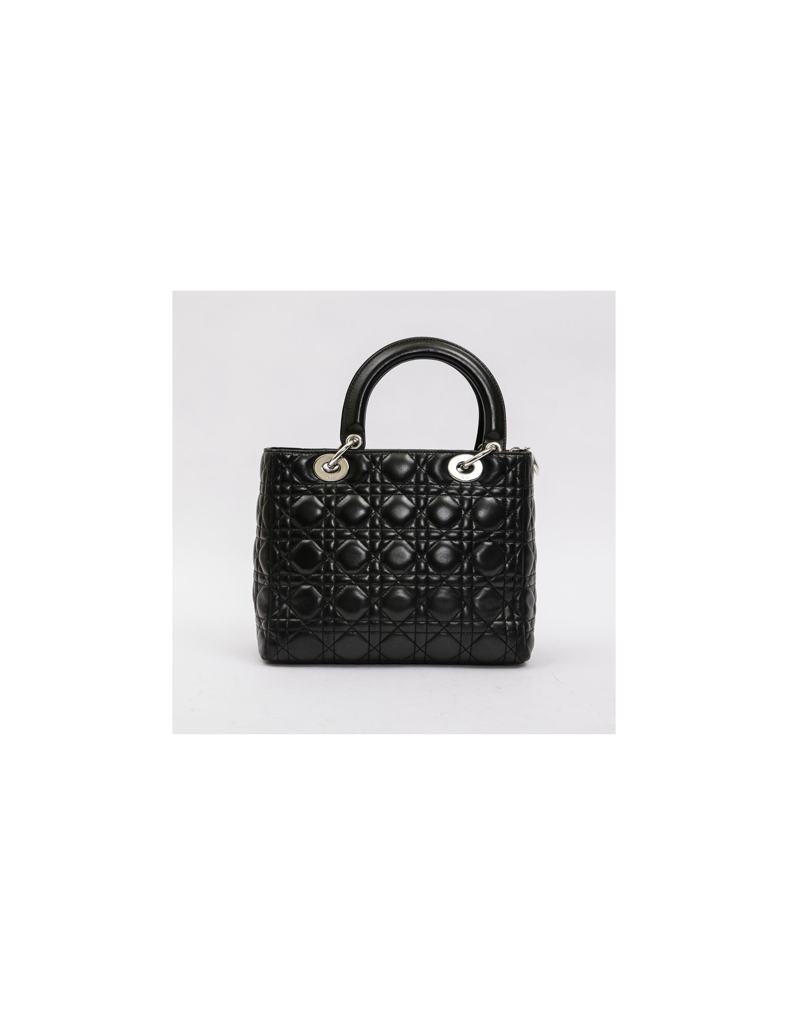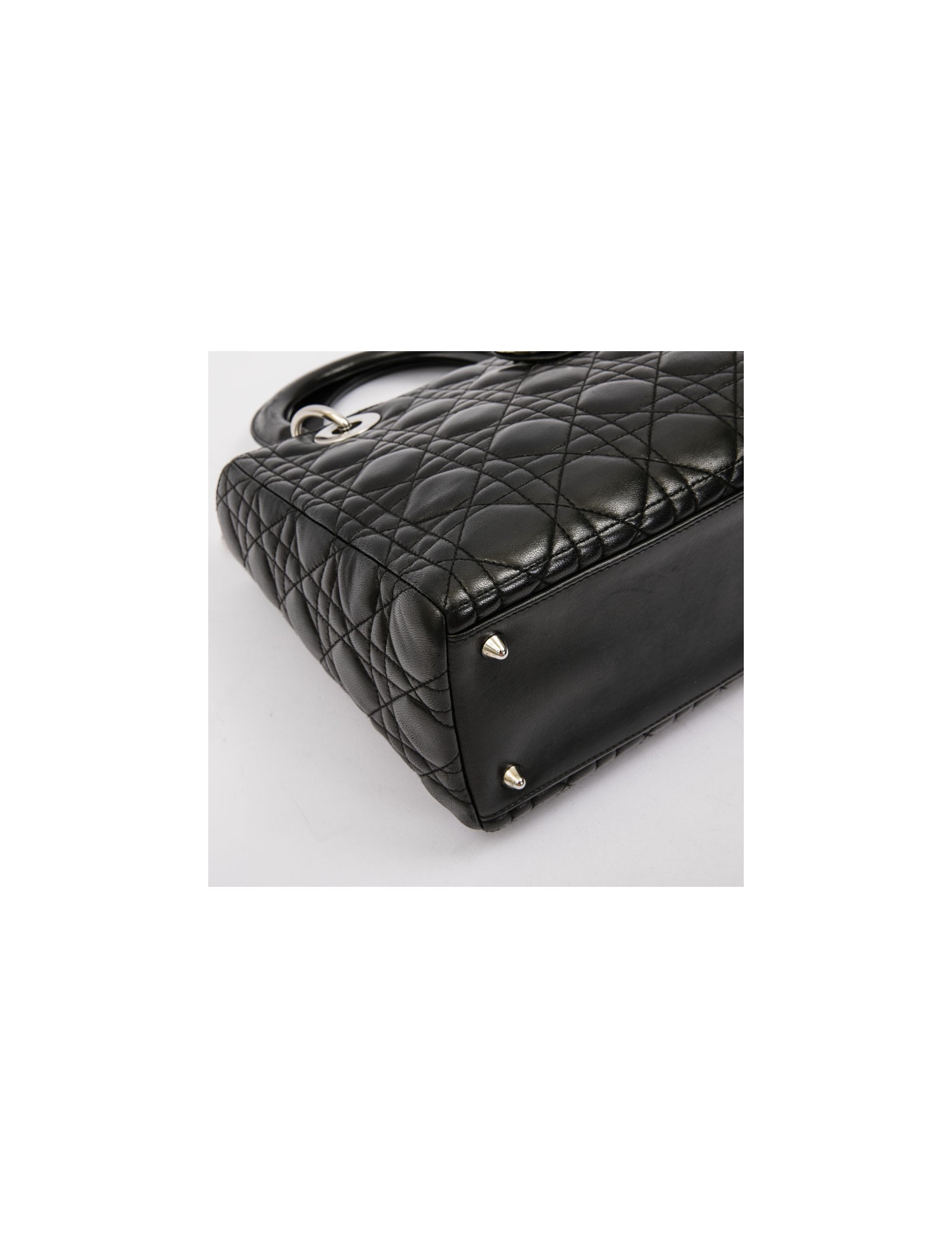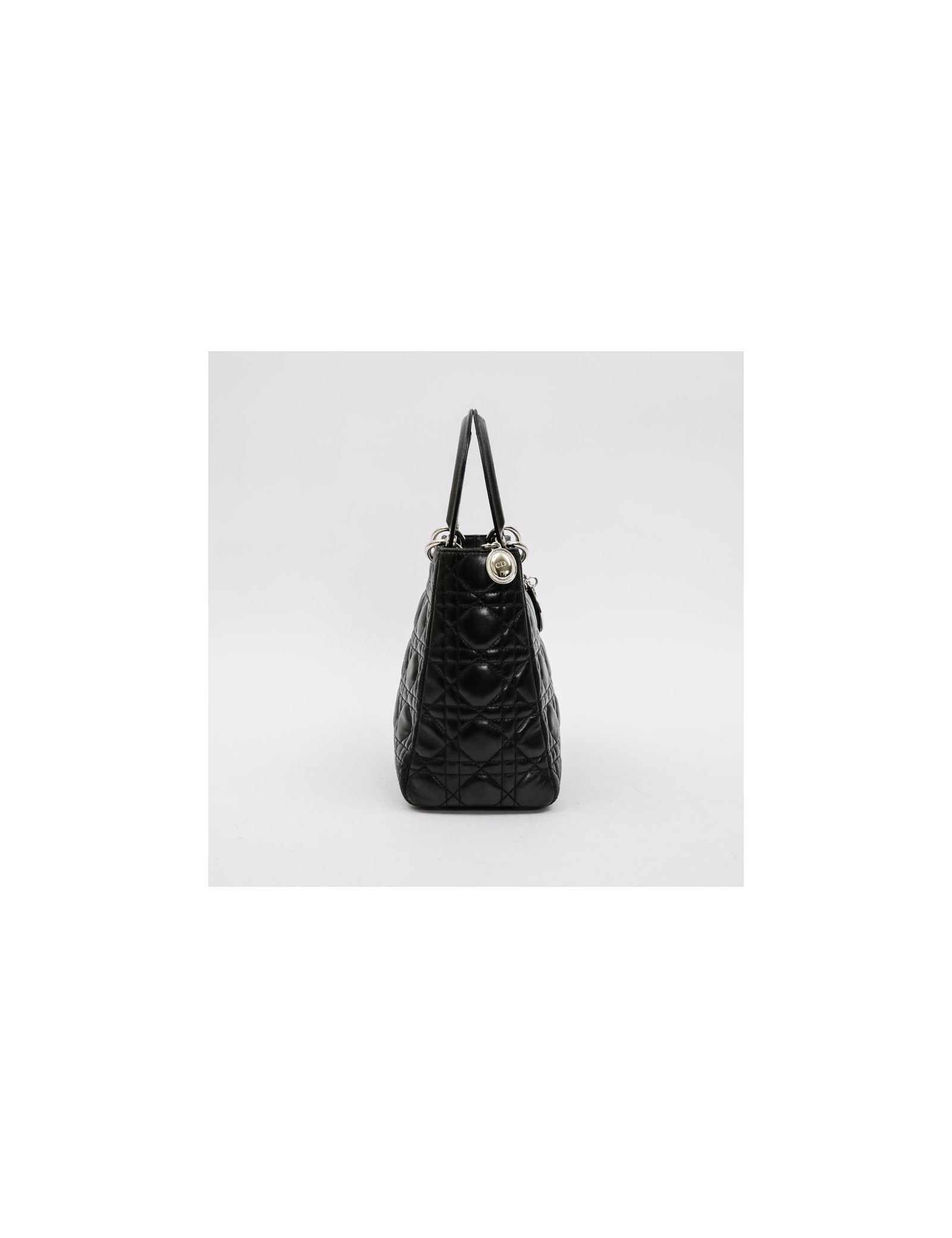 Christian Dior 'Lady D' bag in black lambskin leather with stitching. Palladium silver metal hardware. Zipper.