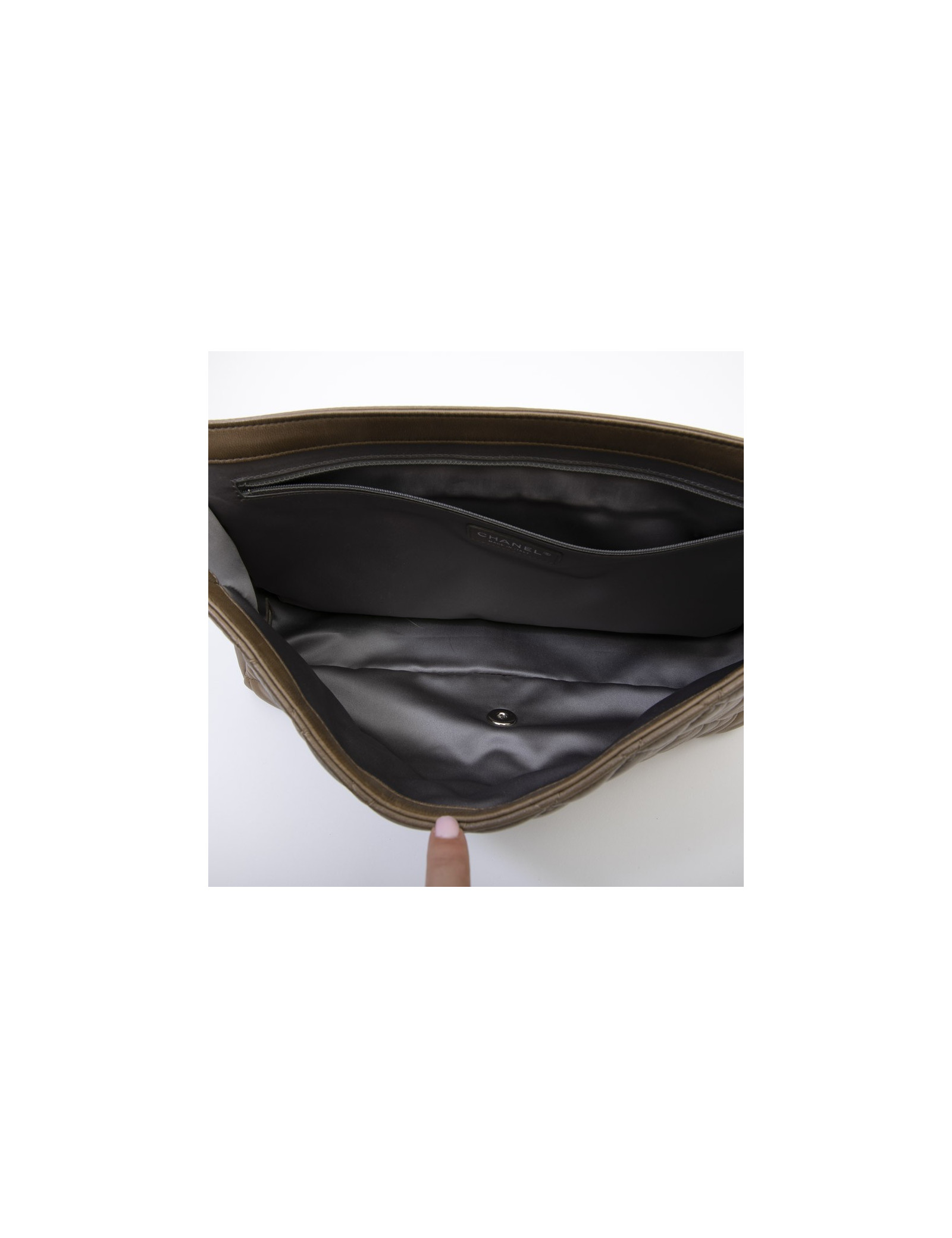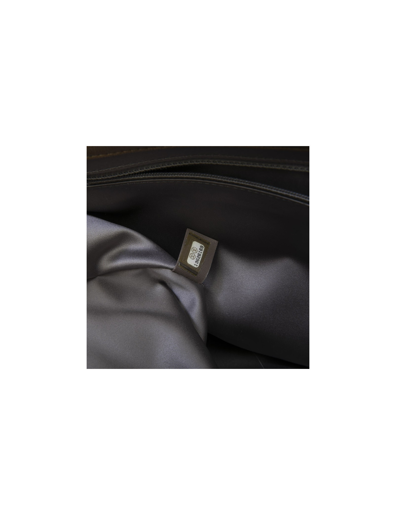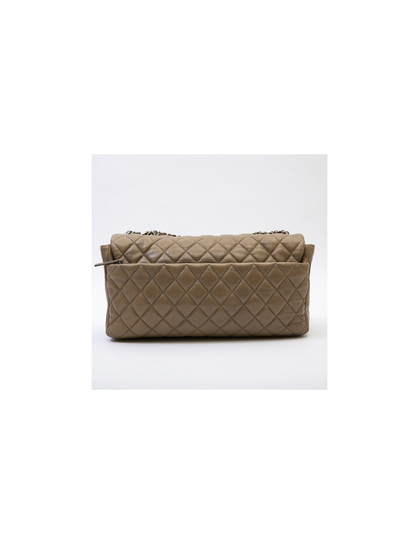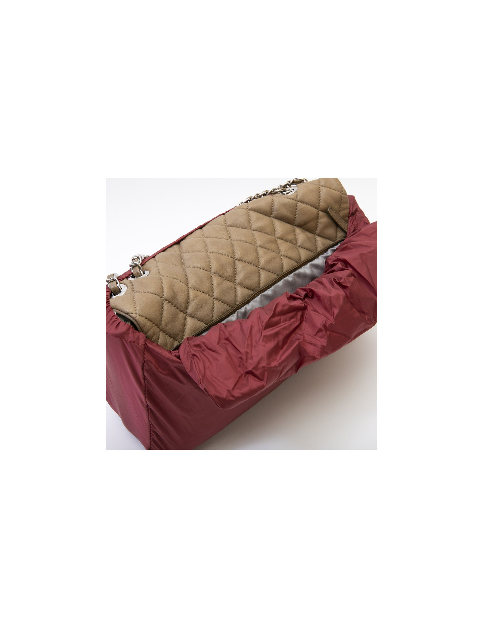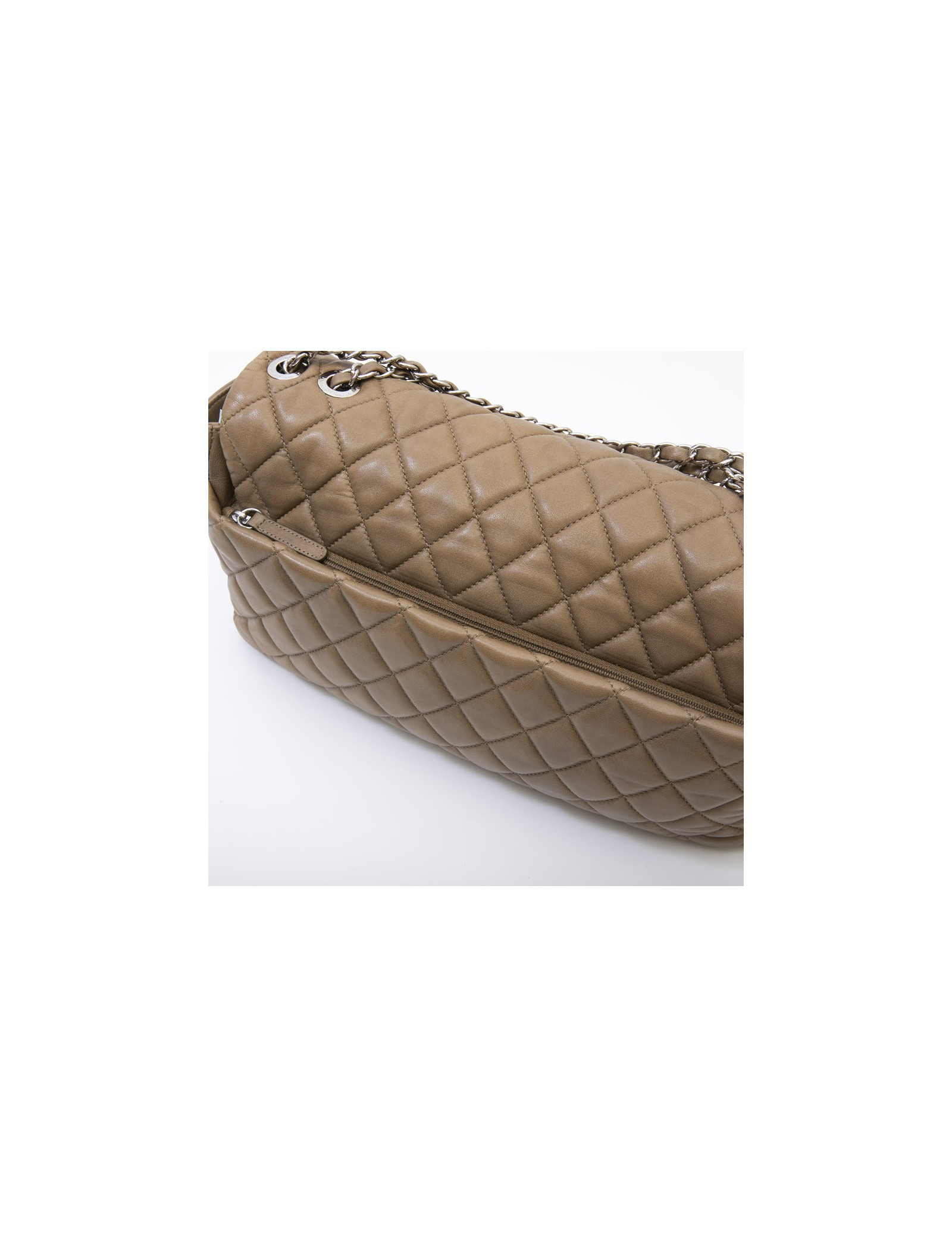 Chanel bag in brown soft quilted lambskin leather with integrated rain protection. Palladium silver metal hardware. Clasp 'CC'. The interior is in gray satin.
