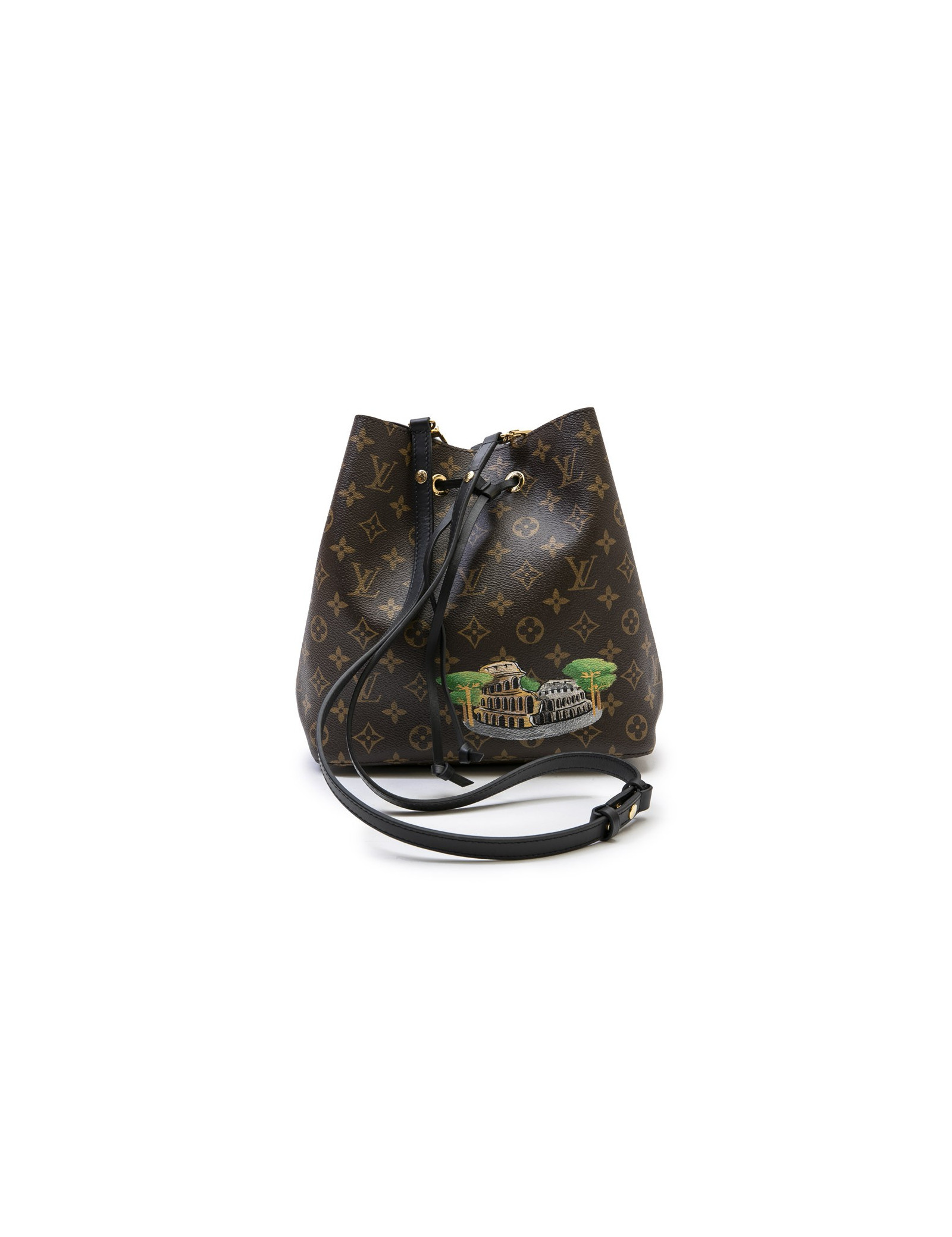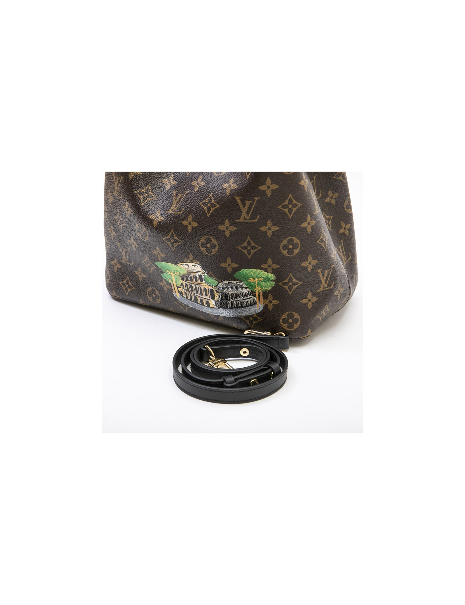Colisée printing. It is worn on the shoulder or crossover by a removable black leather shoulder strap 110 cm long. Golden brass hardware.