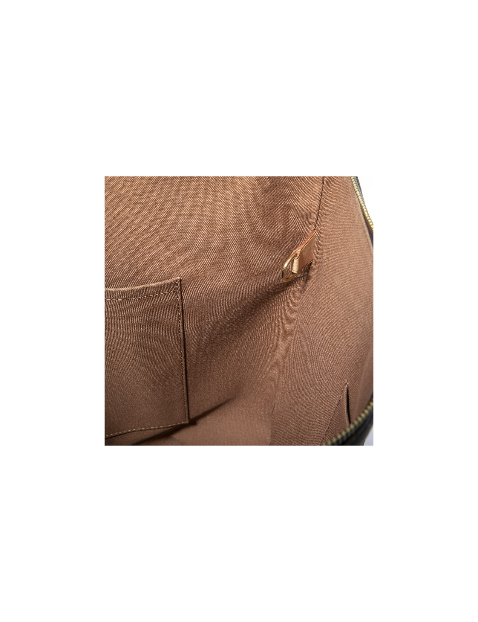 Inner lining in brown fabric. Three flat pockets inside and two large flat side pockets.