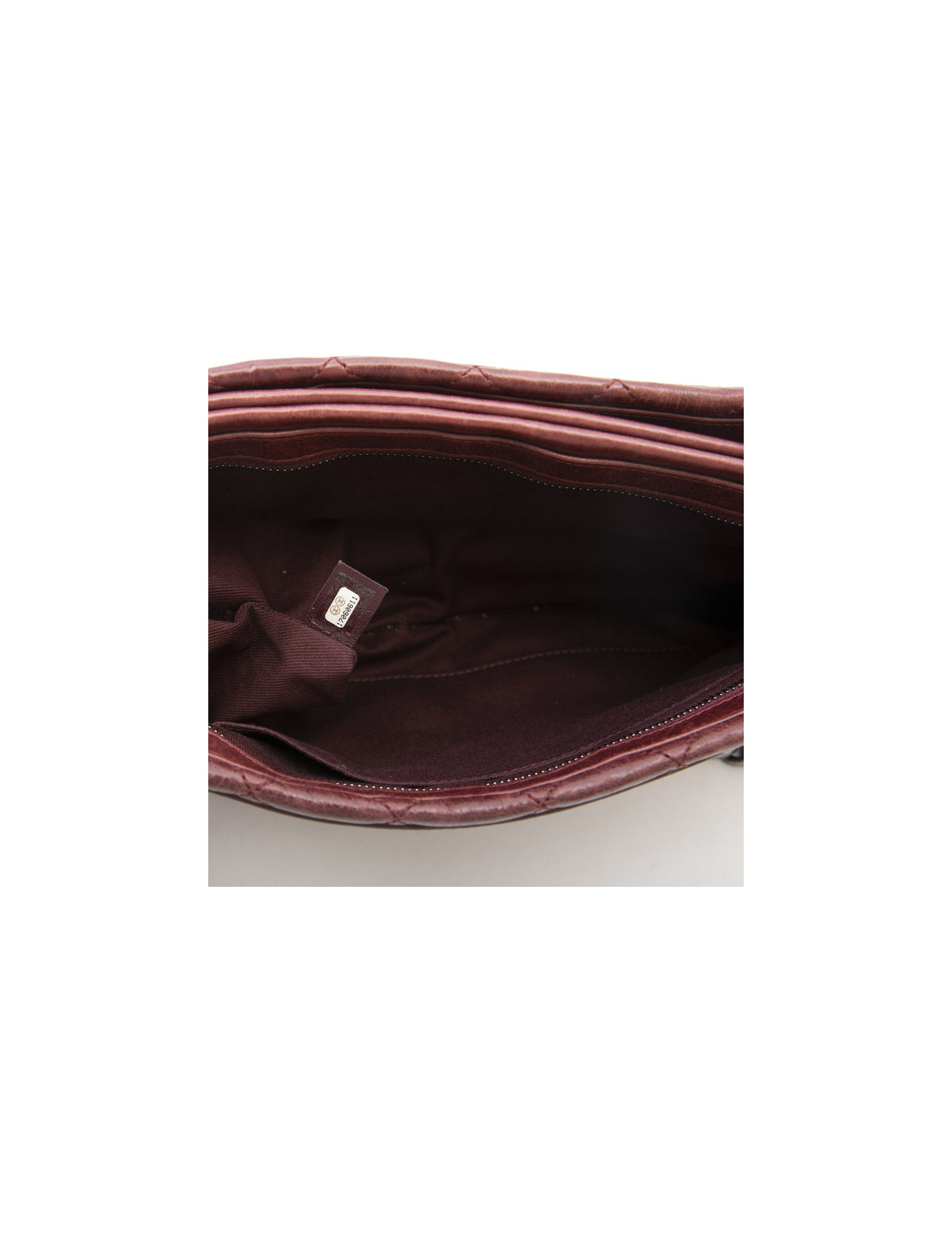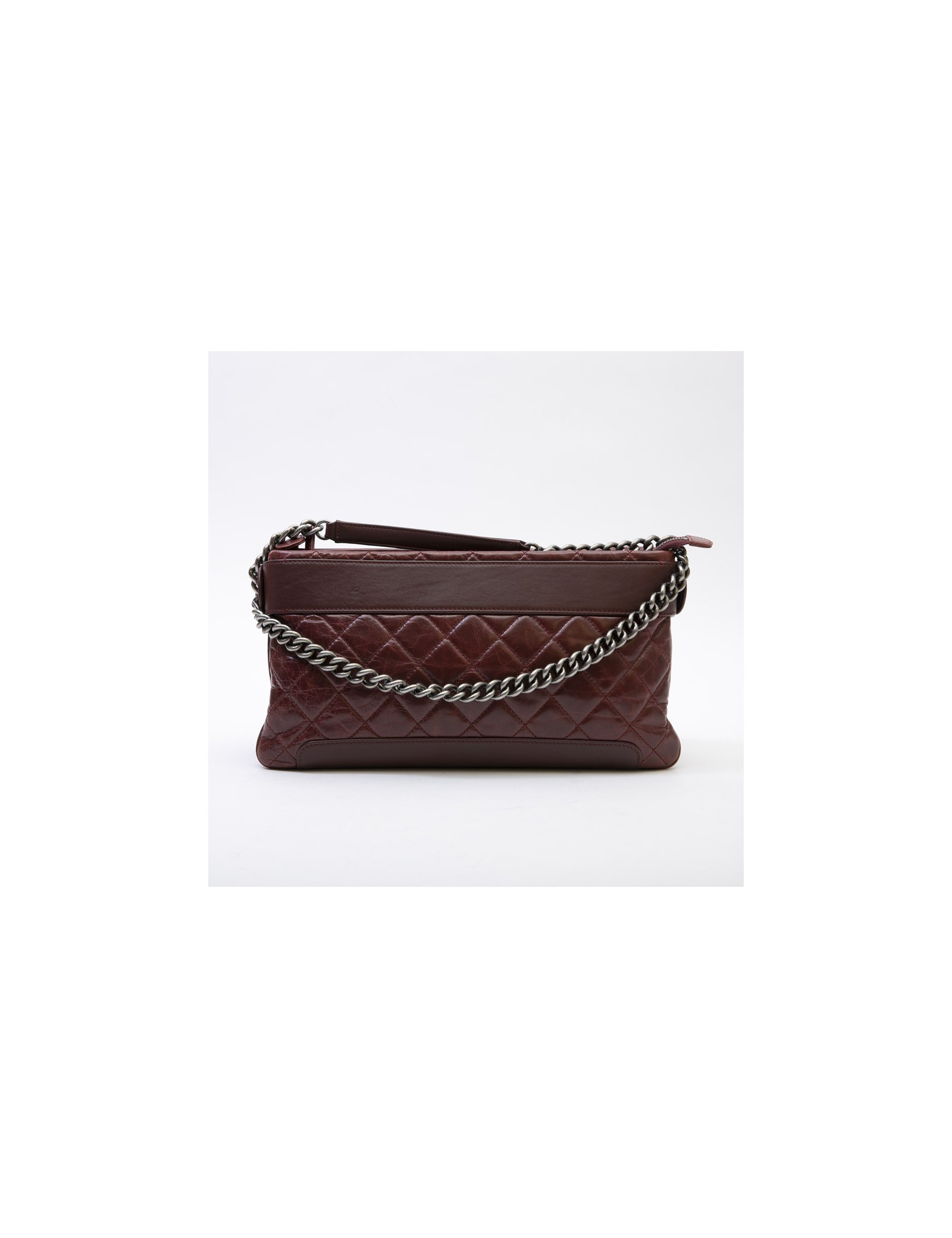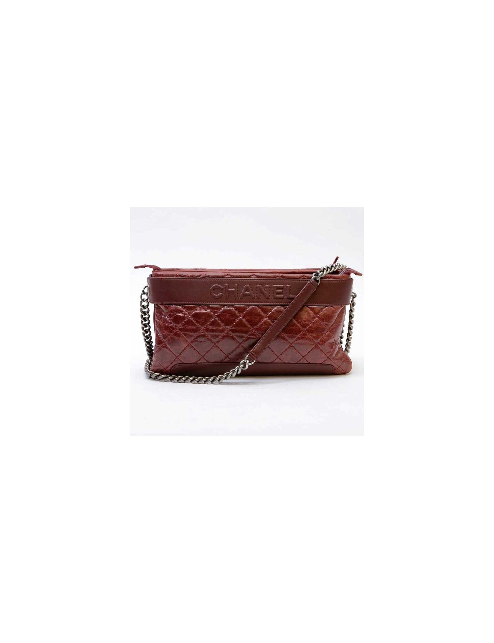 Chanel bag in burgundy quilted aged leather. Antique silver metal hardware. Double compartments. The interior is burgundy fabric with two gussets closed by a zip.
