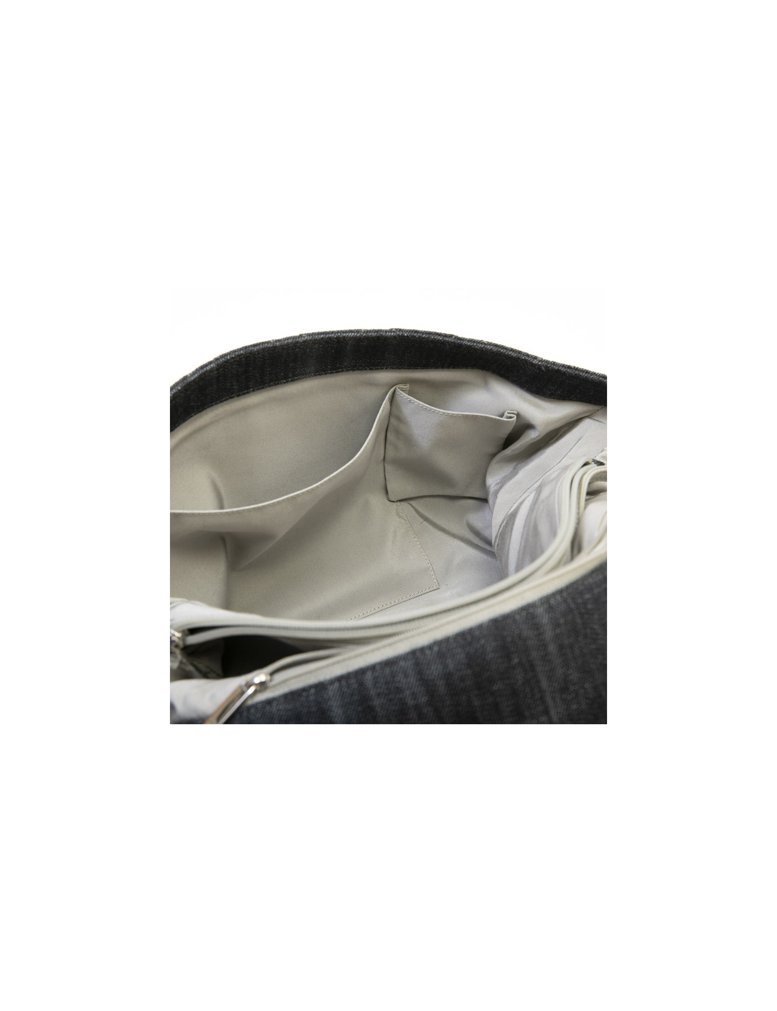 Worn on the shoulder or crossbody. The interior is in gray cloth. Made in Italy.