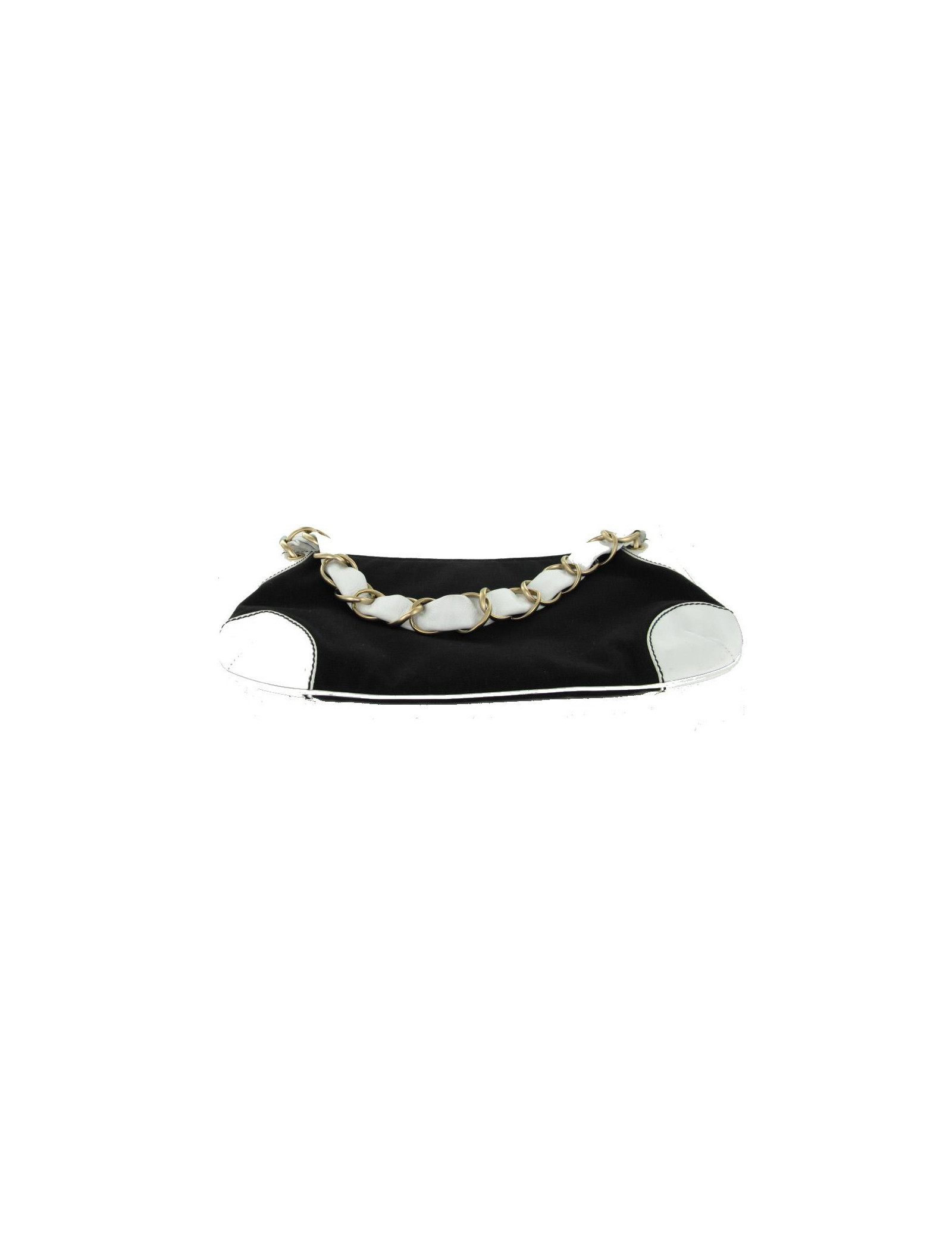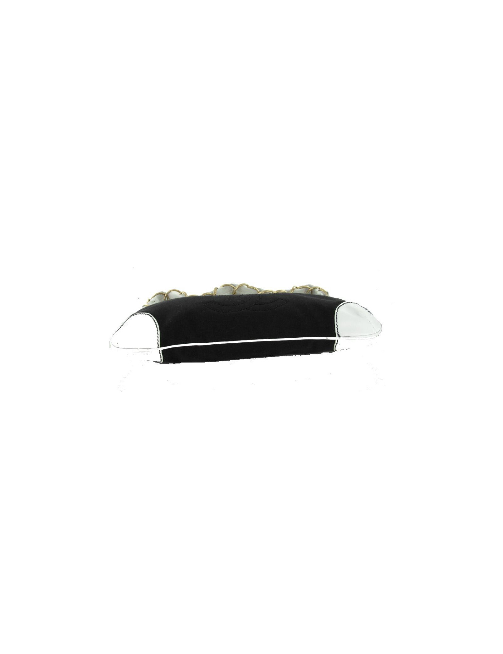 Ravissant sac pochette CHANEL, Collection "Croisière" en toile noir et cuir blanc. Il se porte à l'épaule. L'anse mêle cuir blanc et métal couleur or pâle.