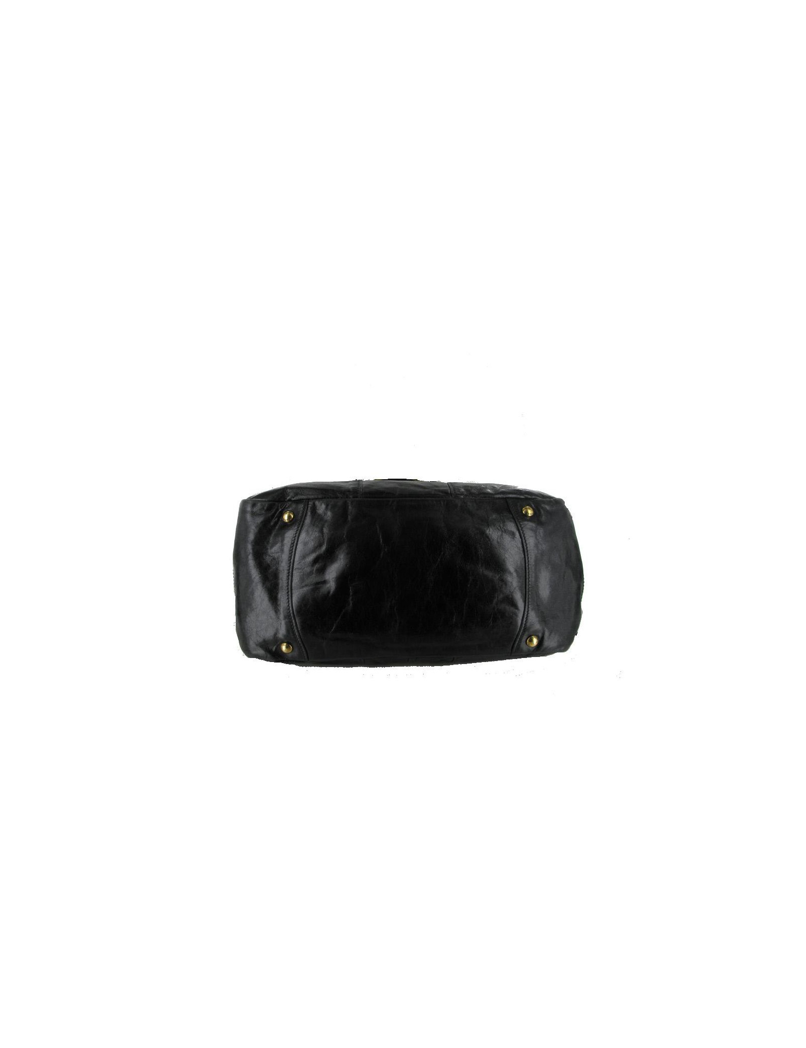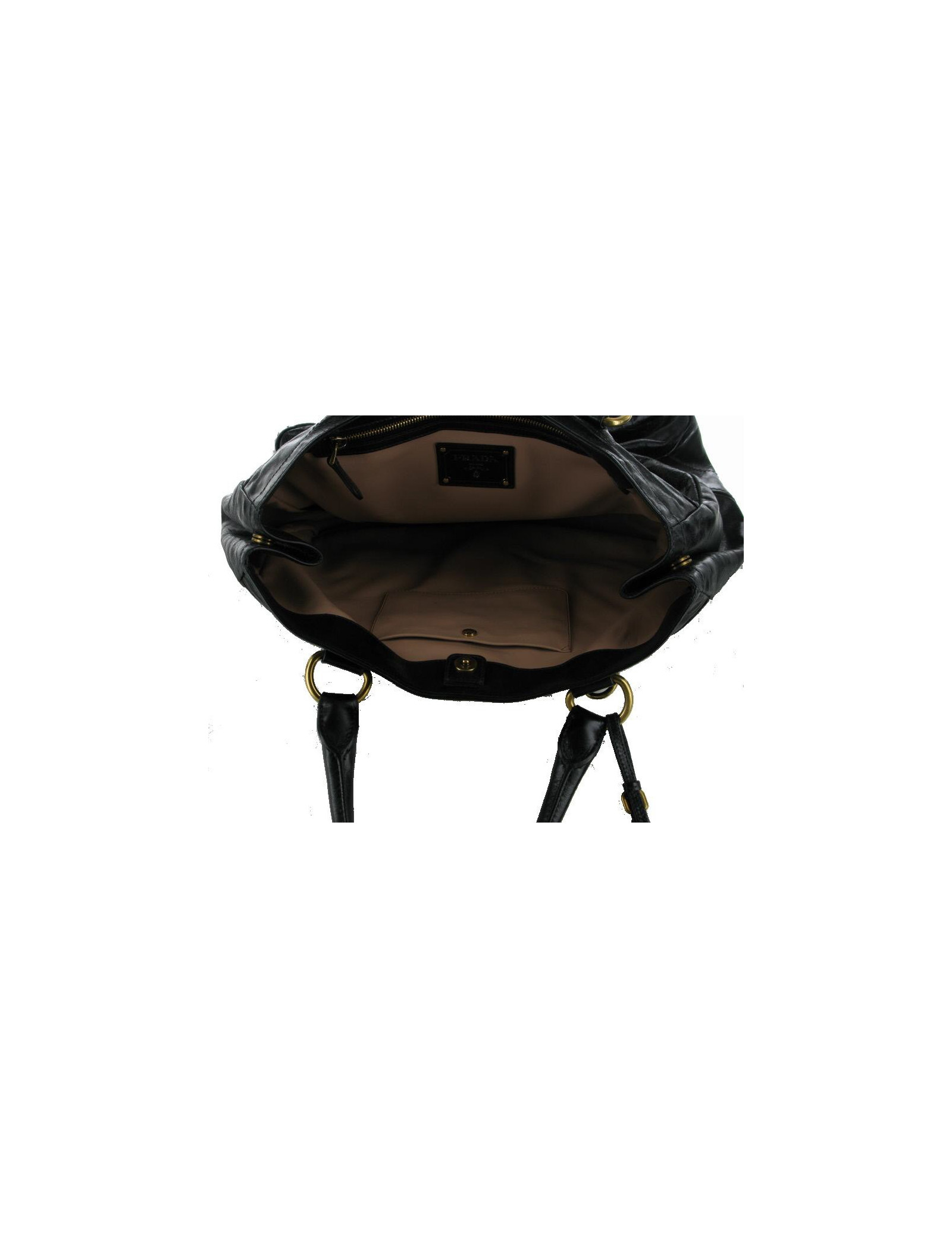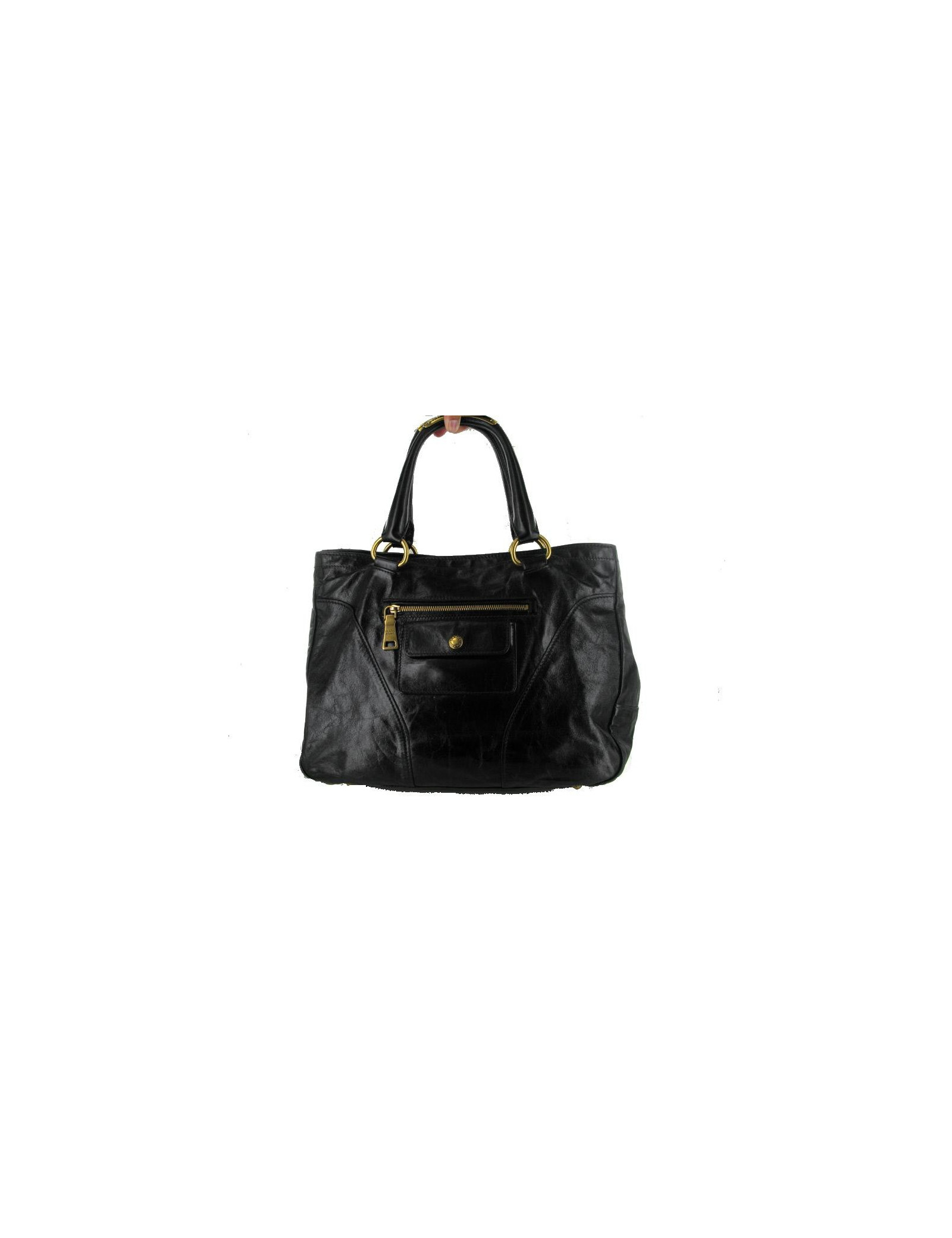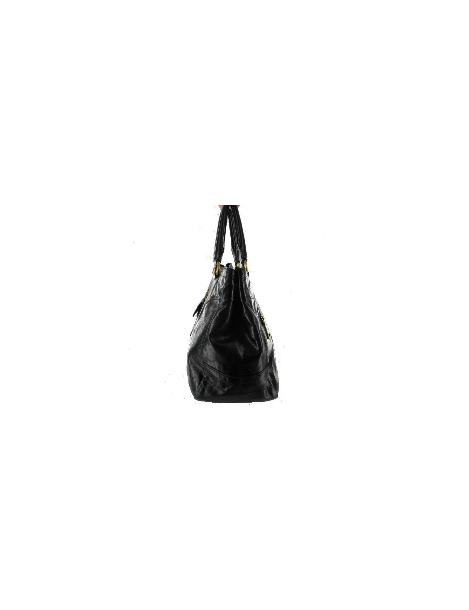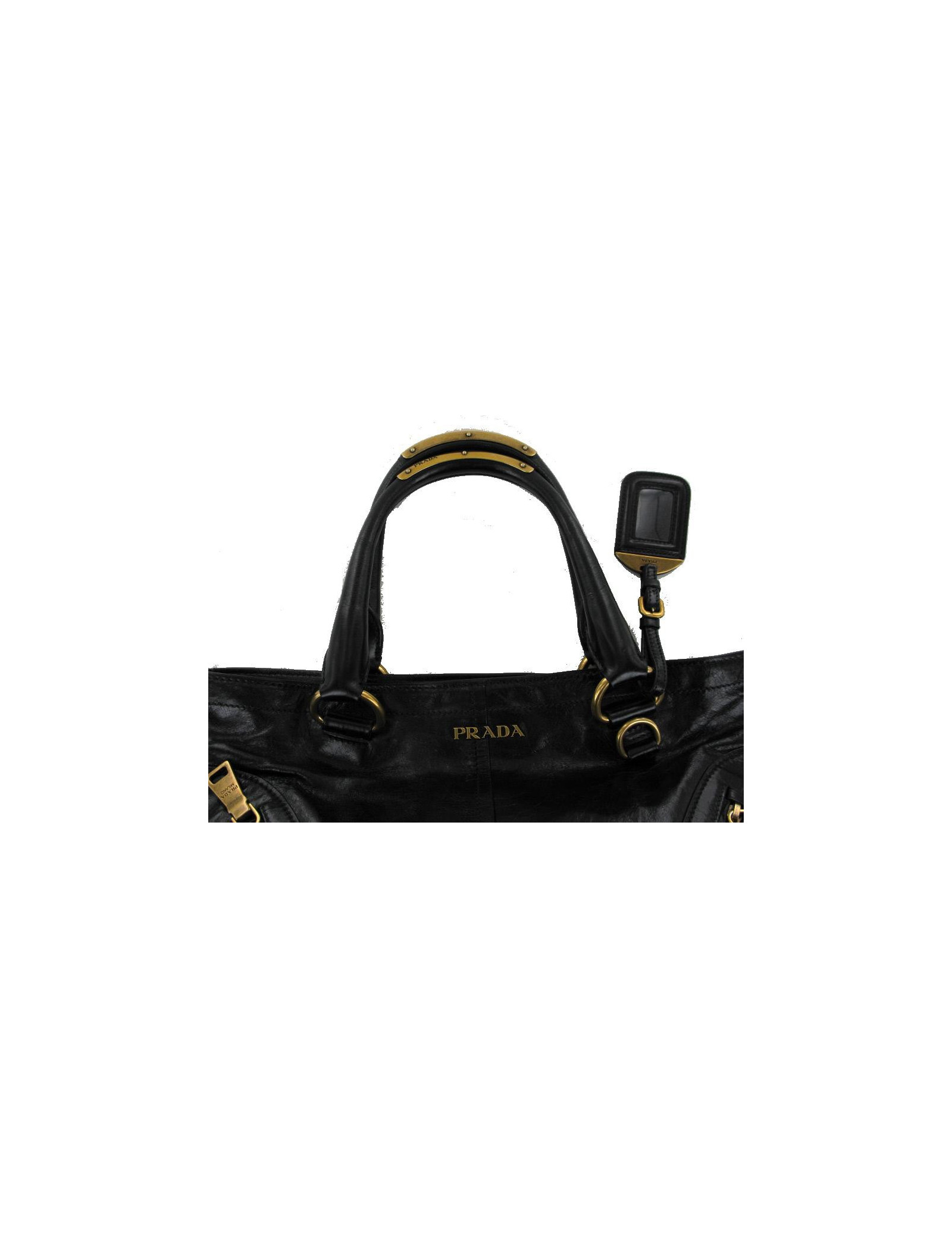 PRADA black leather bag. Hardware are aged gold metal. It is worn on the shoulder, there are two handles, they are slightly worn. It closes à l'aide d ' a snap. The depth of the bag is adjustable with two press studs located on the dimensions d bag. Outside, there are 4 pockets with 3 pockets. The Interior is leather pink old and in perfect condition. There are two pockets including 1 zipped. It is in very good condition.