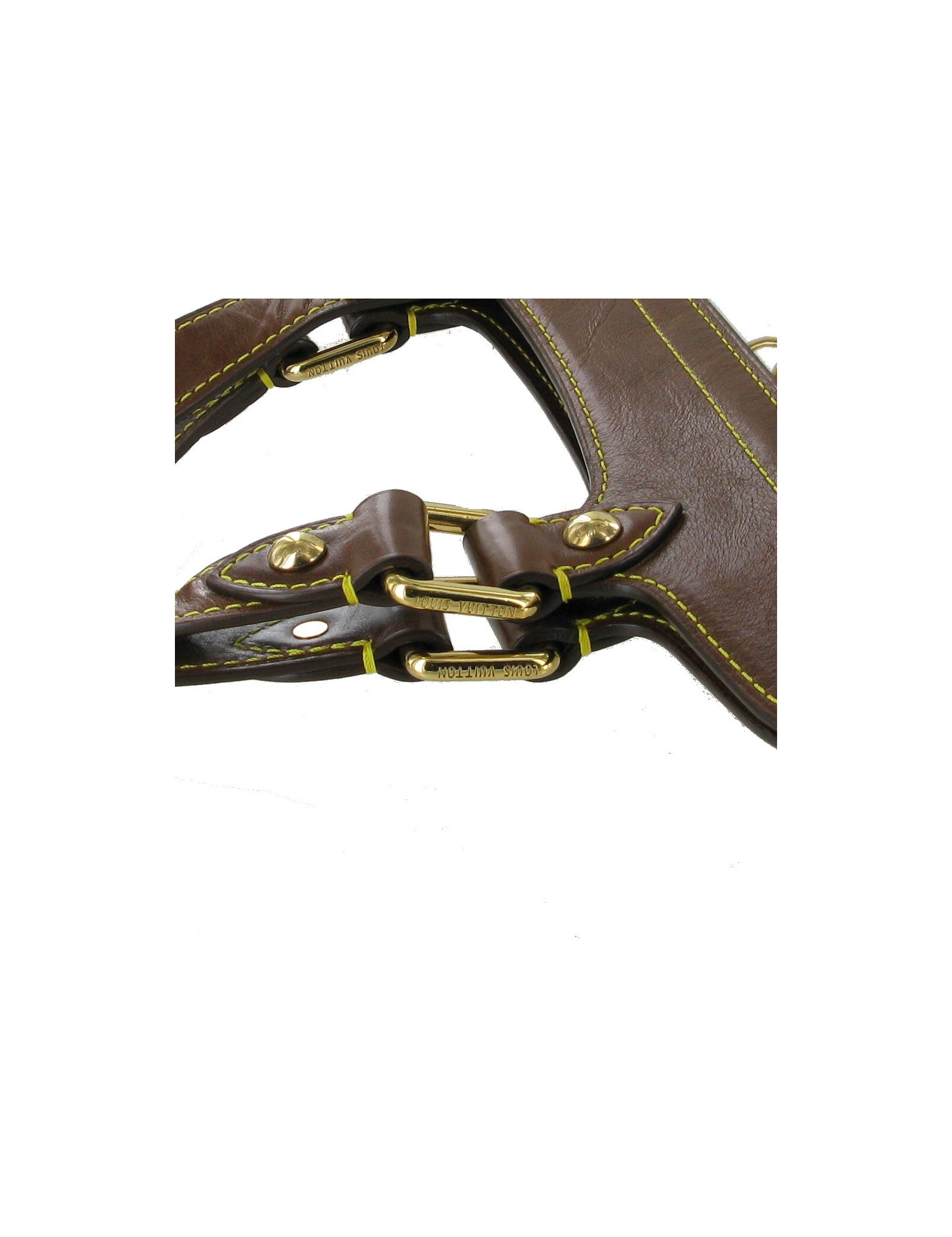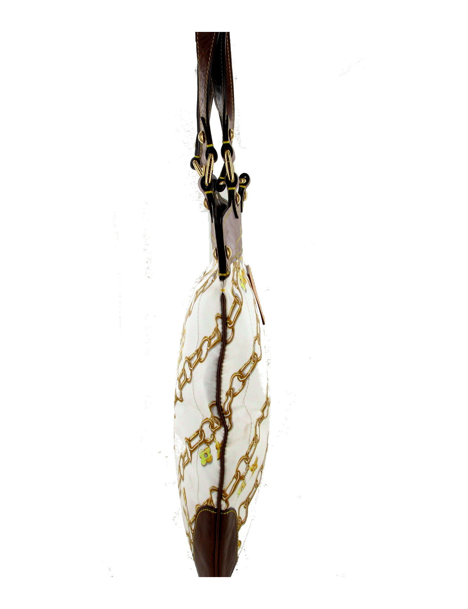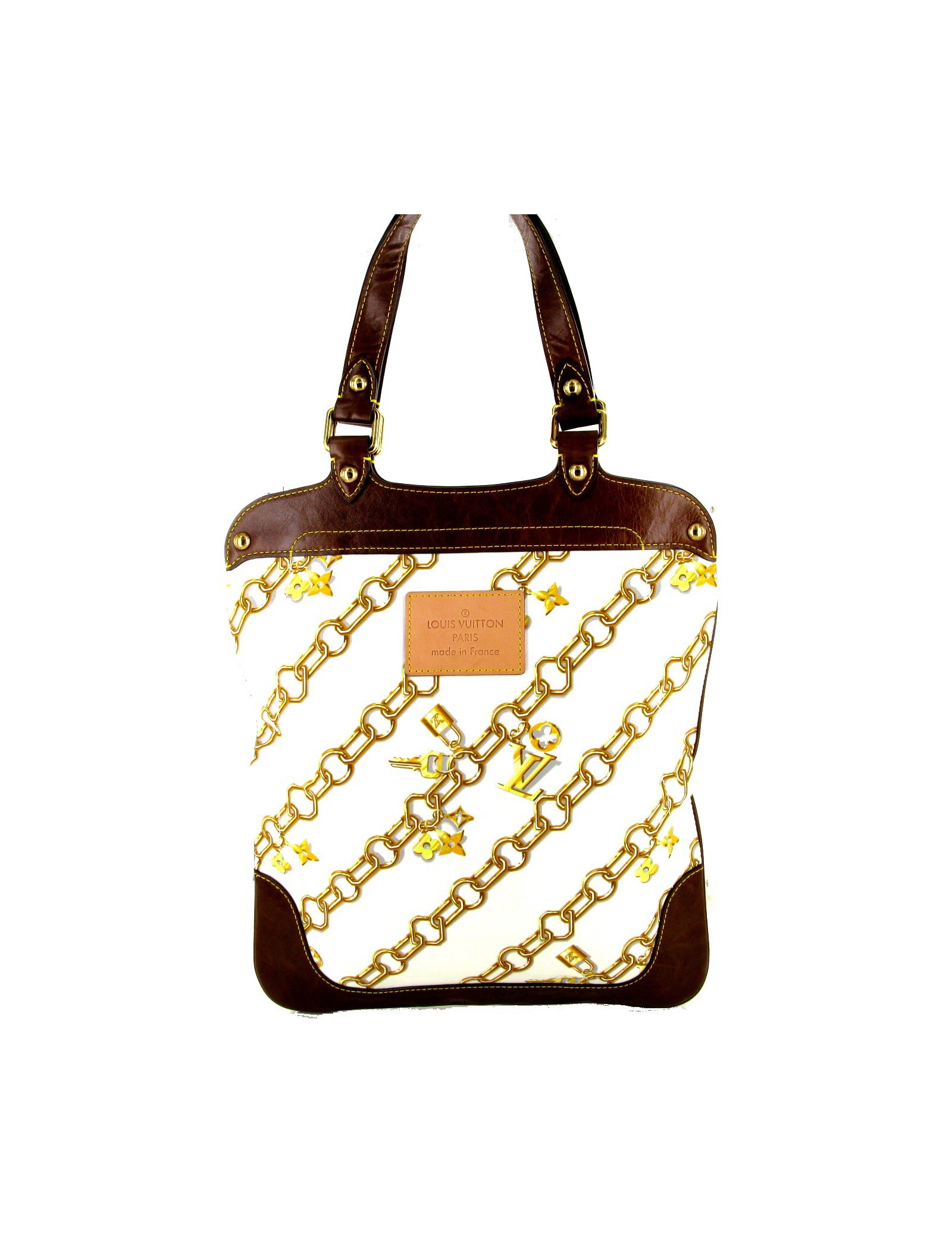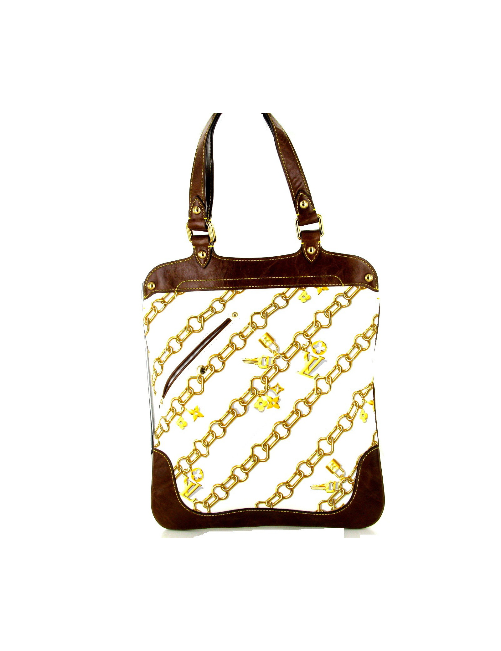 LOUIS VUITTON bag printed white canvas and brown leather. This LOUIS VUITTON bag, printed with a chain in gold sealed LV in very good condition, has an ideal format for transporting computer and A4 dossiers. Ideal therefore for the working girls who will no longer find their laptop or portfolio, they can stay in the inside pocket, either in the external Pocket closed with a snap. The yellow stitching on the brown leather add a modern side and summer bag. Golden hardware make a reminder with the print. SO Chic! Light, practical and worn on the shoulder, it will quickly become your favorite companion. Dimensions: 33.5x39x1cm
