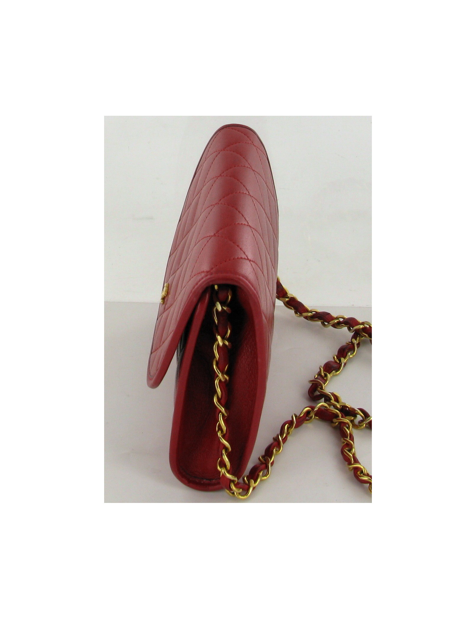 Very nice bag CHANEL quilted red smooth lambskin leather. This bag carrying strap Thanks to the Cove in leather and gold chain. It is closed by a press Stud.
