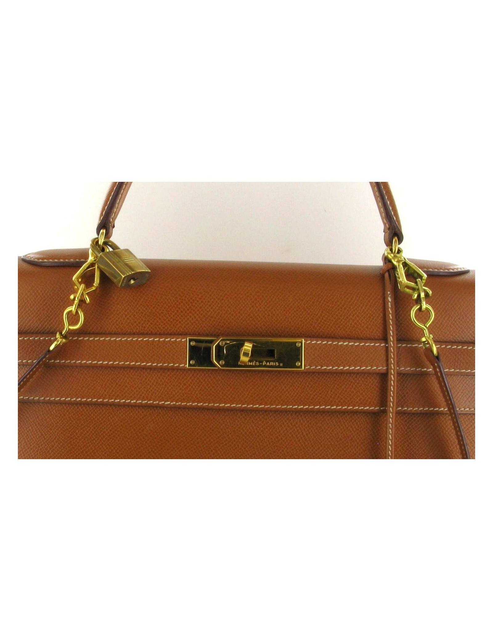 KELLY T 35, HERMES, leather Courchevel gold, pitting Sellier, acastillage gold metal. Letter S surrounded, year 1989. That play, in perfect condition, went through the years without taking a ride. Hermès having stopped the manufacture of the Kelly bag in very noble leather is leather Courchevel, this bag has become an extremely rare piece. In addition, seams Sanchez asked Hermès artisans a particular rigour and specific know-how. Padlocks and keys under Bell, long removable shackle. Small trace of pen on the bottom of the bag. Inside a few light scratches and traces of pen. It will be delivered in his dustbag.