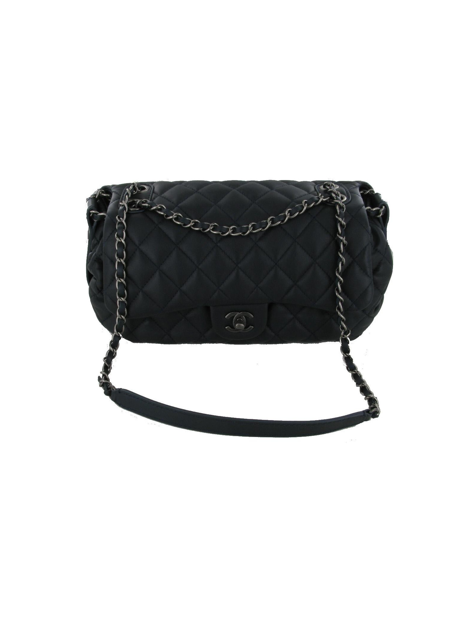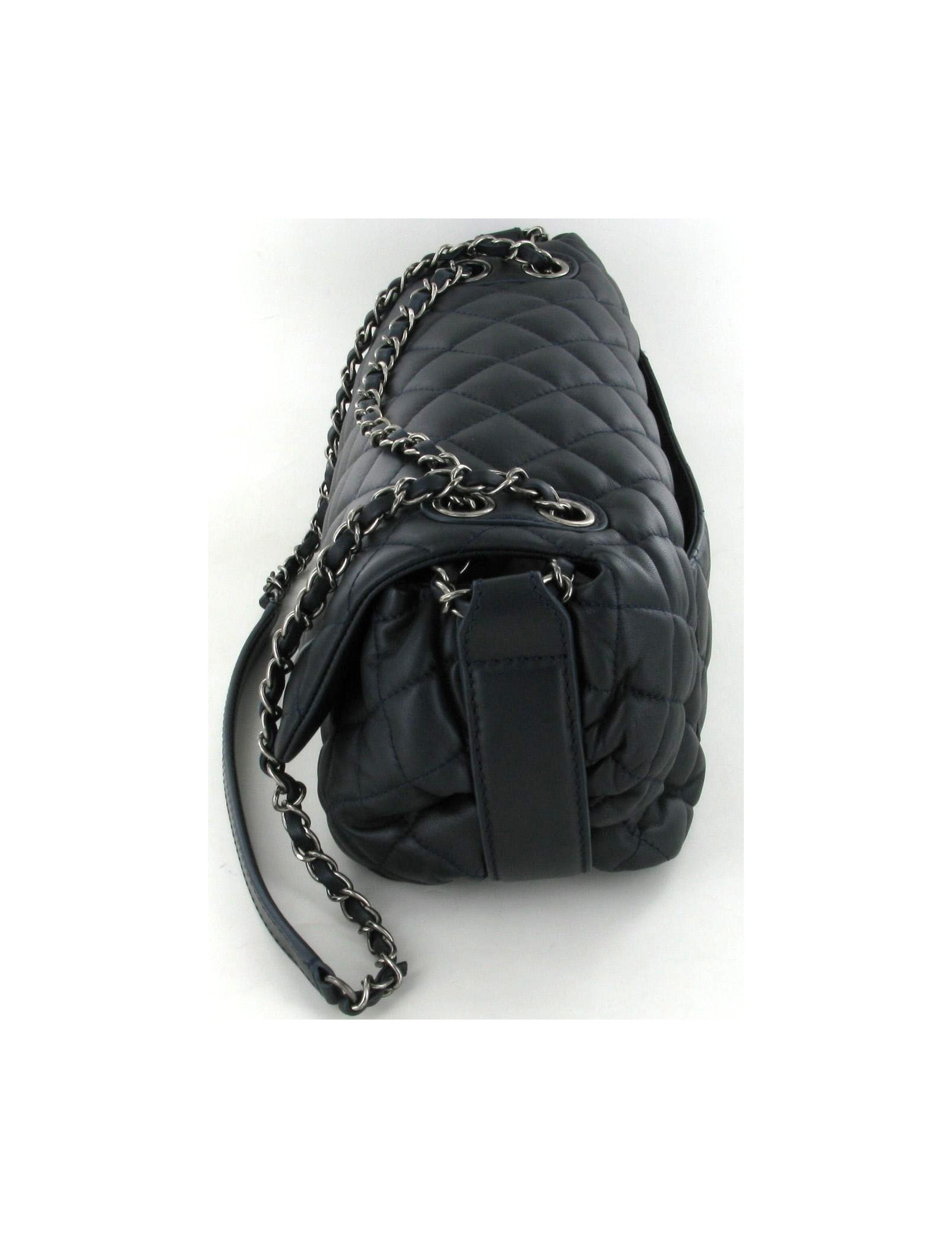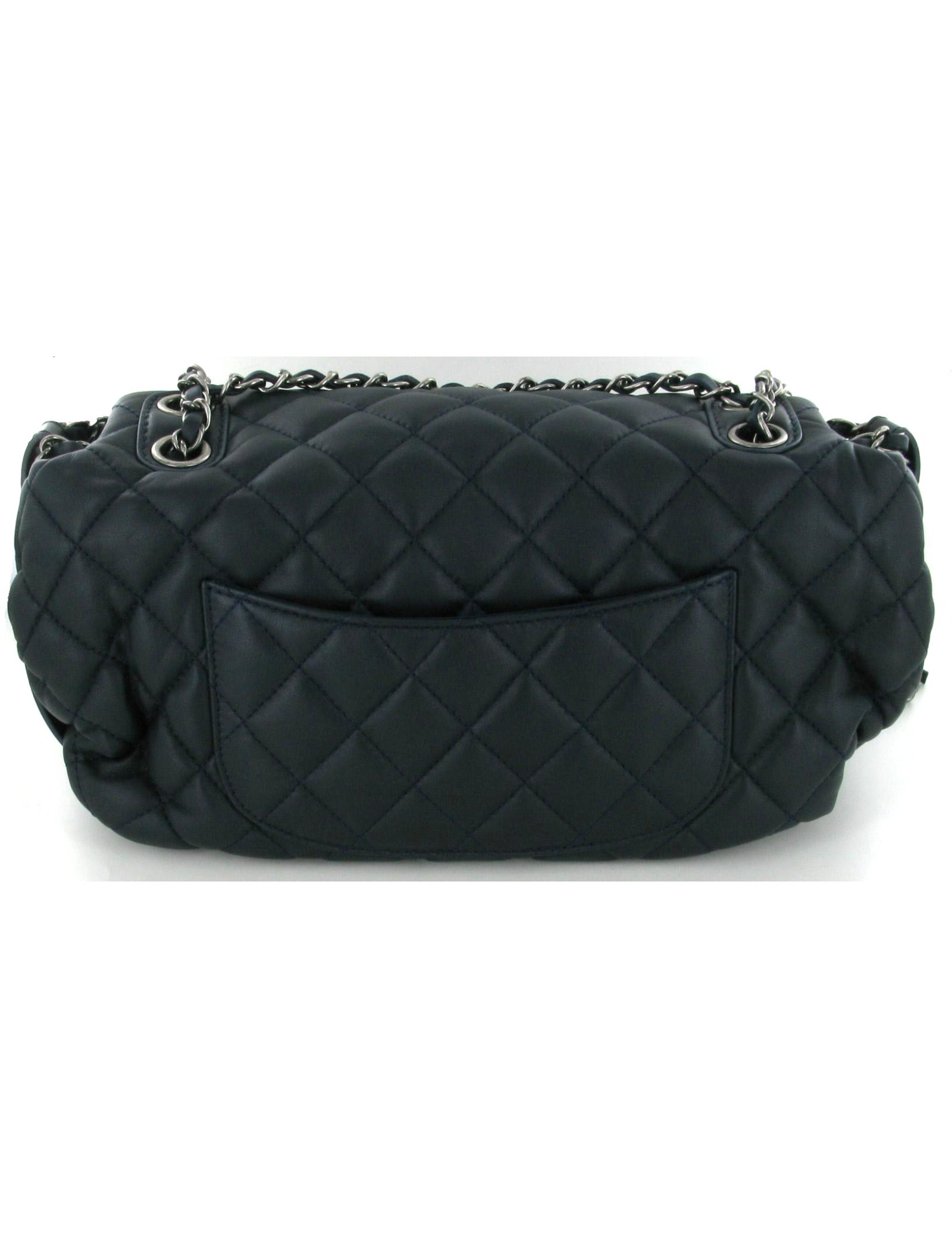 CHANEL bag in rabat blue quilted calfskin leather matte dark oil, with silver chain aged, aged silver double clasp CC. This bag is very trend and functional. Worn on the shoulder or across the body, it has a flat outdoors, a large zipped Pocket pouch and two flat pockets on the inside. Made in Italy. This new bag is sold with a card of authenticity. Hologram 18..., year 2013. Sold in his dustbag.