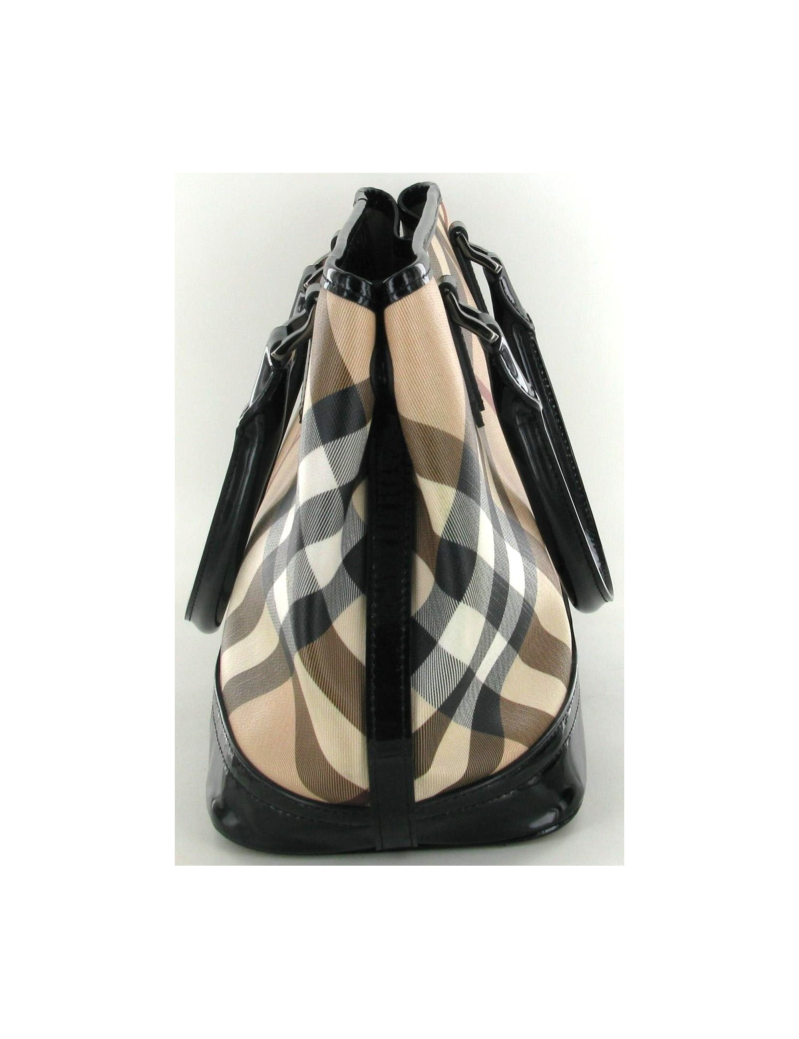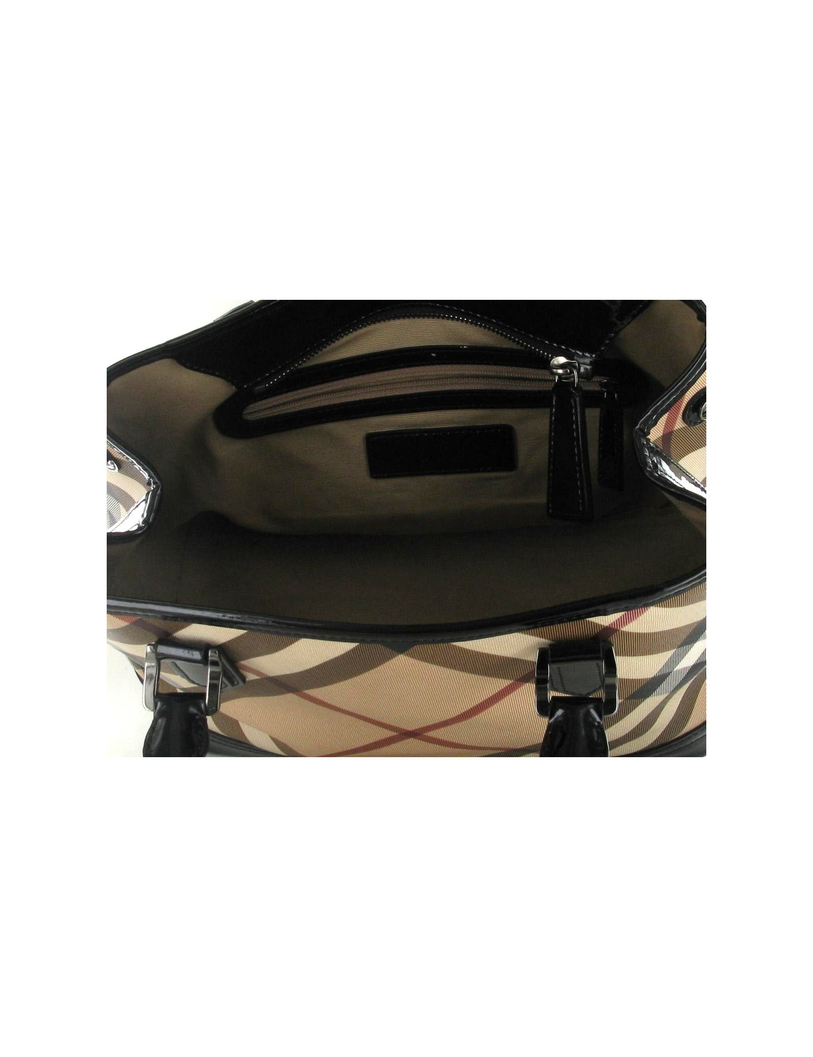Bag BURBERRY house check. This bag, became a classic of the Burberry House, is very functional. The bag is feme using a zipper. The monogrammee canvas is decorated pretty misregistration Black patent leather. Each side of the bag, pressure buttons allow to give a different shape to the bag. Very little worn, this bag is in very good condition. Inside, there is a large Pocket zipped and two flat pockets. Sold with its original dustbag.
