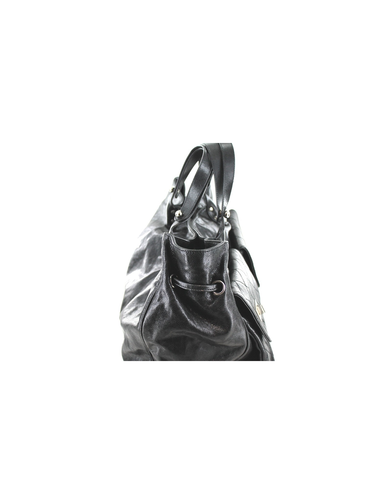 Big bag CHANEL tote bag with double-pockets in glossy black grained leather and silver metal. The two large pockets on the front of the bag in quilted leather and feature mythical 2.55 silver metal clasps. This bag opens and closes with a press Stud magnet. The intereirue of the bag lining is satin grey, very refined. Inside, a leather loop with a carabiner allows you to hang your keys or your wallet. Very nice silver acronyms CC on the handles buttons. Signs of wear on the seams of the handles. Hologram 12..., year 2008-09. Made in Italy. This bag is sold with its original dustbag.