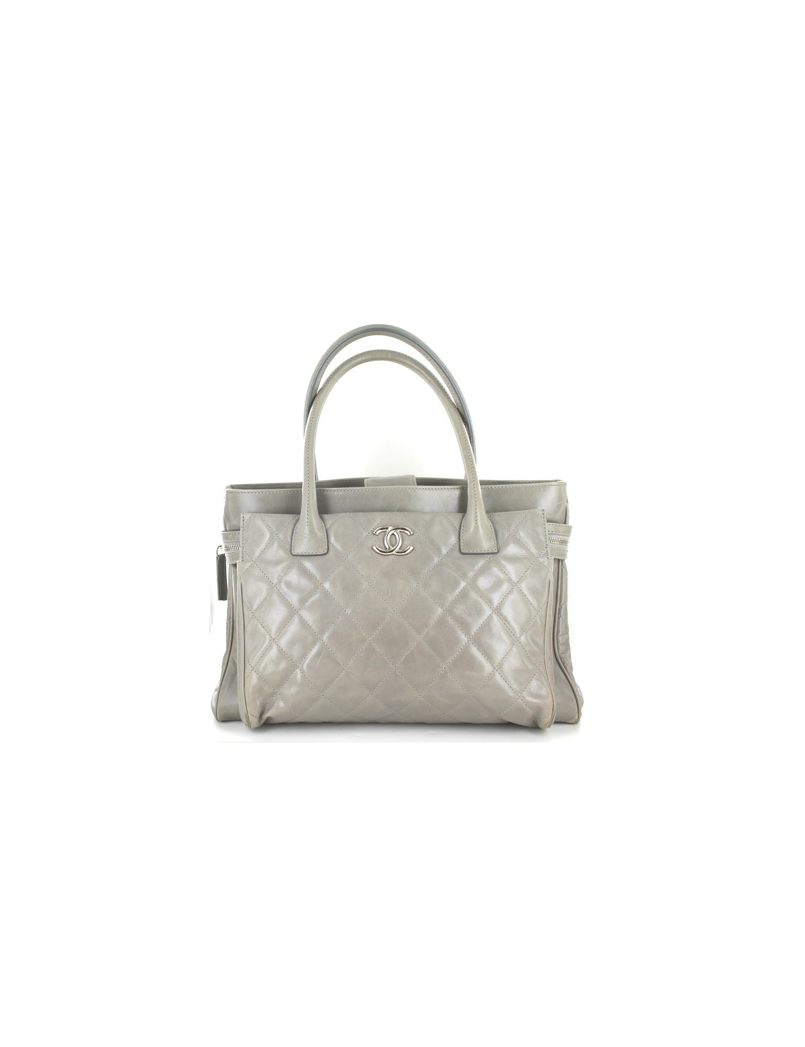 CHANEL large bag grey smooth lambskin leather, in very good condition. It was created in a very rare grey leather. Very functional, the bag features plenty of storage: a large central pocket closed by a flange with a press Stud magnet, a large flat pocket on the back, a large pocket on the front with a zipper that attaches along each side of the bag. Grey fabric interior lining. This bag is sold with its original dustbag, as well as his authenticity card. Hologram 12, year 2008-09. A few scratches and wear on the bottom and corners of the bag. Made in Italy.