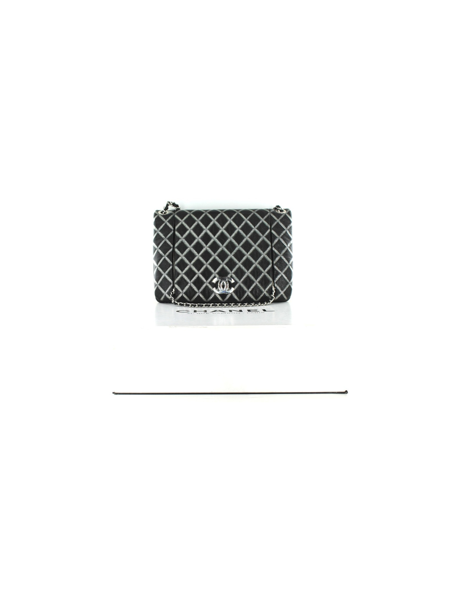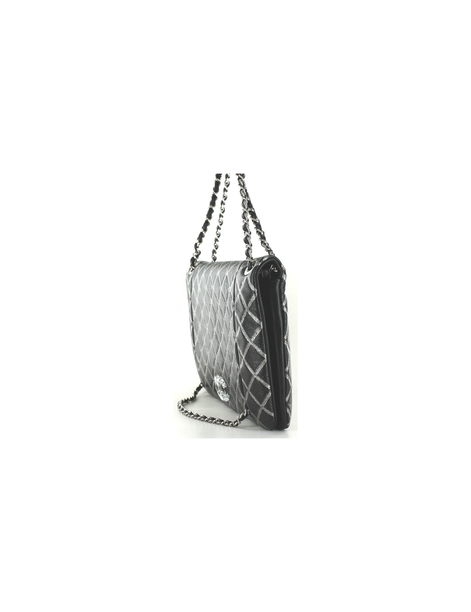 Bag CHANEL quilted black smooth leather and silver sequins and silver chains. Signature white Crystal CC. On the front, one chained to open two pockets by zippers. The bag is closed by a press Stud magnet. The bag has inside two large flat zip pockets. Silk inner lining grey. Hologram 14..., year 2011. Made in Italy. This bag nine comes with the dustbag and box Chanel.