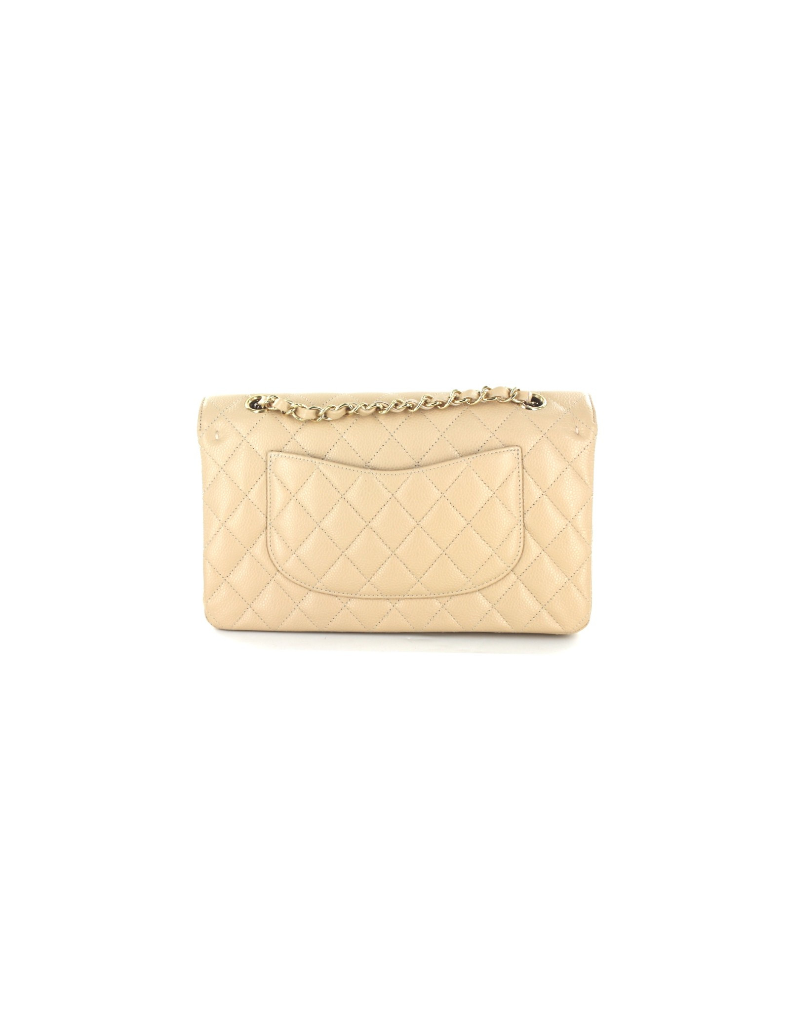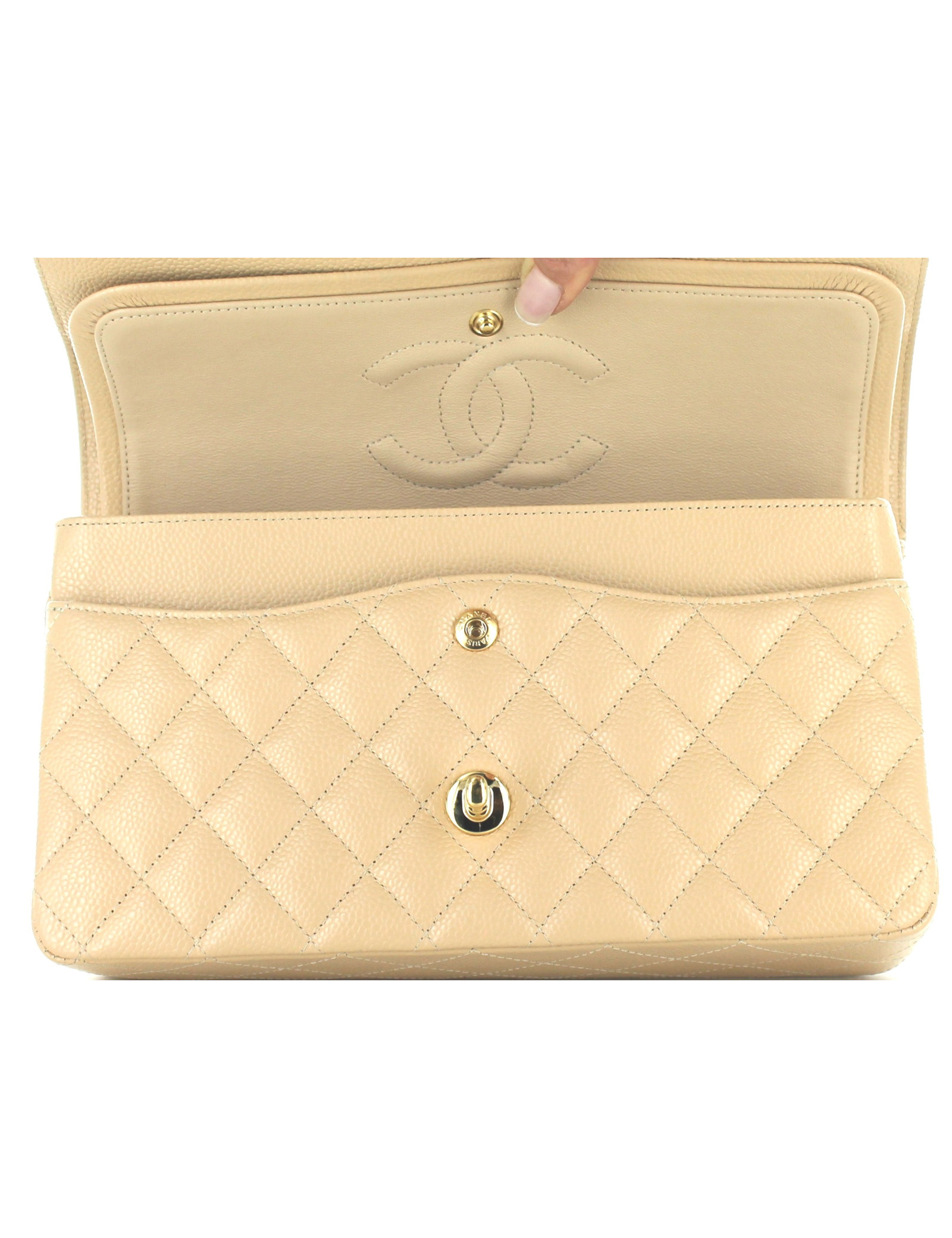 Timeless CHANEL caviar (grained calf) leather beige and Golden jewellery, double flap. Bag mythical and unavoidable for the Couture House. Inside, a large and two small flat pockets. Outside a flat pocket. This new bag is sold with its original dustbag. "S" of the balances. Hologram 17...