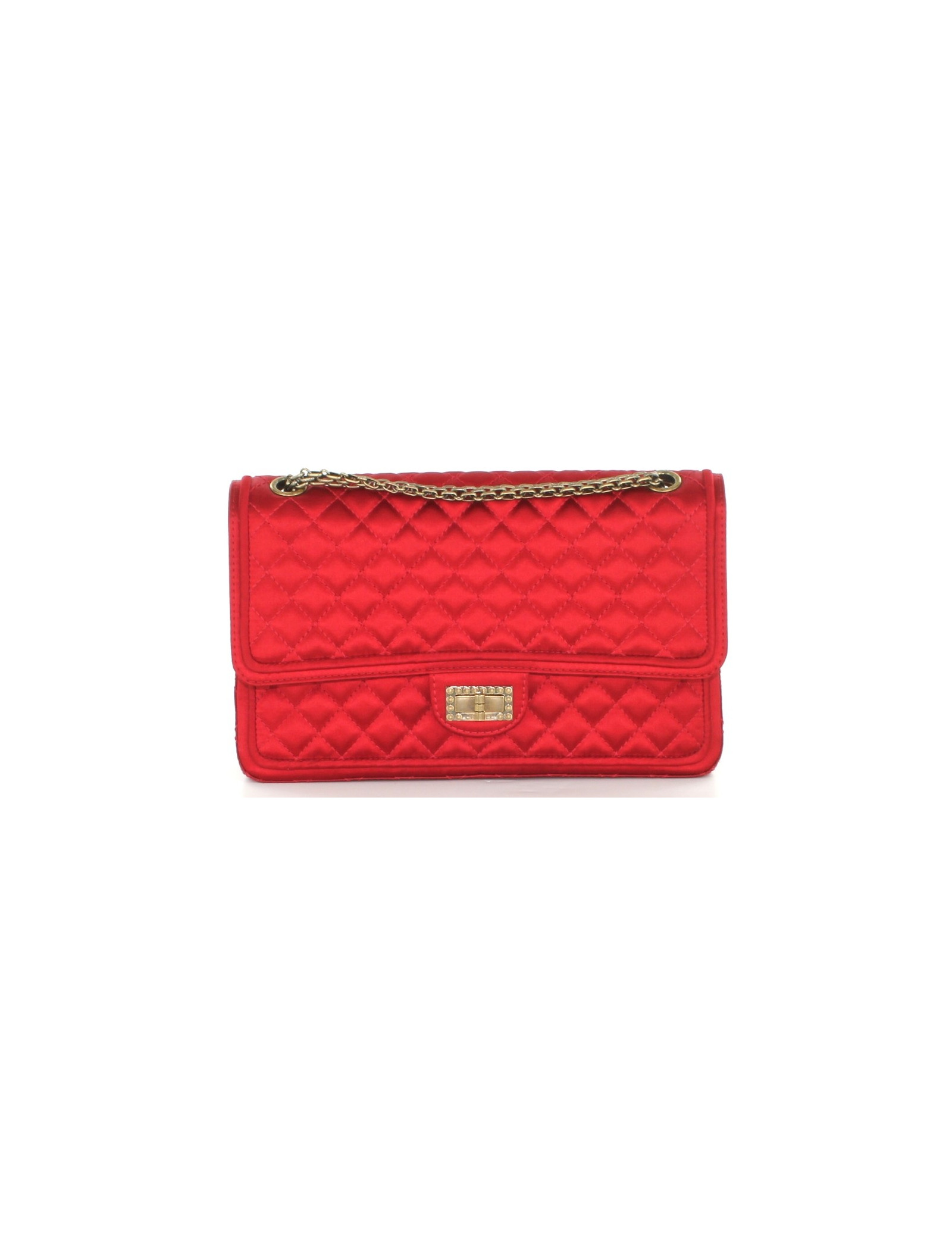 2.55 CHANEL quilted Red satin and chain bronze. Double nine flap bag. Paris-Moscow collection. Beautiful clasp bronze with embossed details. Inner lining in red fabric. Two flat pockets. "S" of the balances. Made in France.