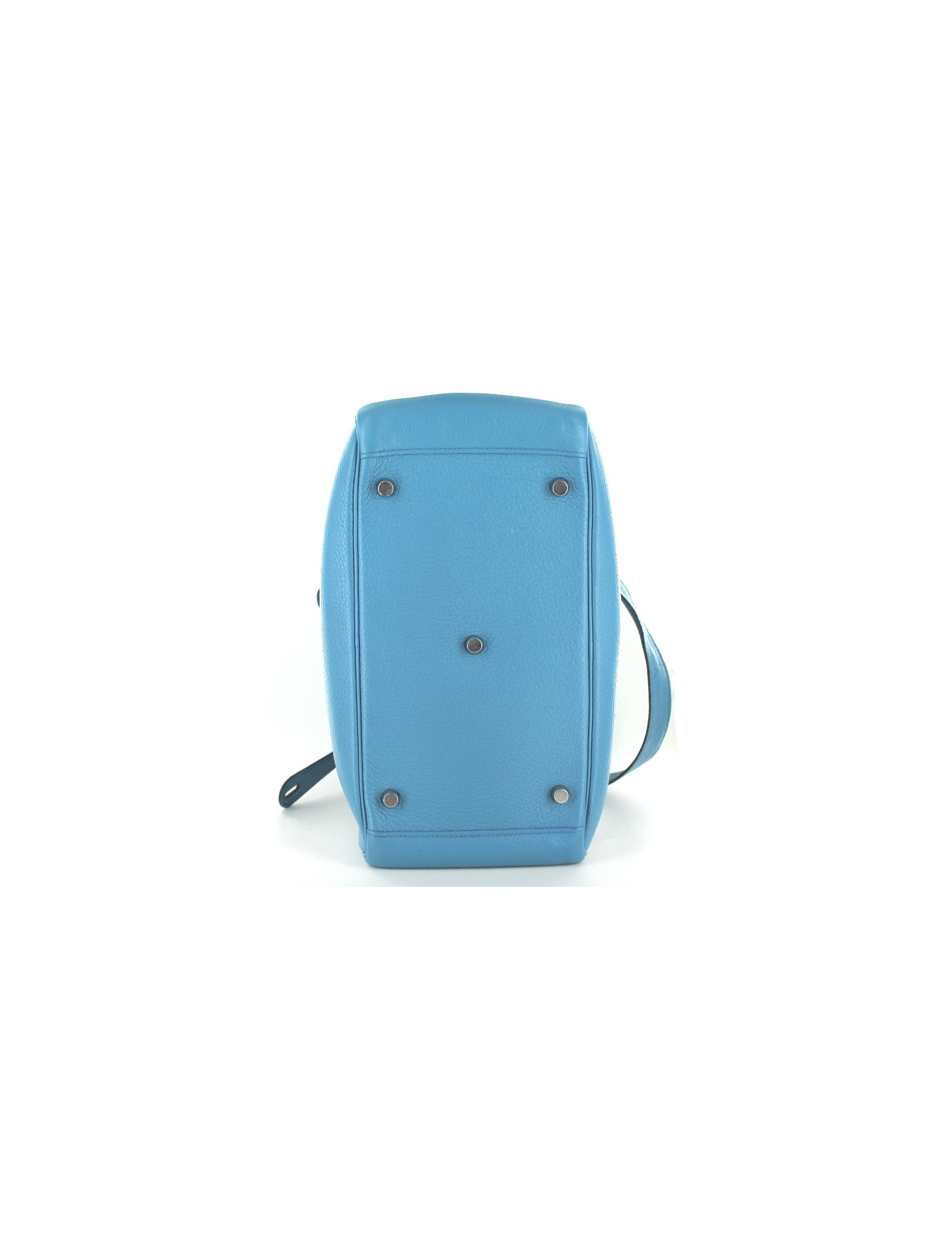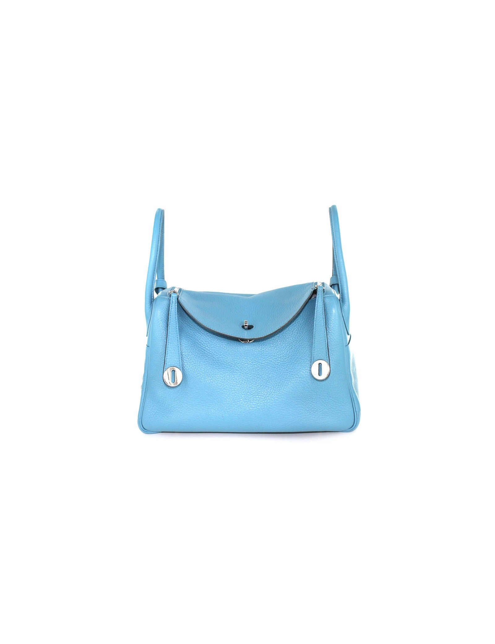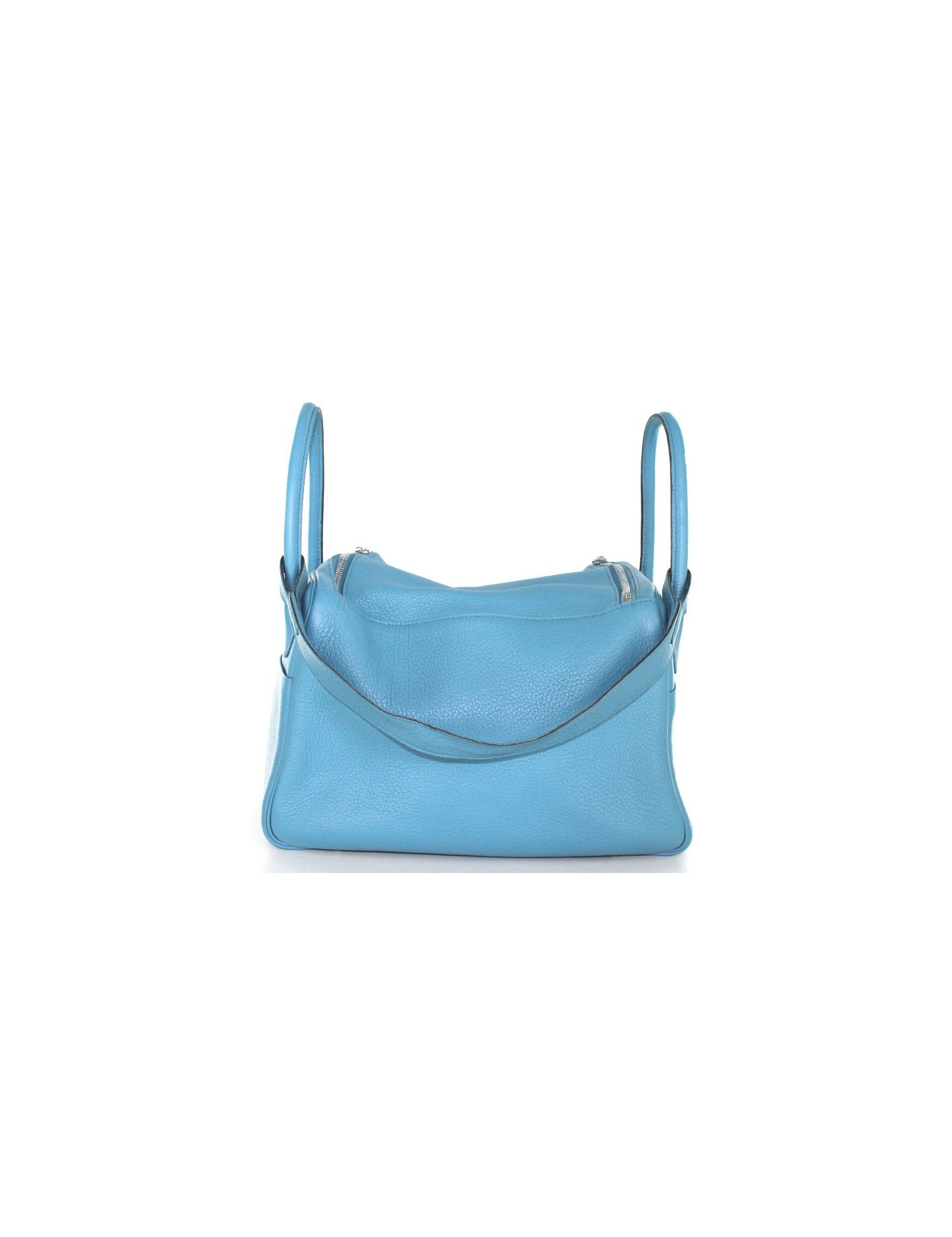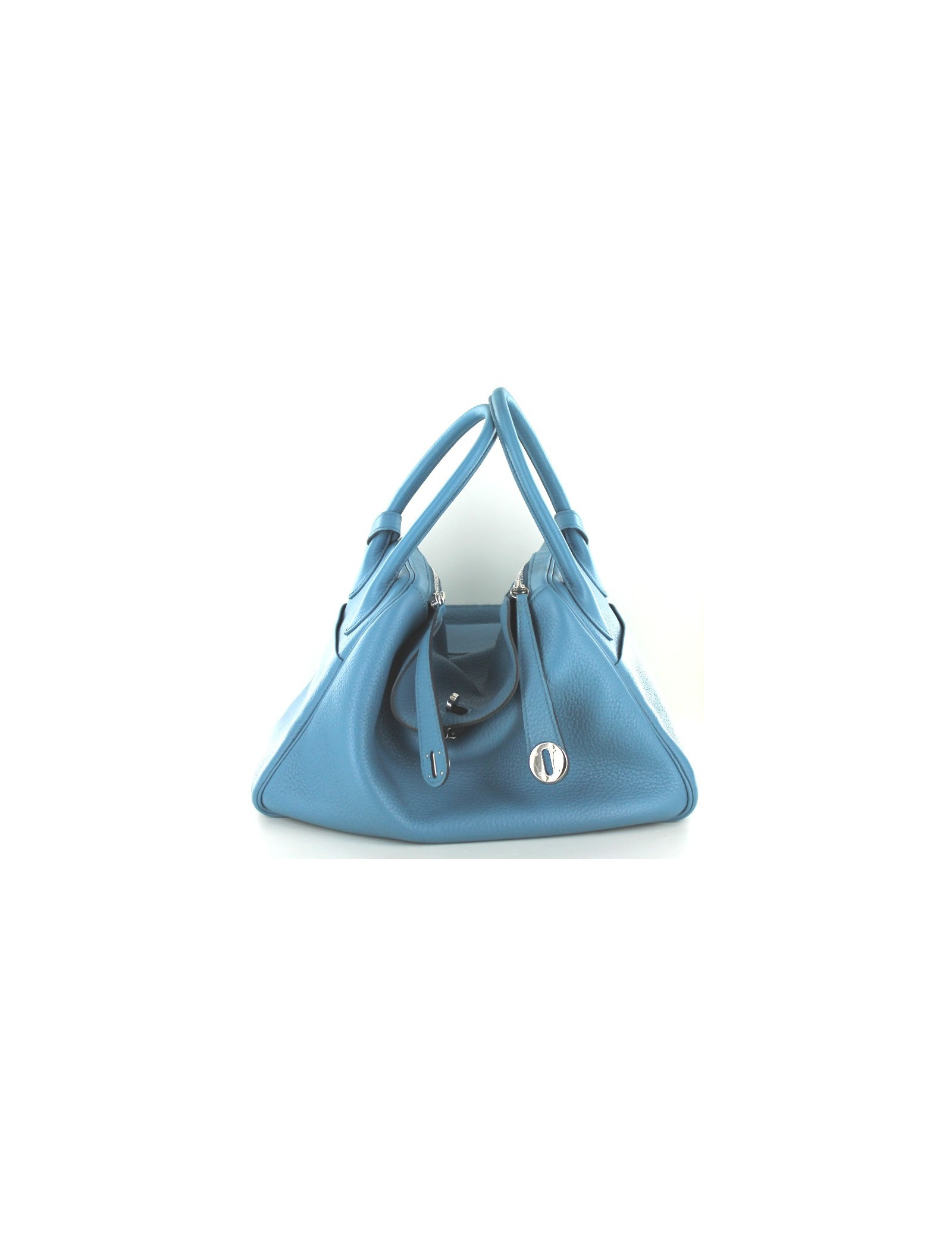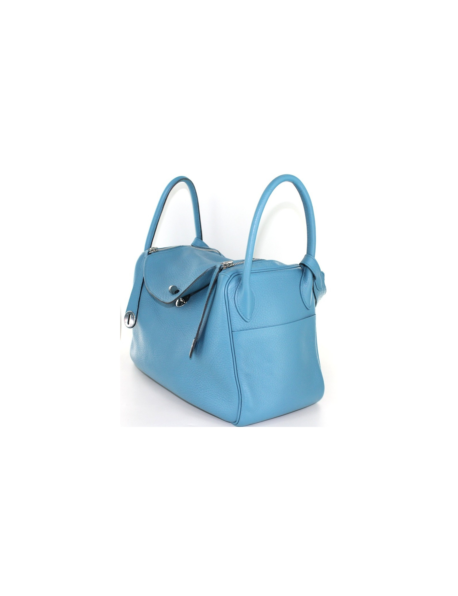 Taurillon clemence leather HERMES LINDY bag blue jean, palladium jewelry. Double zipper closure. Demi-bandouliere and double handle. Two pockets on each side of the bag. The clasp is abbreviation "HERMÈS PARIS". Inside this mythical bag has two flat pockets. This bag has underwent a full renovation treatment of leather. It is therefore in very good condition. On the bottom of the bag, four dots of protection. "HERMÈS PARIS" slightly inscriptions erased by the renovation. Made in France.