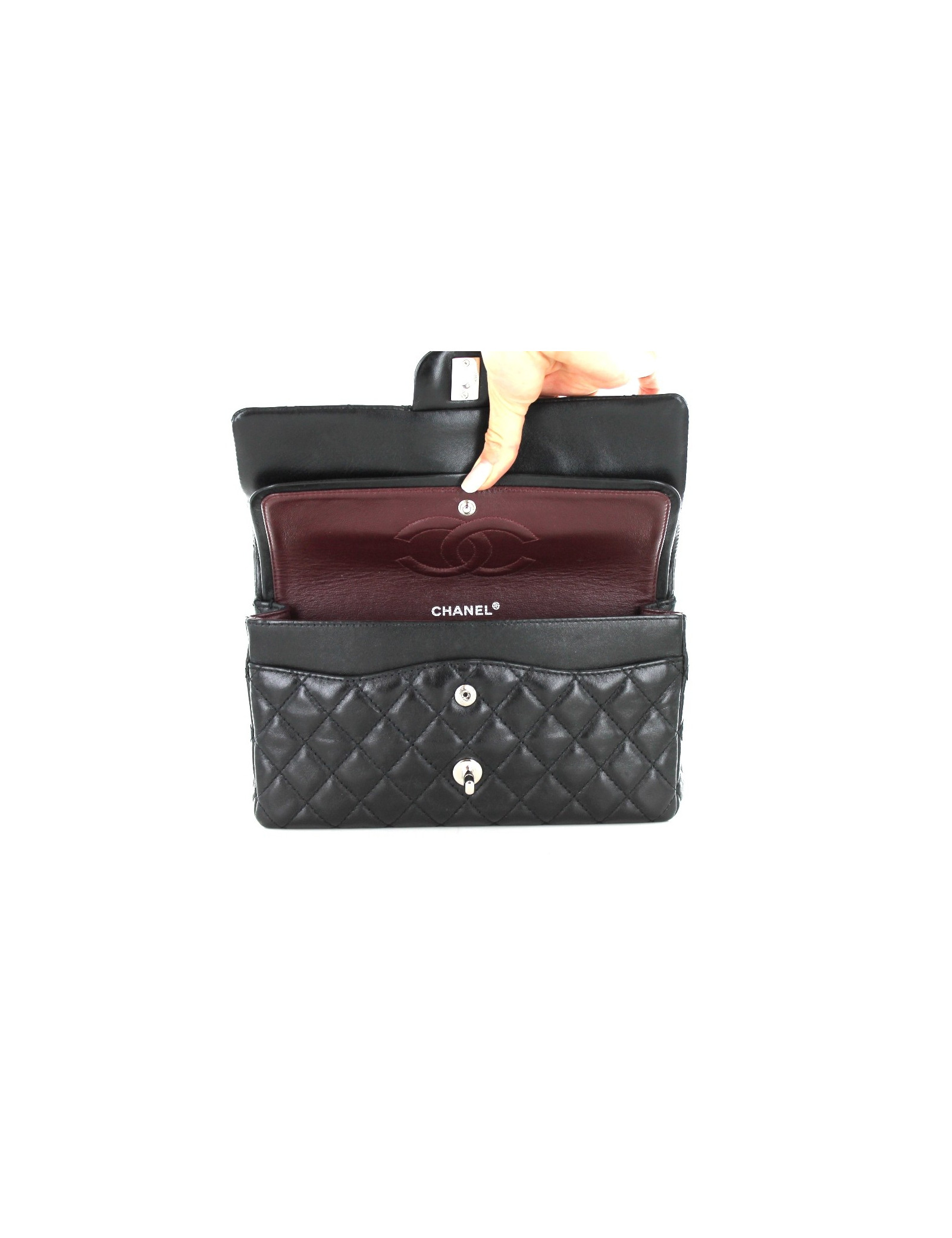 Quilted bag CHANEL TIMELESS double-flap lambskin black leather and silver chain. Timeless piece and incontournbale. This bag black smooth lambskin leather is accented with a clasp and a silver metal chain. Double inner lambskin Burgundy color. A few marks and scratches from wear. Sold with his dustbag. Made in France. Comes from the balances.