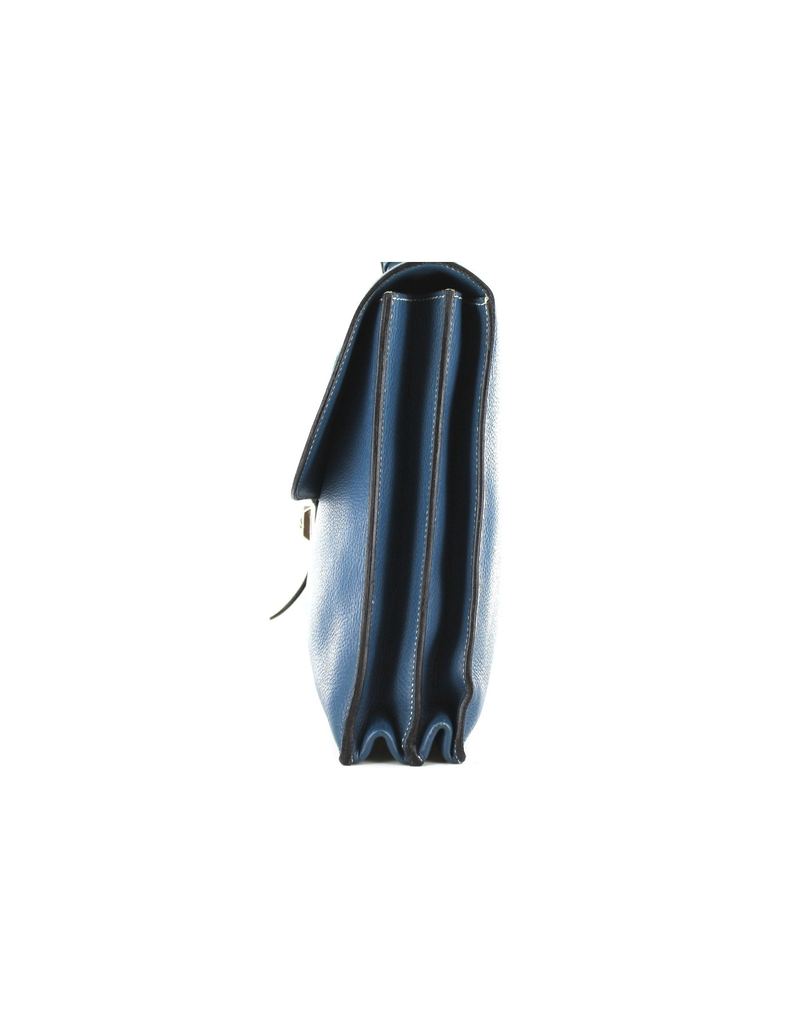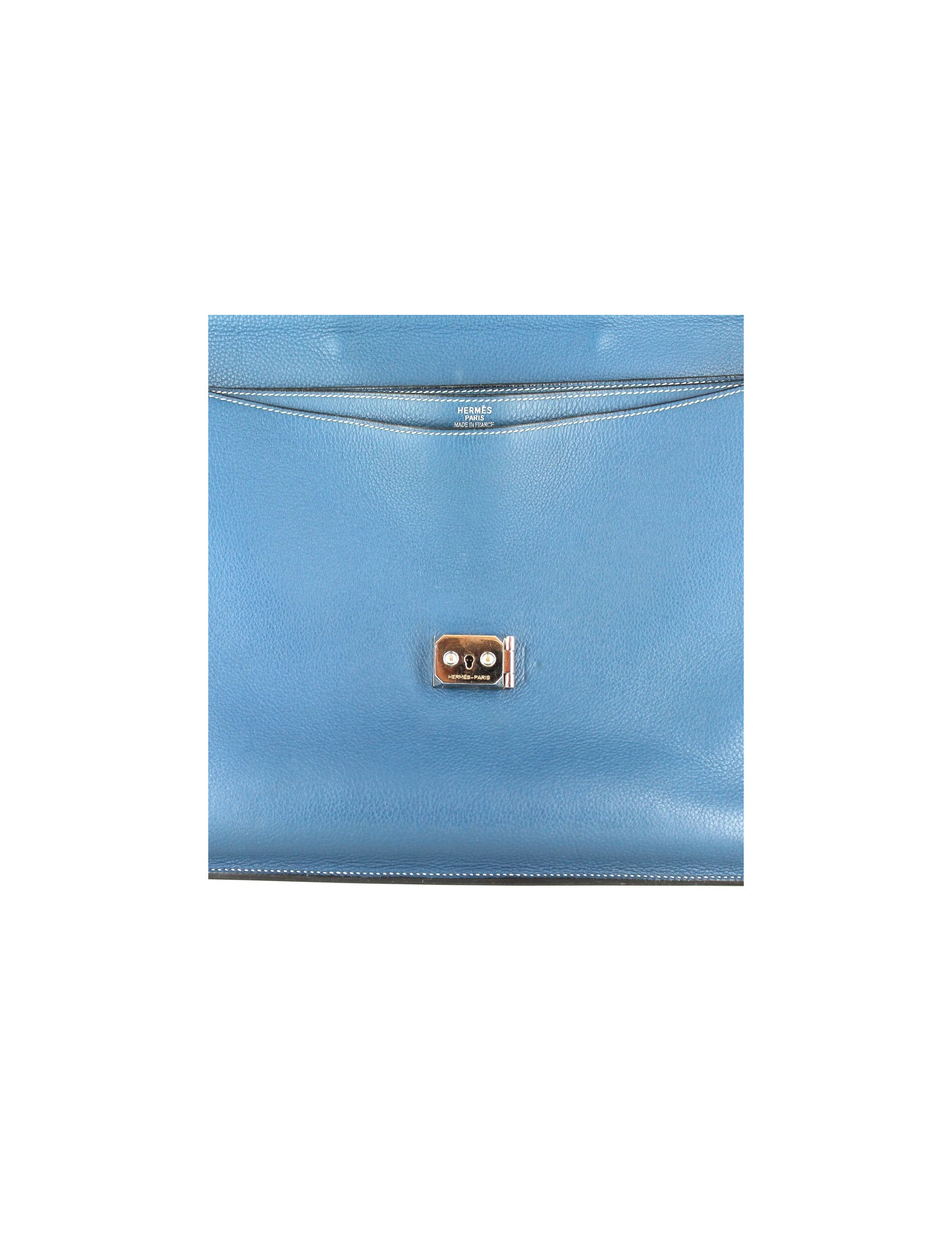 Headlines HERMES blue leather bag. Cream-coloured stitching. Close tab on palladium (close to Vilas) bascule locks. Keys under Bell. "HERMÈS PARIS" signature engraved on the lock. Inside two large bellows, and a large flat pocket. Handle. Small marks and scratches from wear. Sold with a vintage HERMES dustbag.