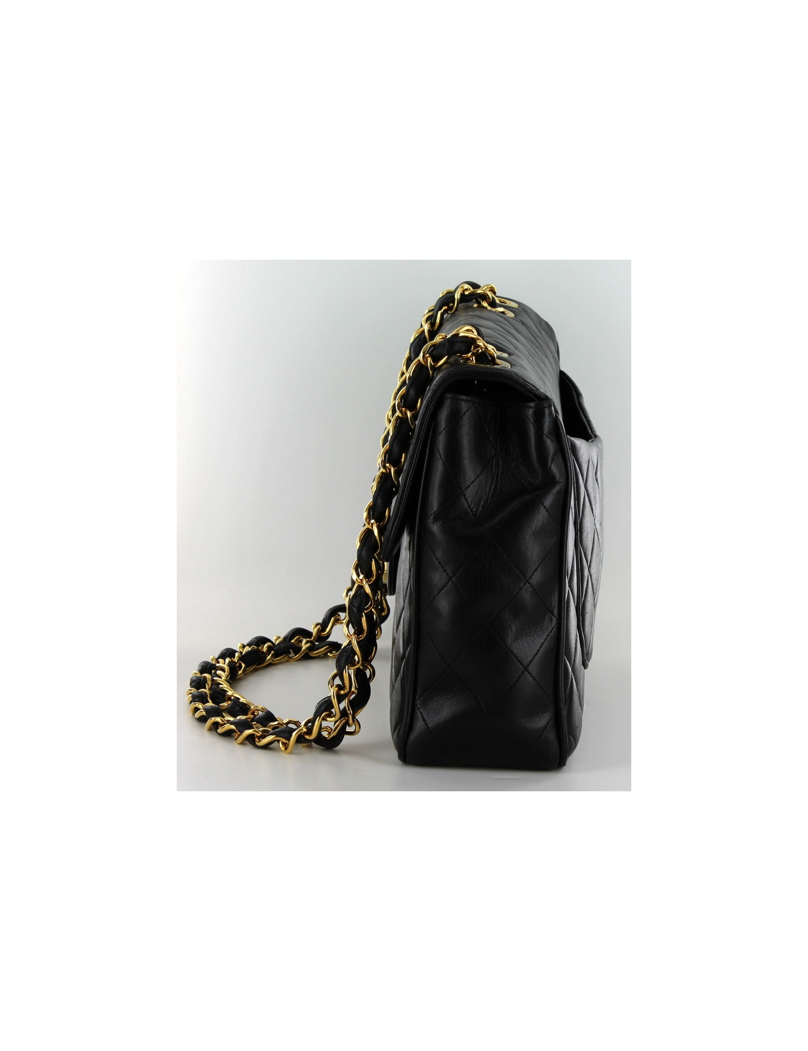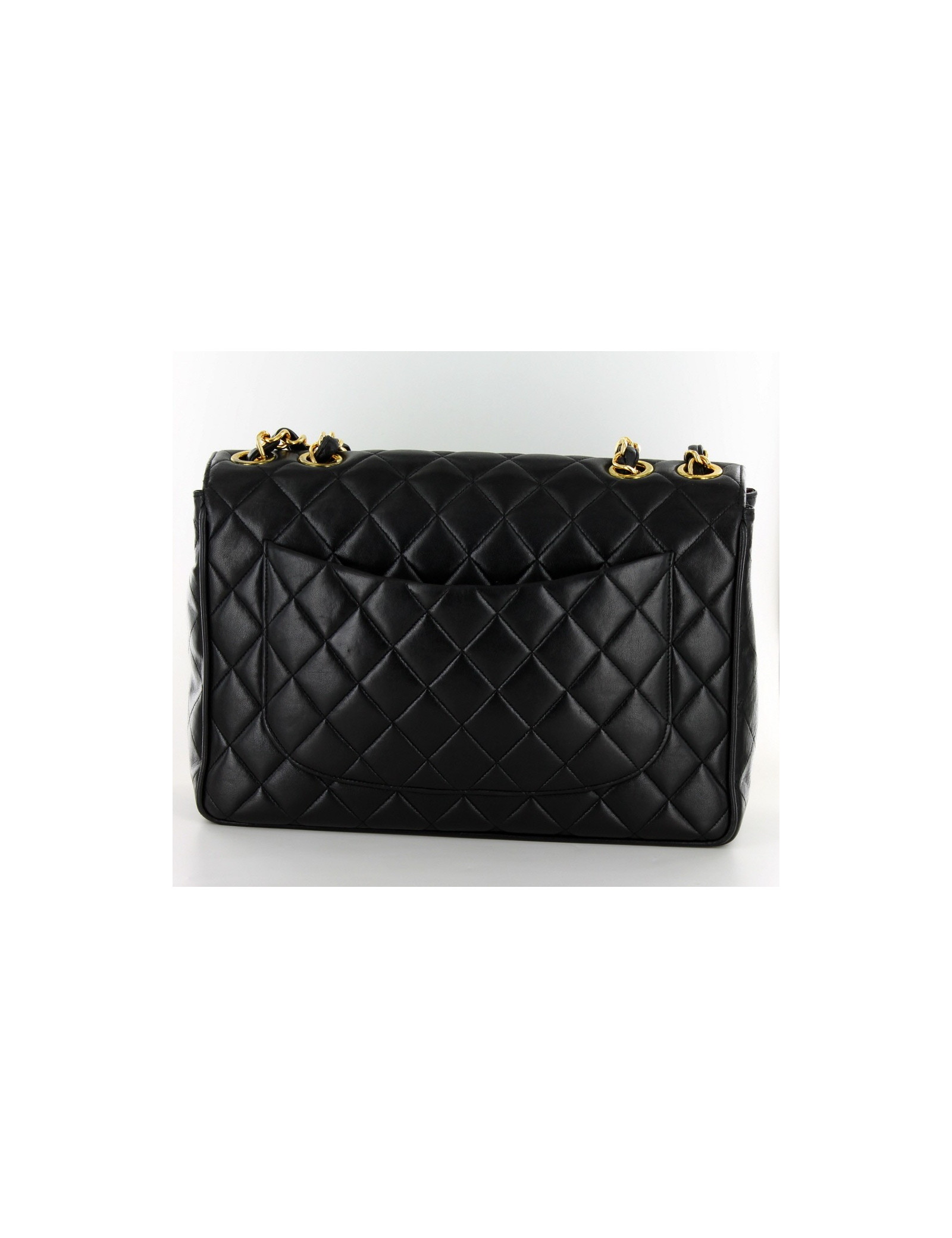 Rare bag of the 1990s, black smooth calfskin CHANEL jumbo maxi and Golden fittings (24-carat gold alloy) with micro scratches.