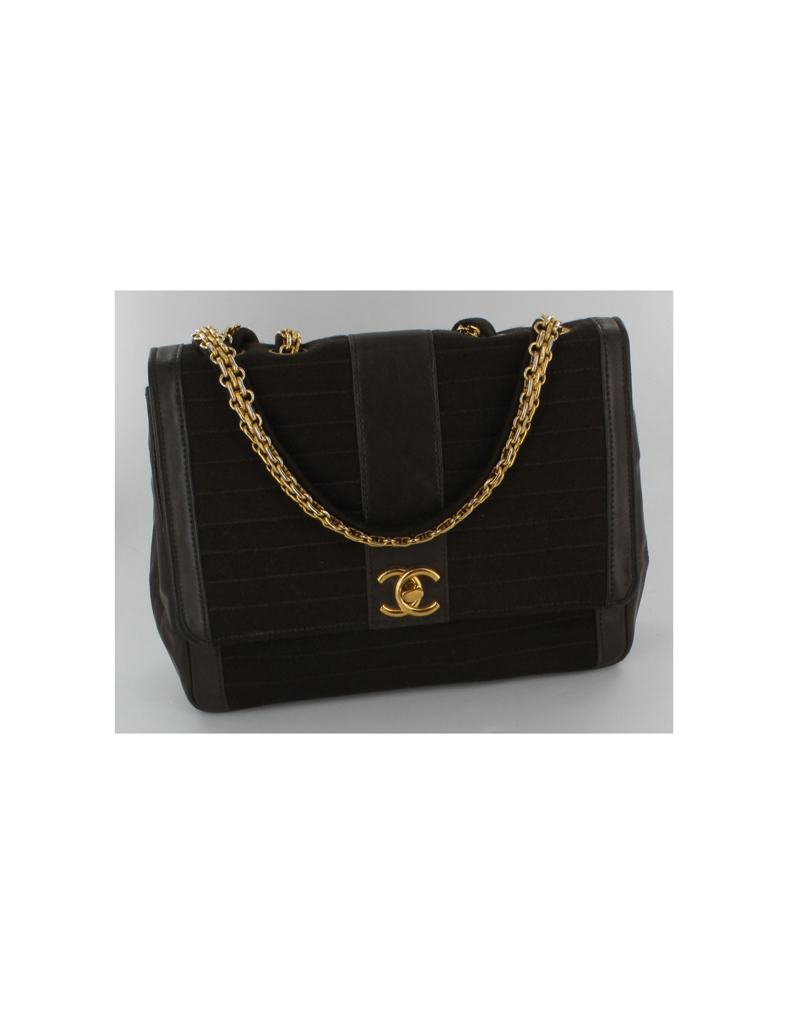 CHANEL vintage Brown, mi mi jersey, leather bag. Golden attributes. A large interior zipped pocket and a large separate two compartments, a pocket on the back and a front pocket.