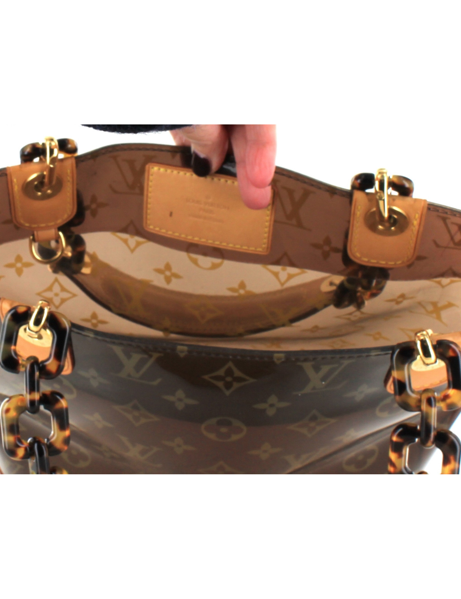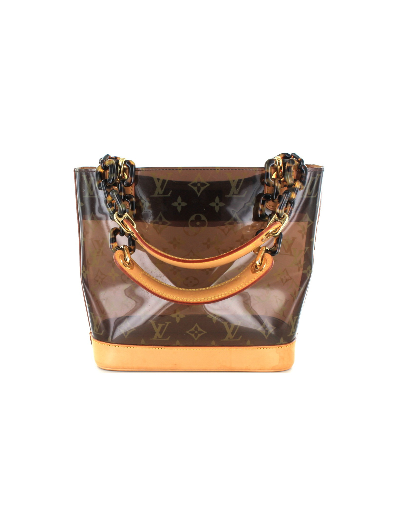 Limited series. Monogram Golden LV LOUIS VUITTON transparent tote bag color amber (a few light scratches on the surface), vinyl. The background is natural cowhide leather. The handles are plastic way tortoiseshell, ending by a wrist reinforced natural cowhide leather.