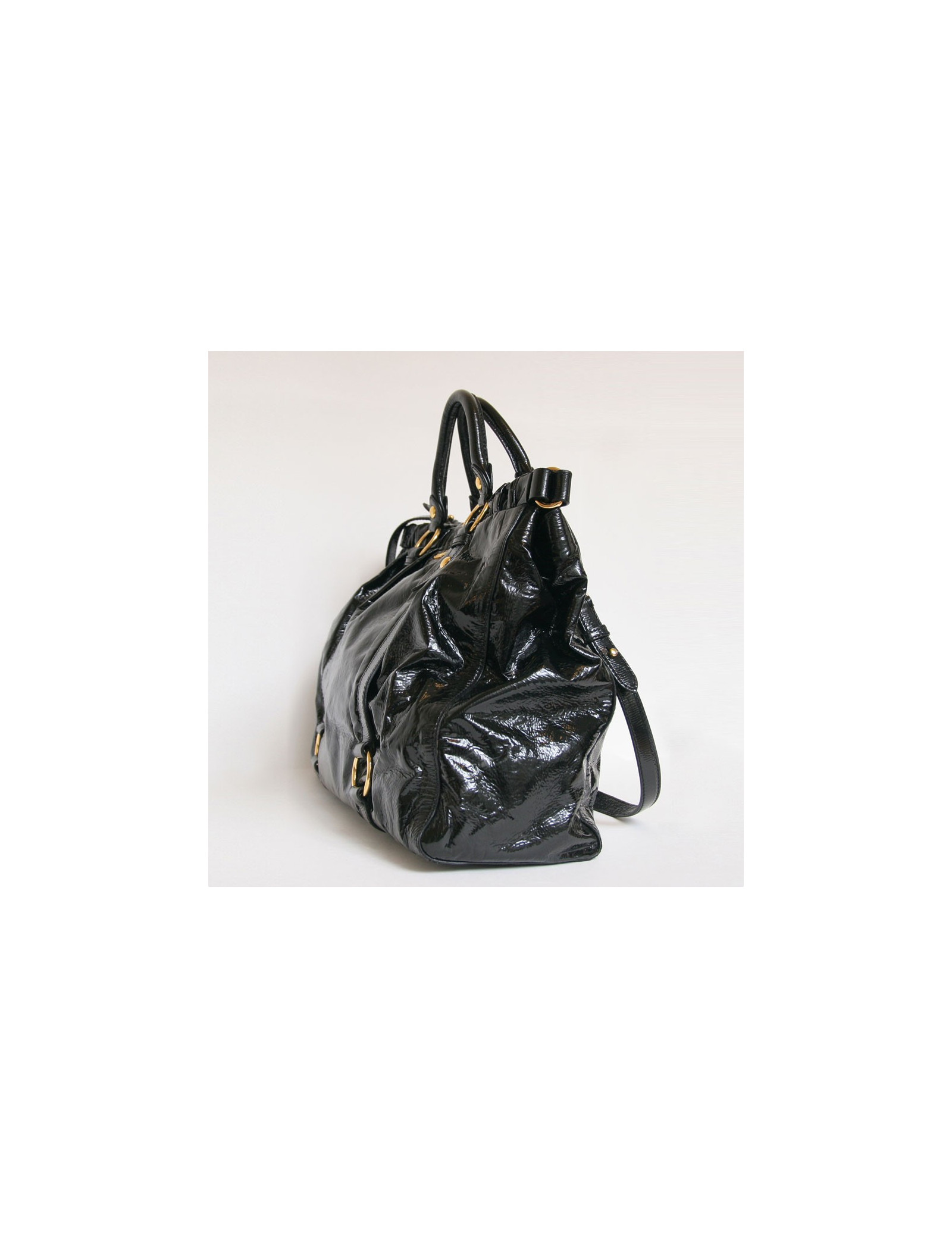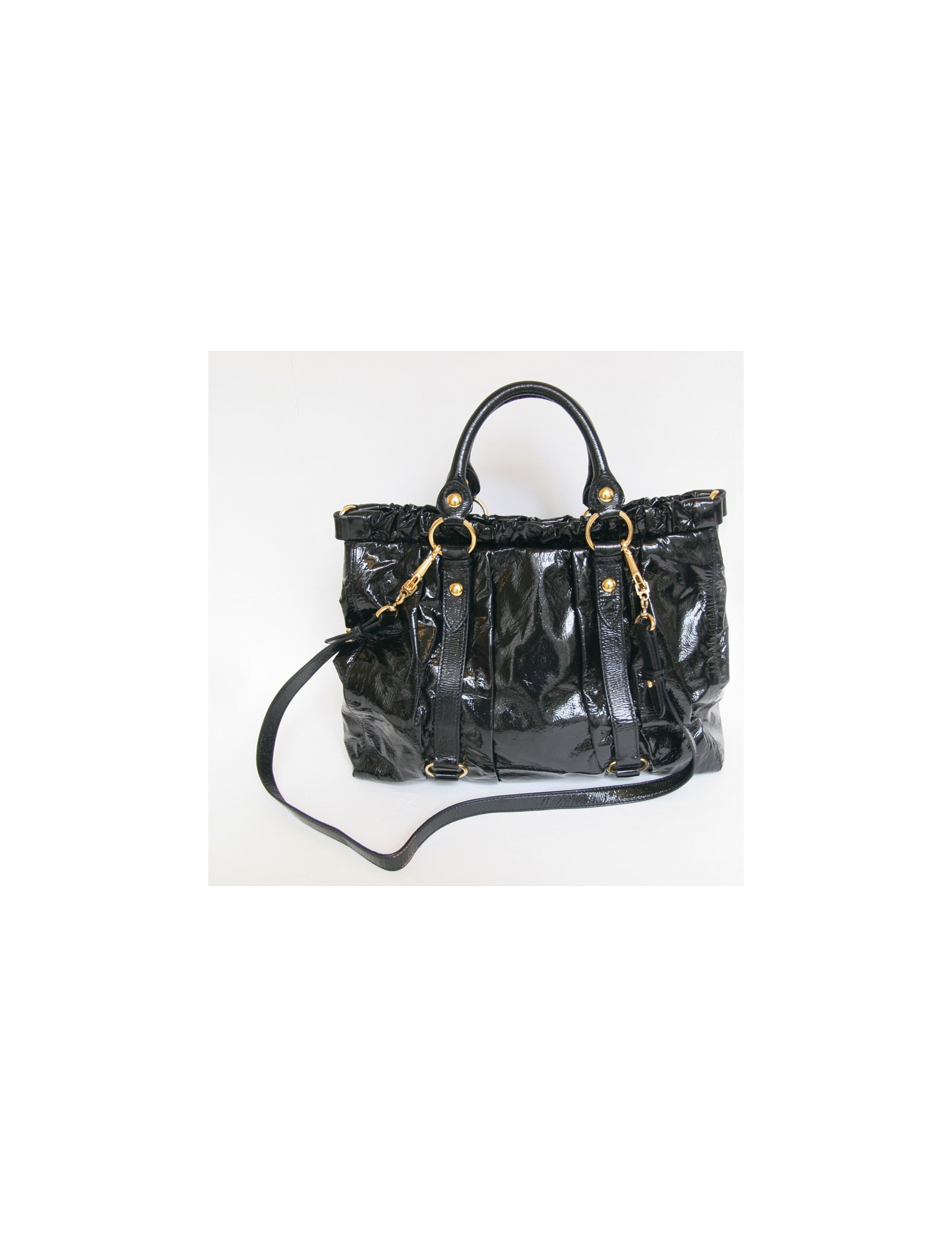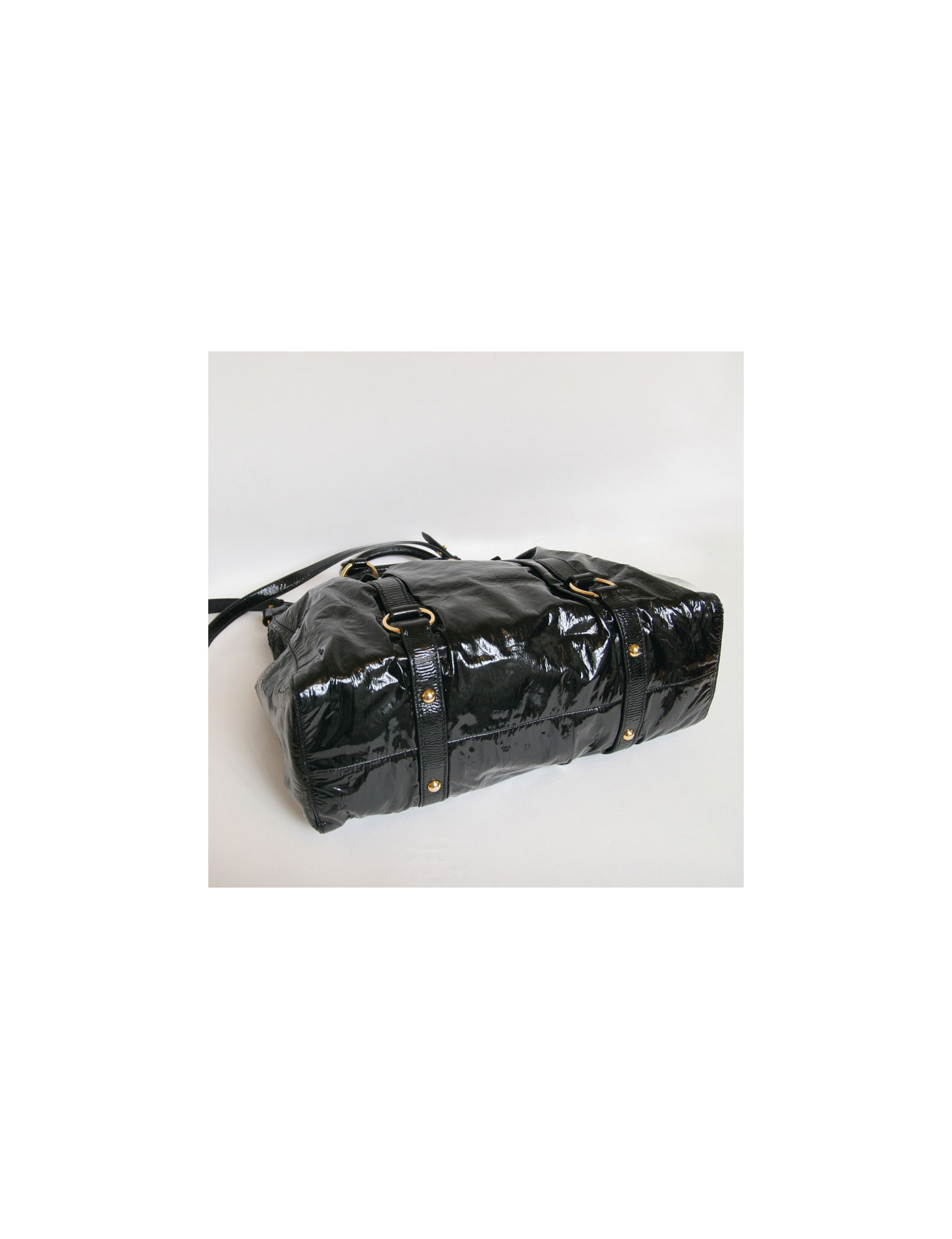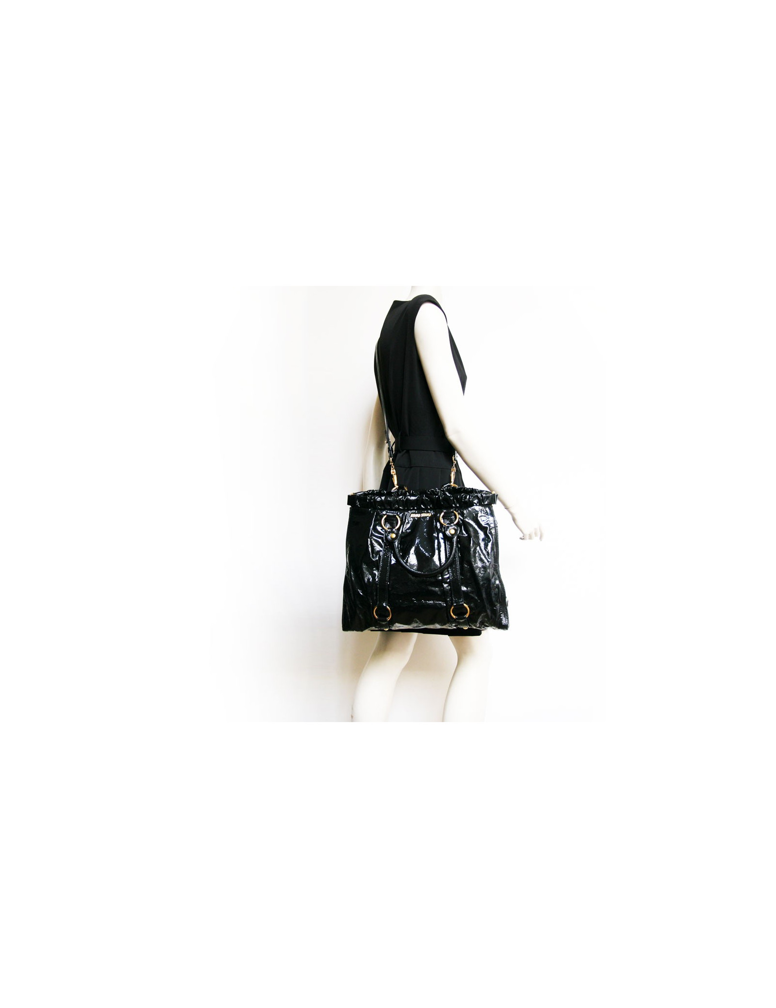 MIU MIU bag very flexible black lacquer decorated with Golden hardware. It goes to the arm and shoulder. The Interior is fabric black and has a zipped pocket.