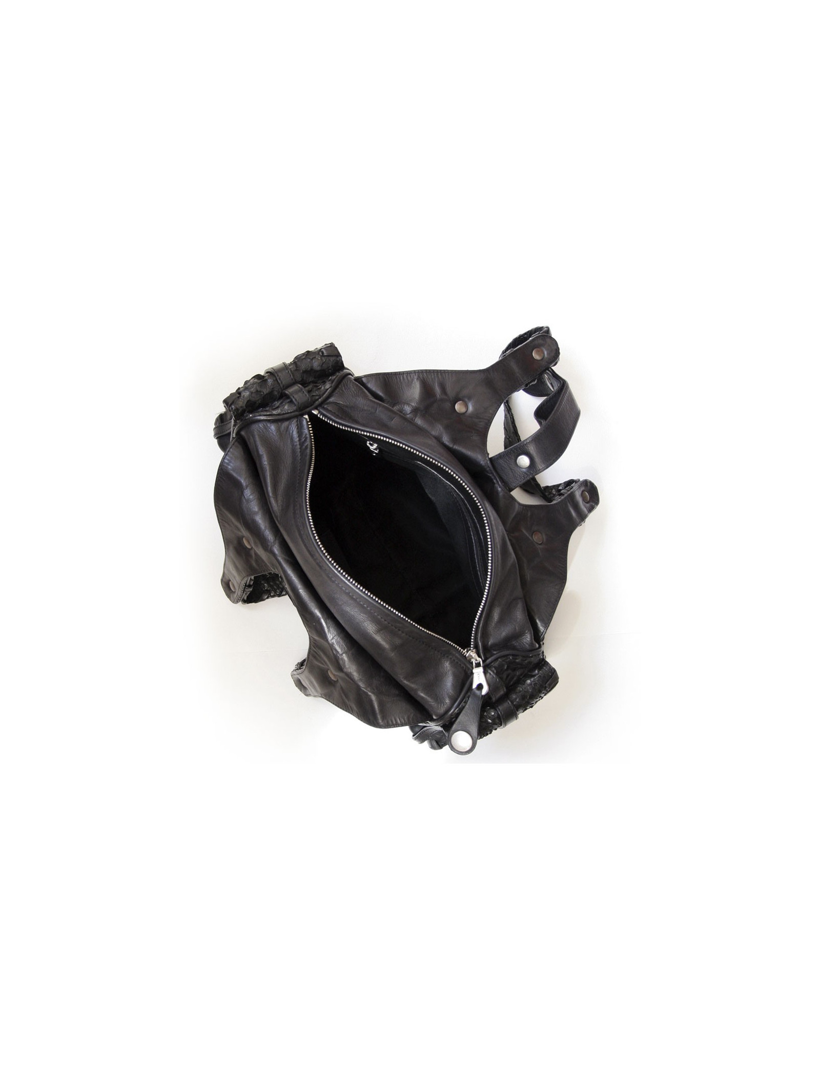 Equipped with a central compartment, it has two small side pockets on the outside. The Interior is black cloth. You will find a zipped and a location for smartphone.The handles are flat and decorated with leather thongs.