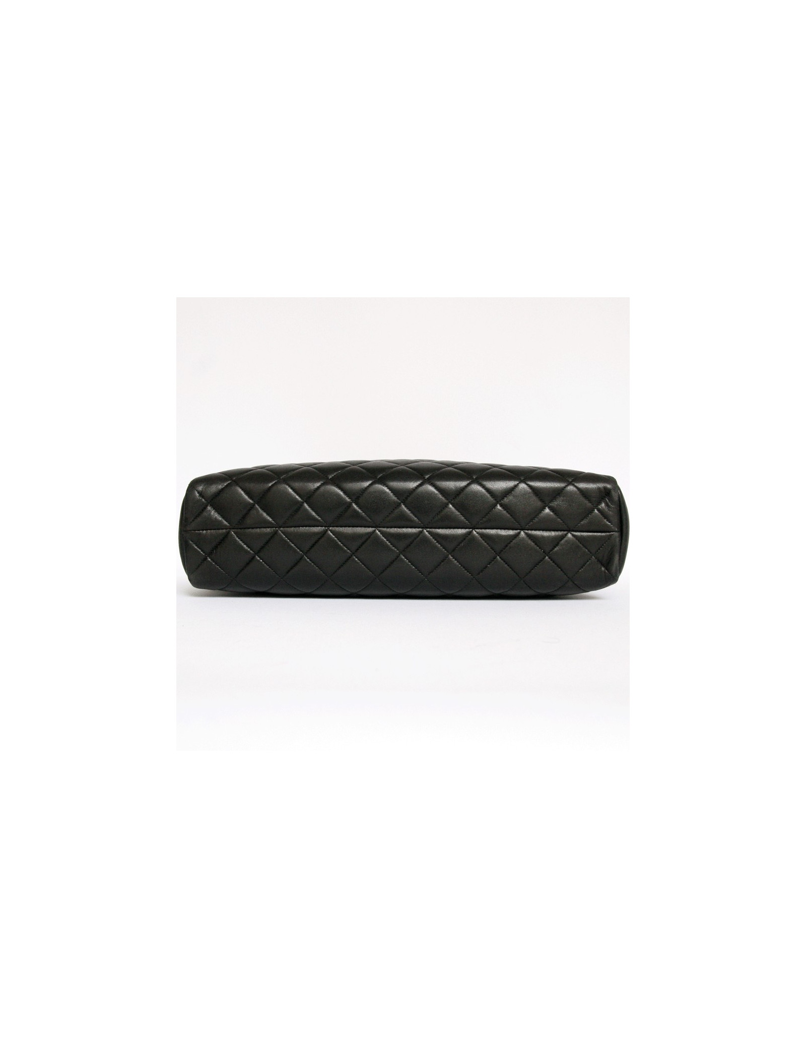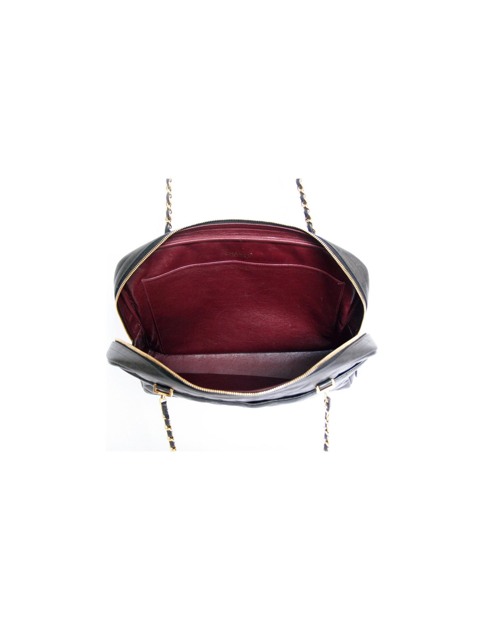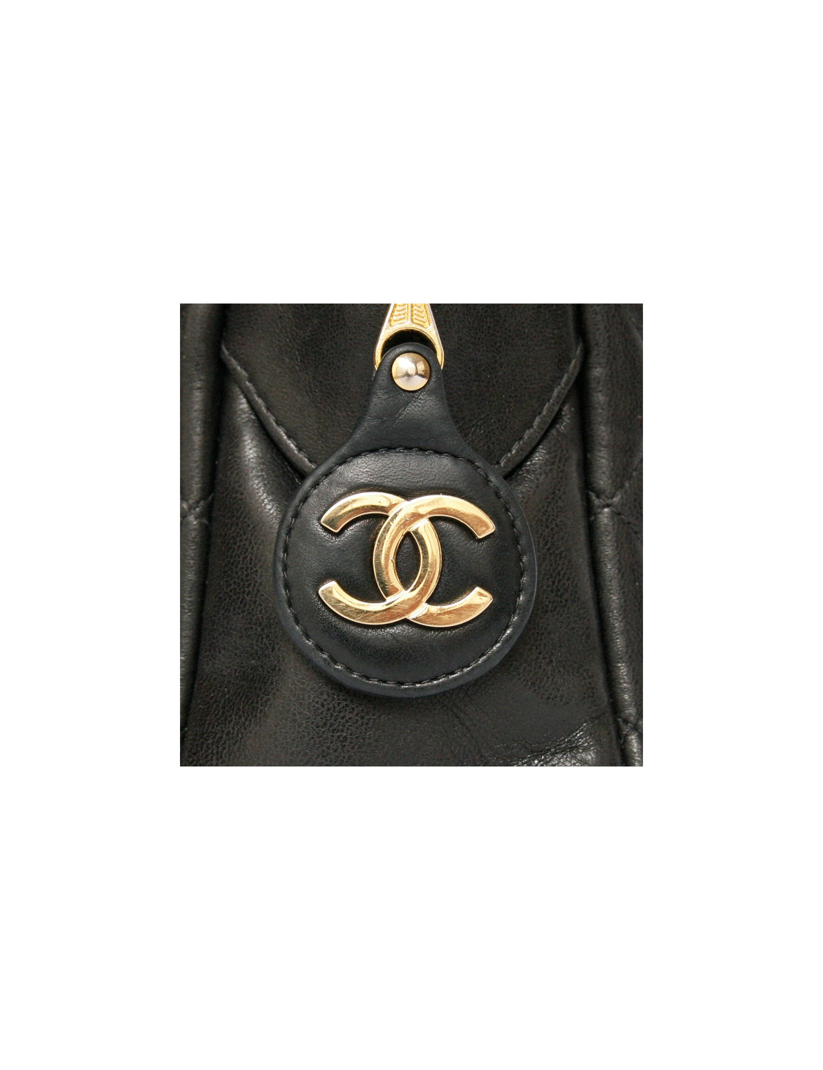 Vintage camera CHANEL black quilted leather bag. It is closed by a zipper that is terminated by a badge the CHANEL symbol coated leather.