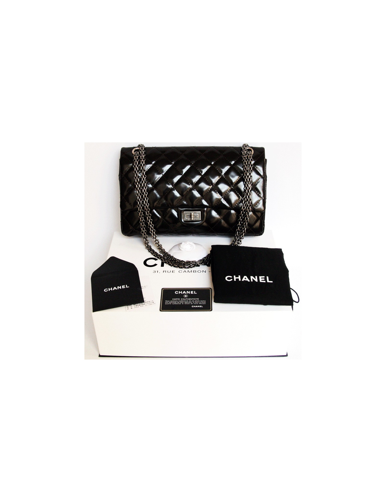 The essential brand Brown patent leather CHANEL 2.55 bag.