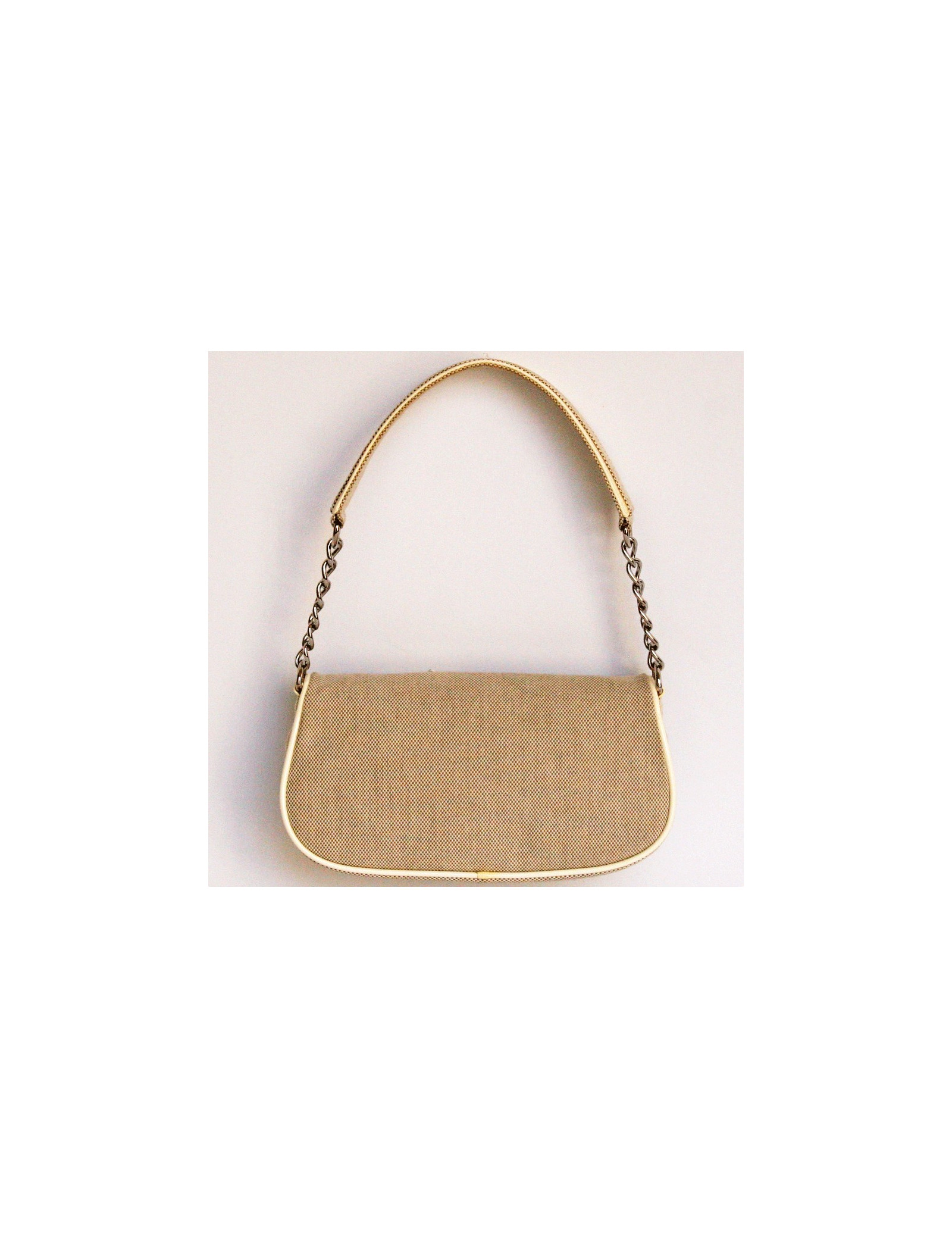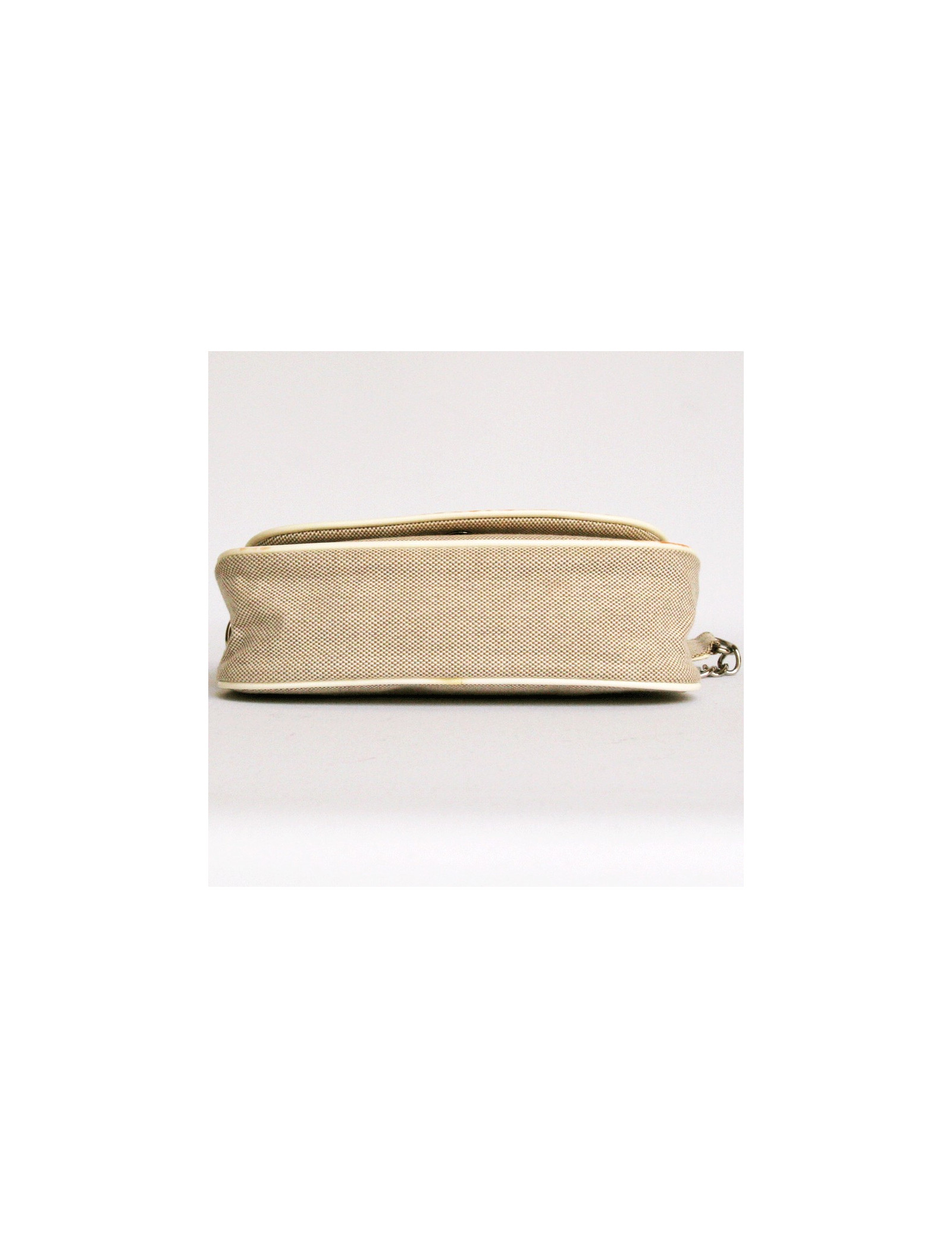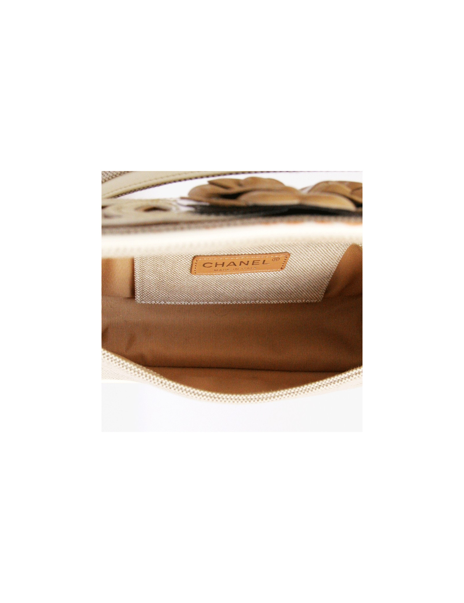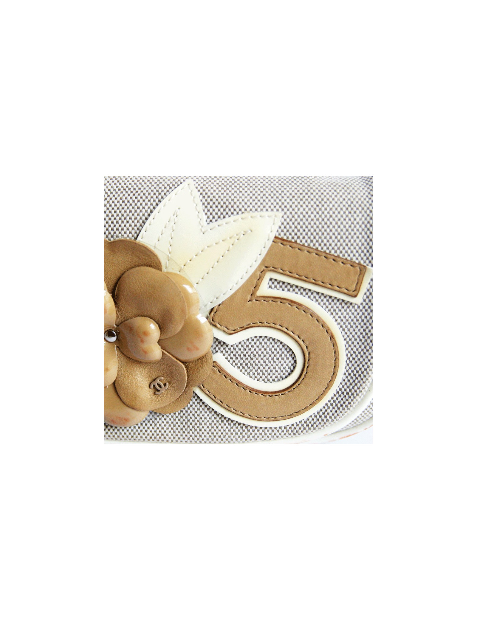 Lovely Chanel bag in canvas and contours of the 2005-2006 collection beige leather. The front of the bag is adorned by the major emblems of the mark the CC, the Camellia and the number 5. It closes using pressure. It fits in the hand or on the shoulder. The handle is leather and silver metal chain. It measures 46 cm. The Interior is beige canvas with a zipped pocket. hologram No. 1033... and authenticity card It is in good condition but unfortunately on the varnished part, there are orange traces on the length in the front. Height: 12.5 cm depth: 6 cm length: 21.5 cm