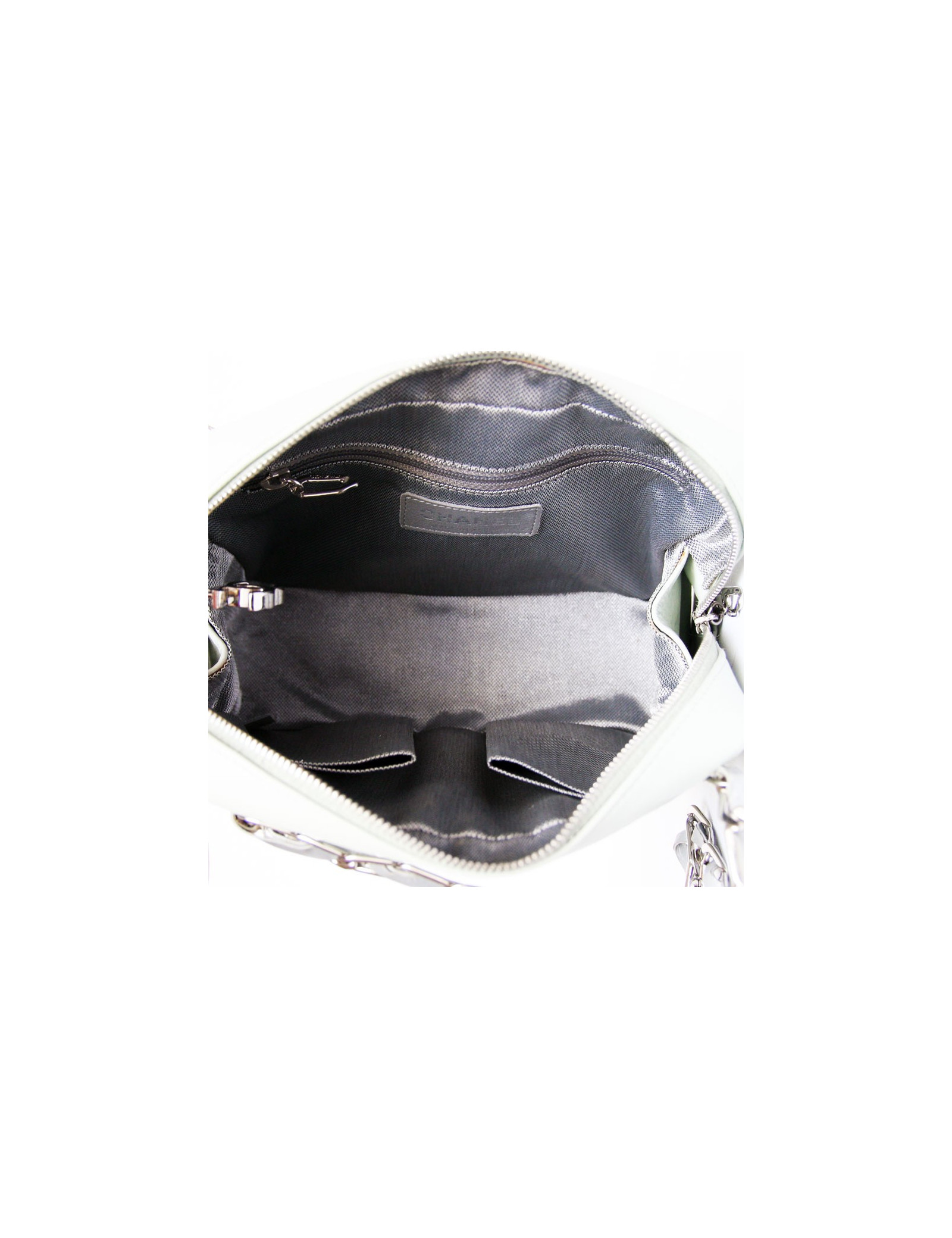 Worn on the shoulder or by hand. It closes with a zip. The interior is in silver colored fabric, 3 pockets, one zipped. 2 flat pockets at the front and back of the bag.
