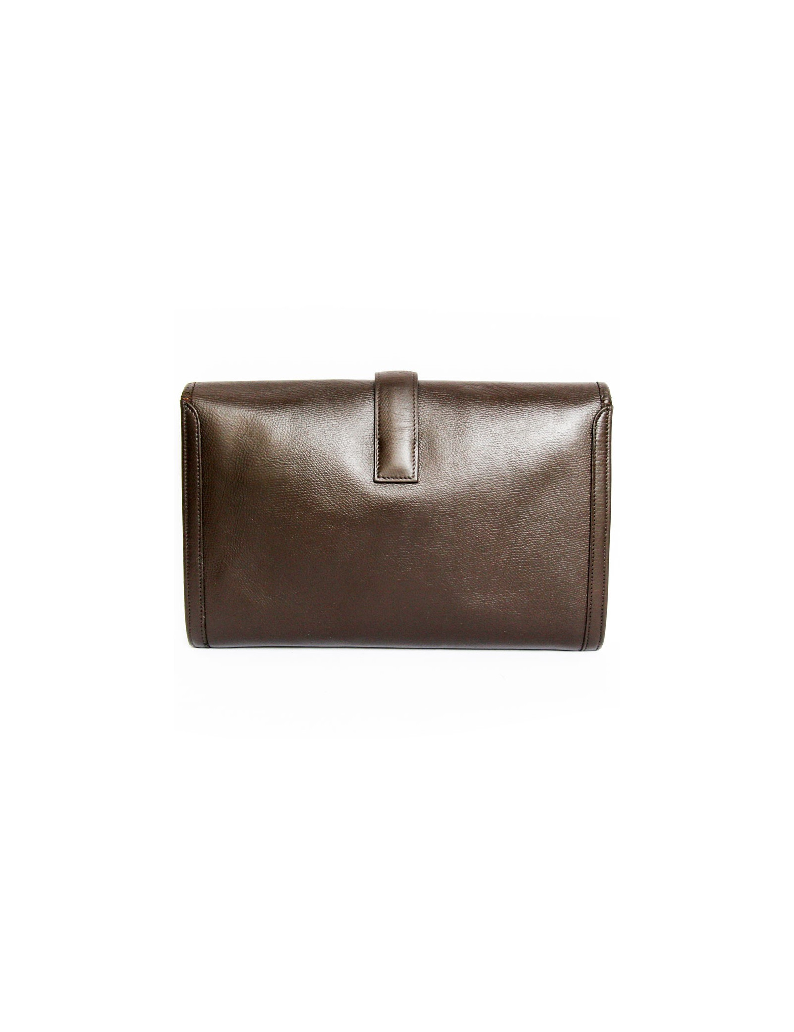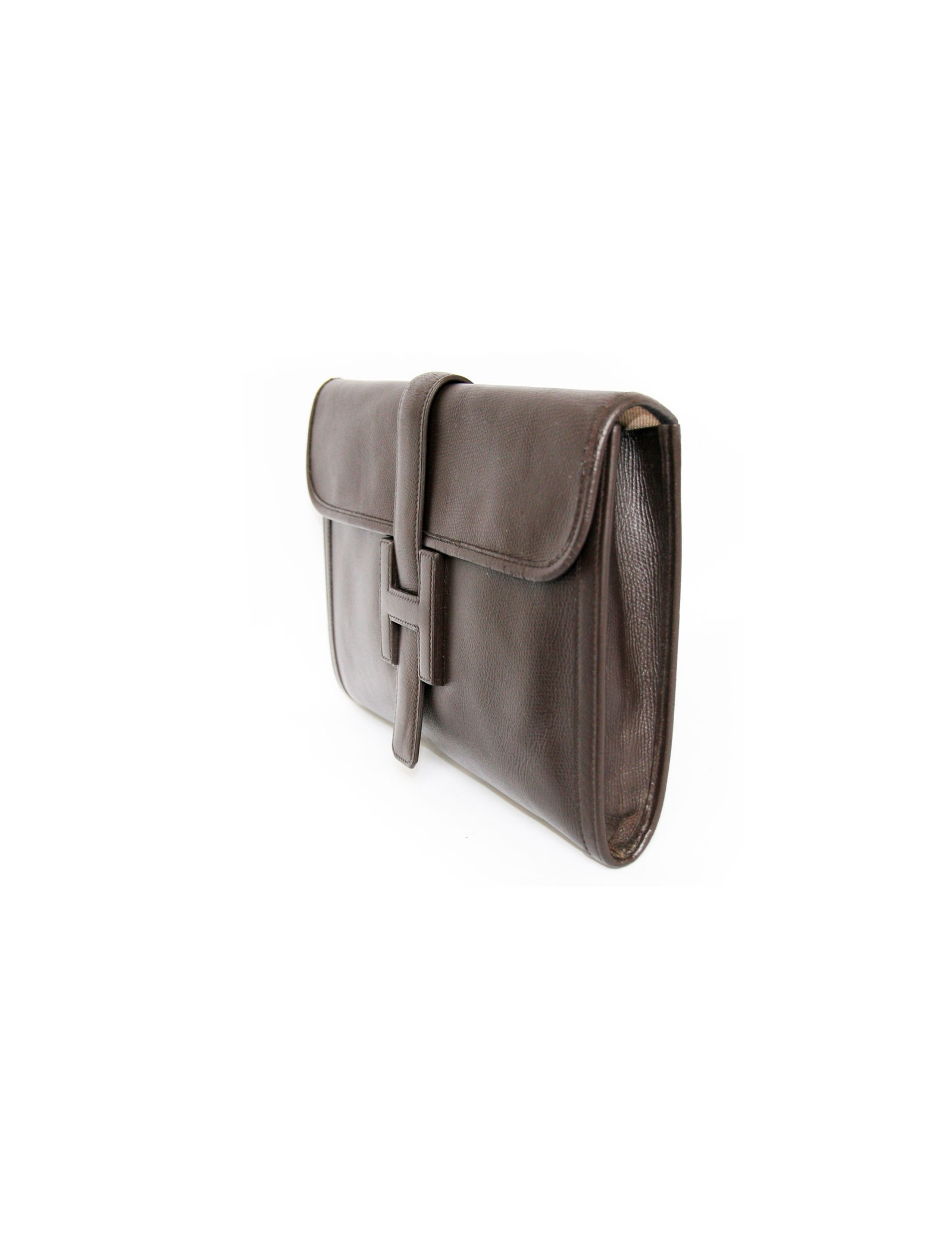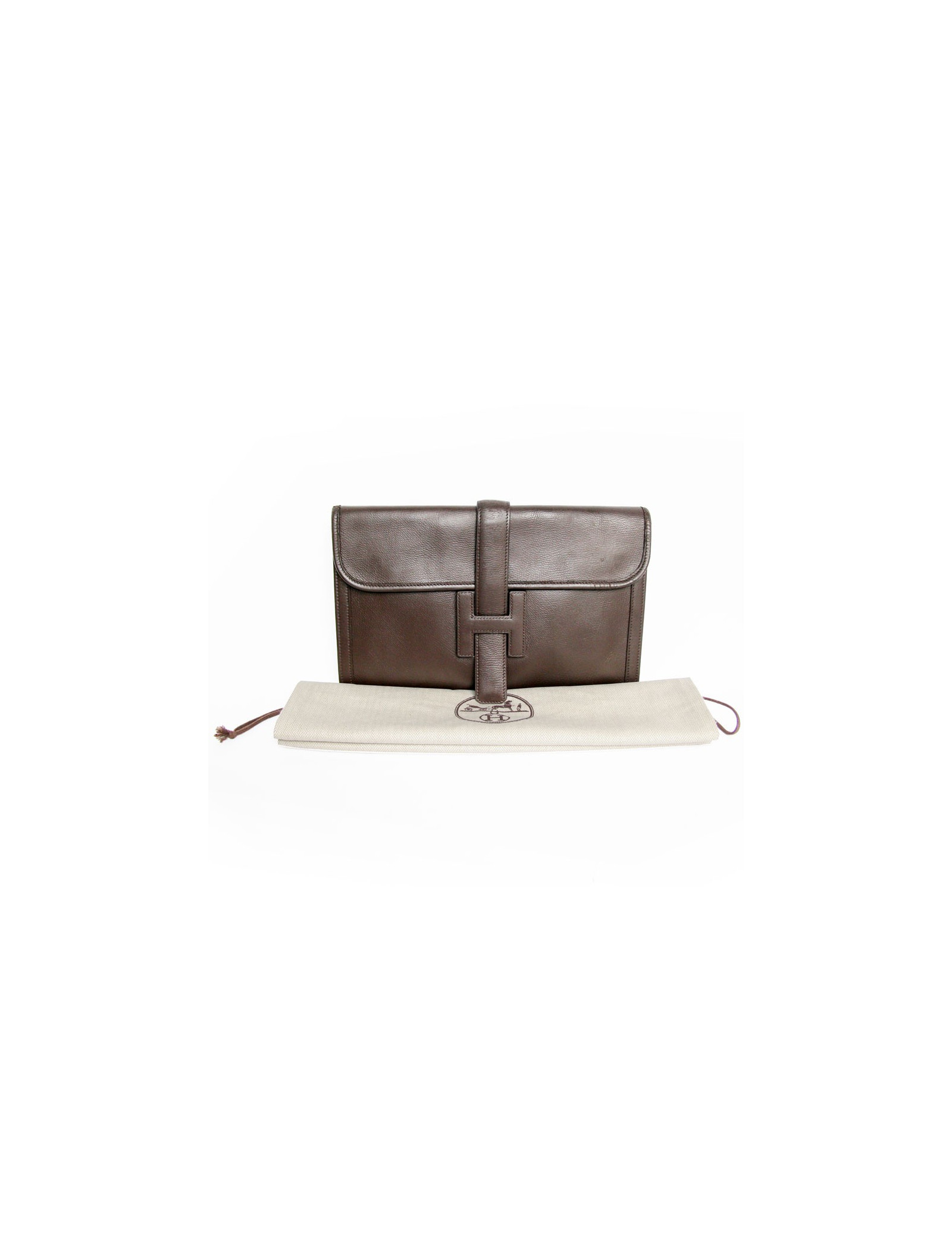 Pouch Jige of Hermès in chocolate brown color leather. The Interior is beige canvas. Letter G in a round.