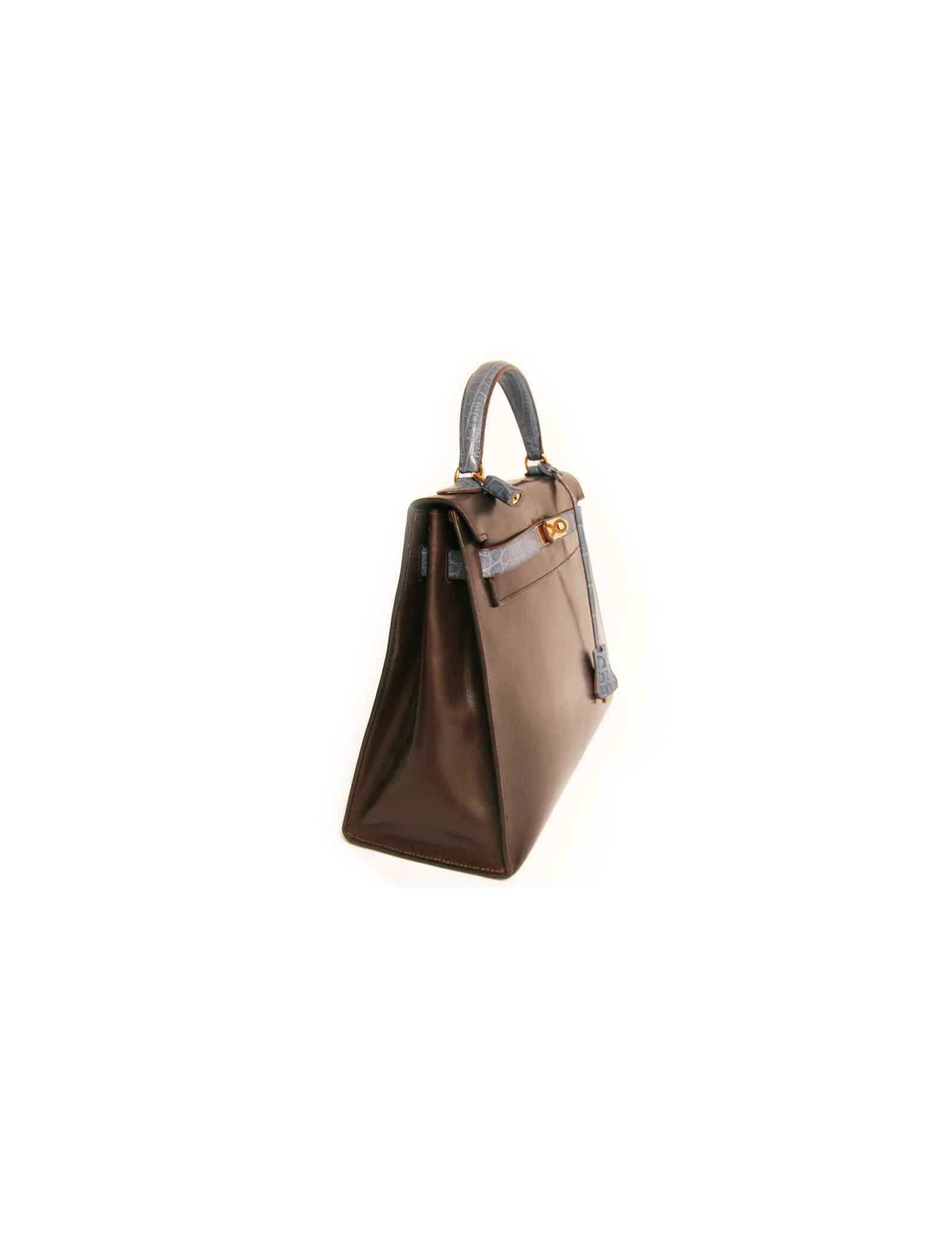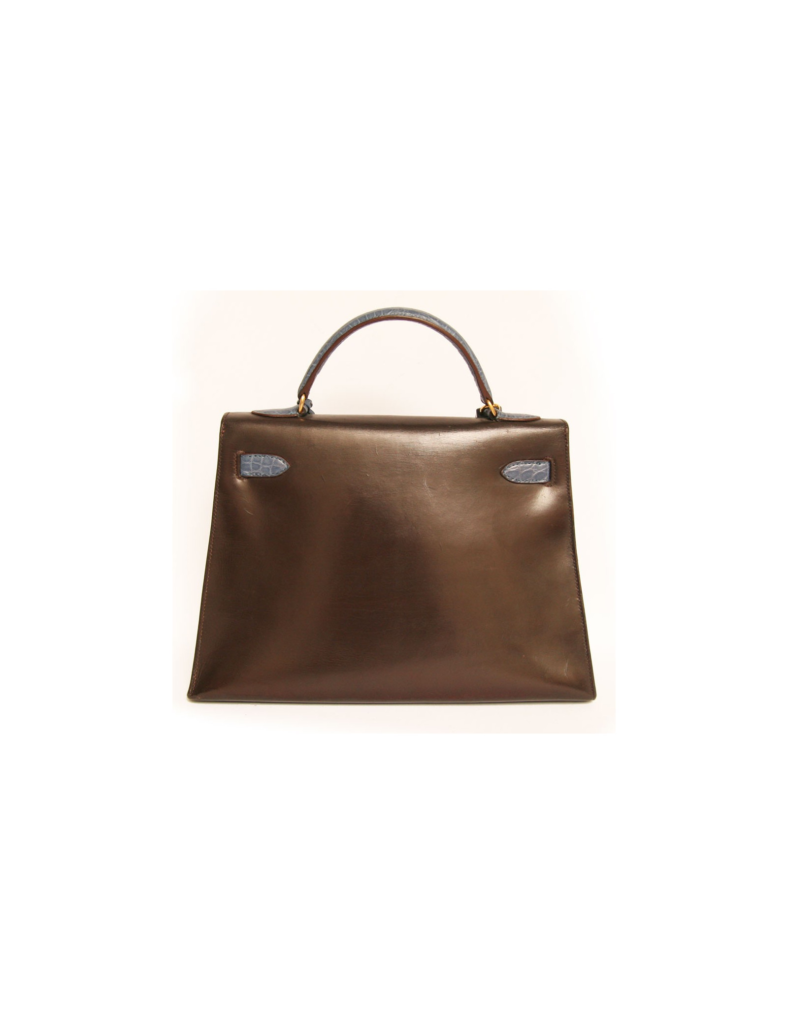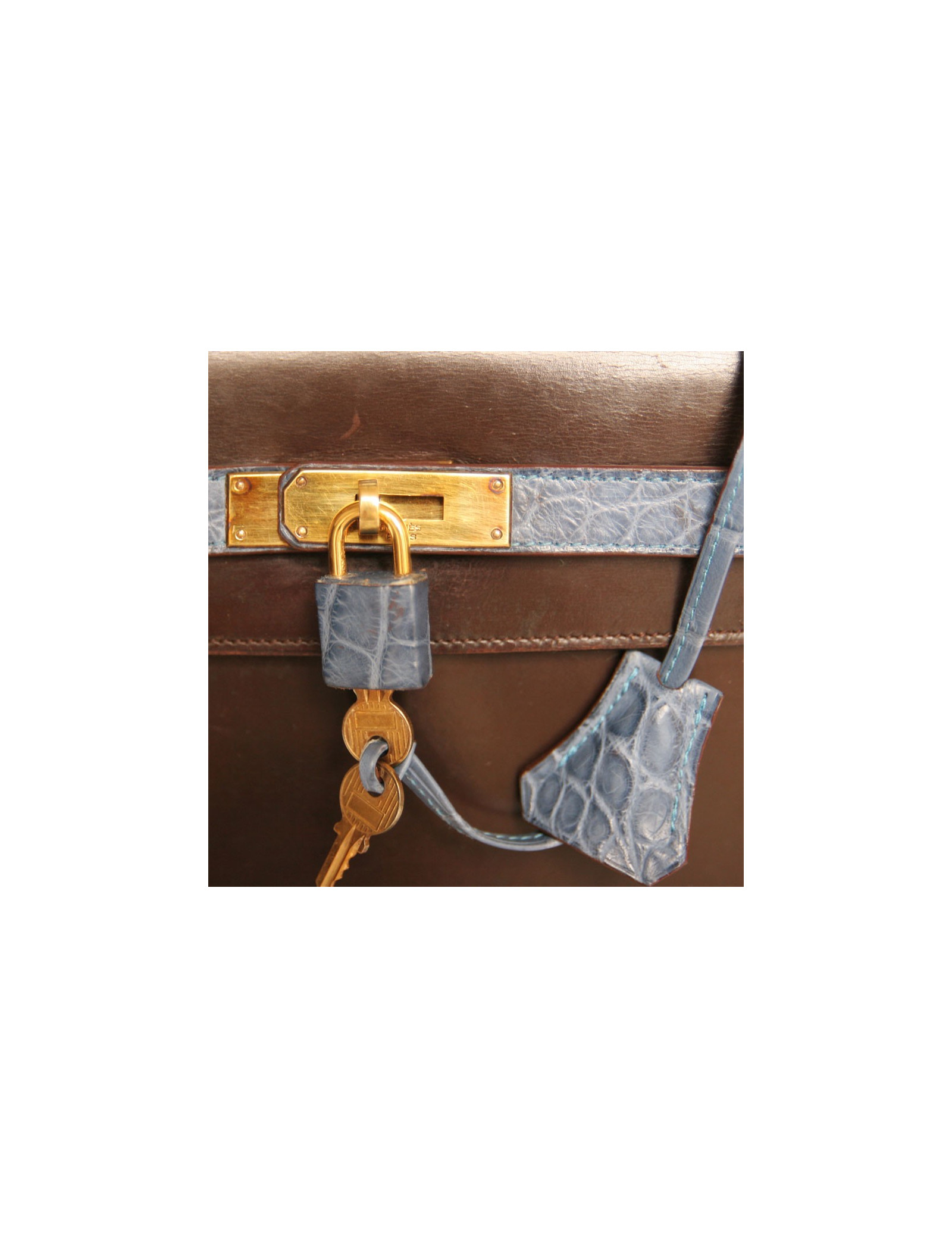 Sublime bag Kelly sellier 32 HERMES, vintage Brown with links box and Cove in crocodile blue jeans (probably made by a craftsman)
