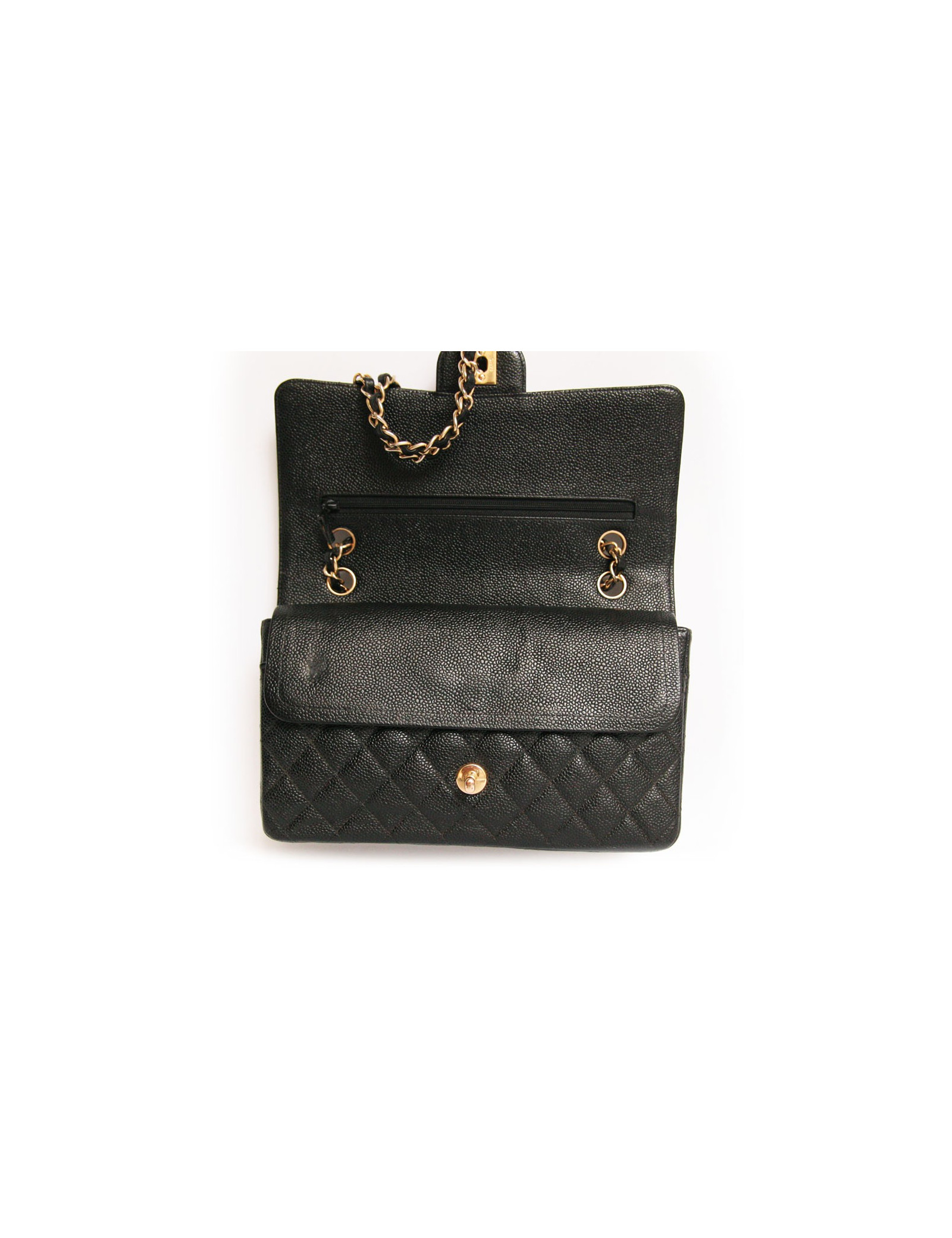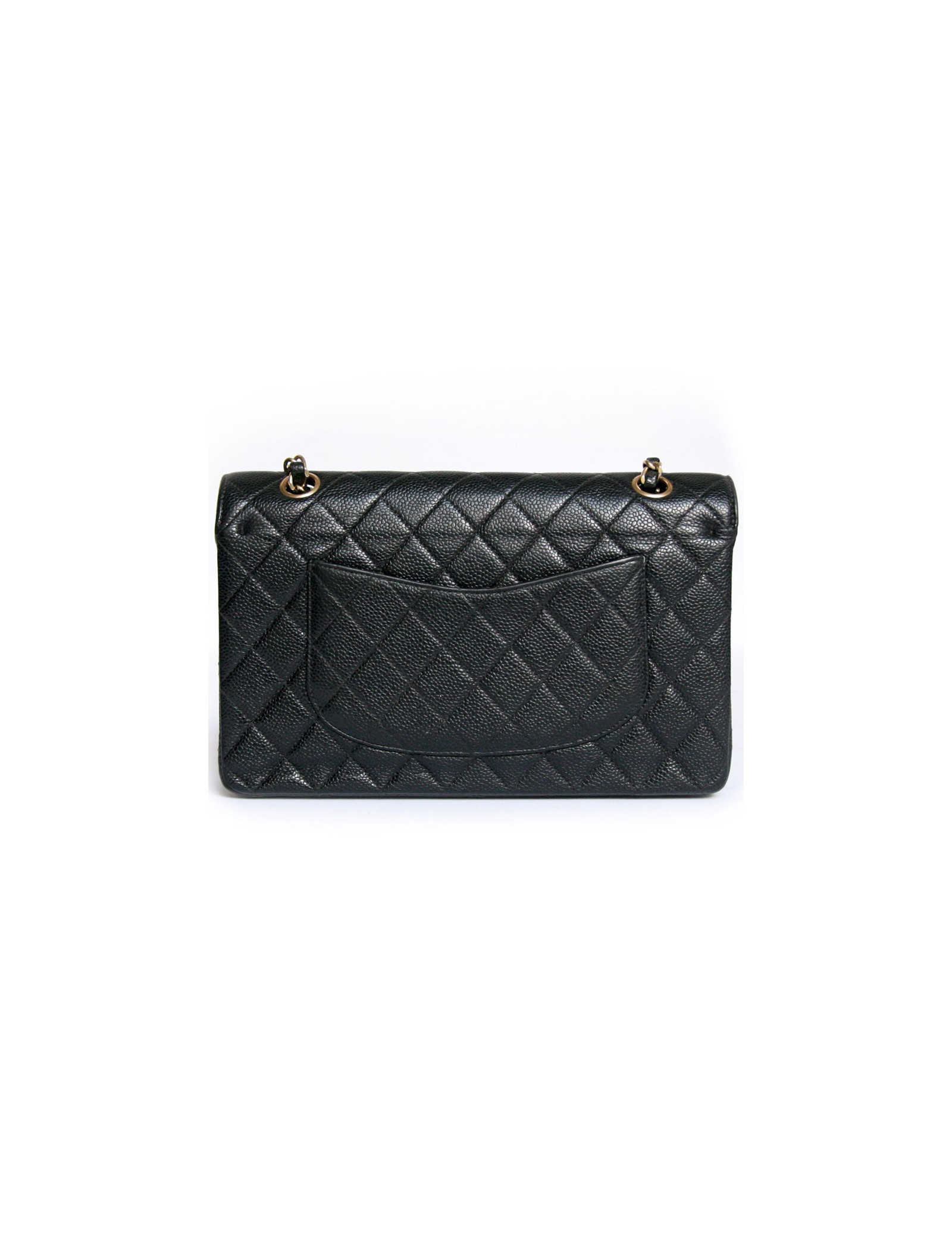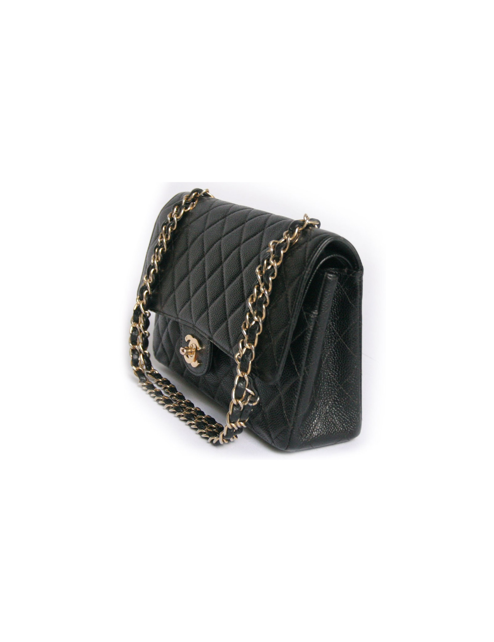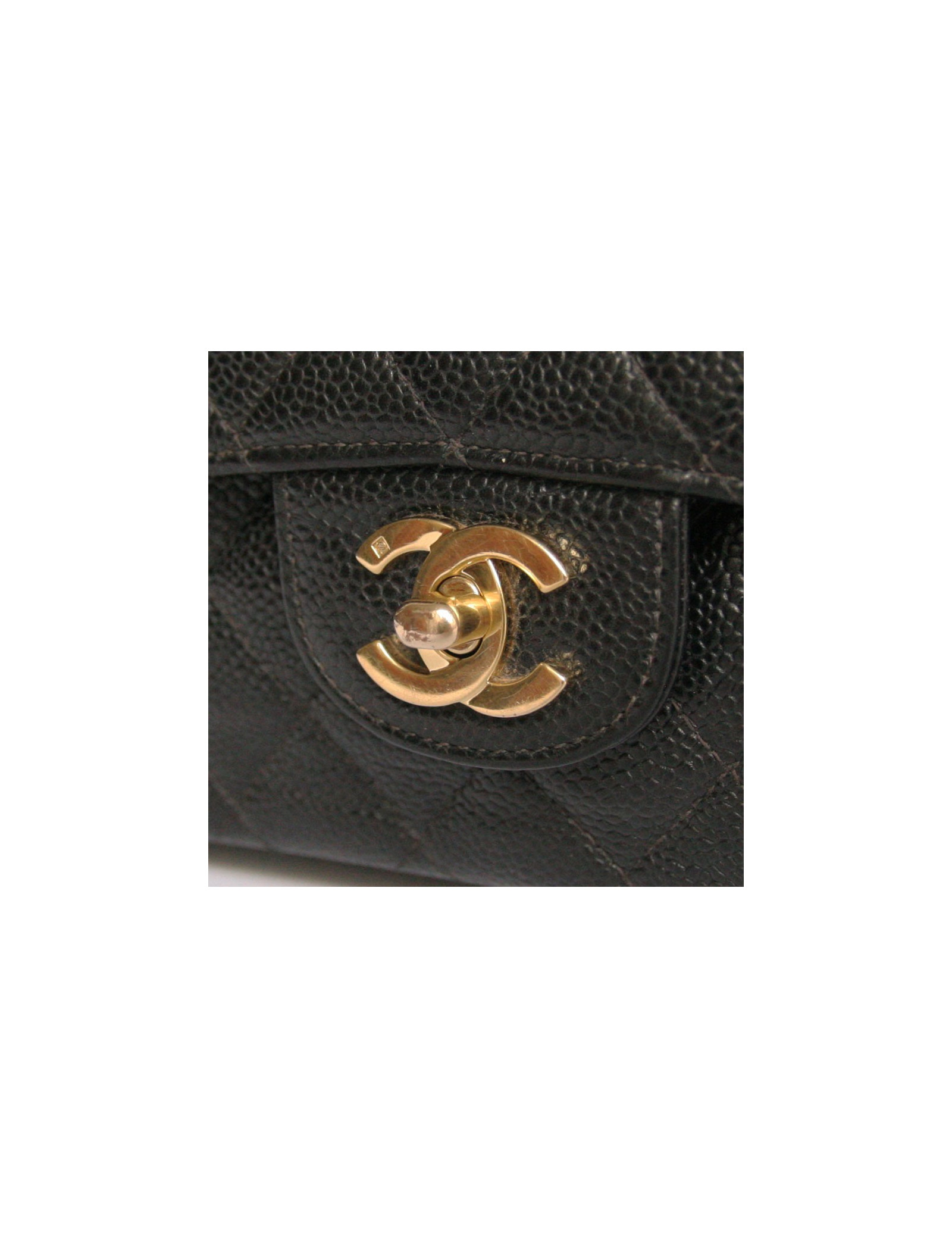 Authentic bag timeless from the House of Chanel in black grained calf "Caviar". The jewelry is gold metal. The shoulder strap is gold metal and chain leather, the same as the bag. Inside, two pockets flat and a larger front and rear. Clasp CC. Double flap. Slight wear on the first flap mark, see picture. Hologramme 7785... and authenticity card. In very good condition. Current public price approximately 3500 euros