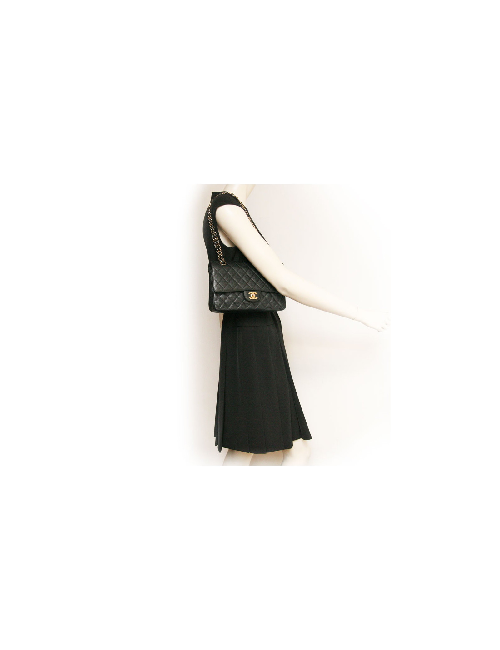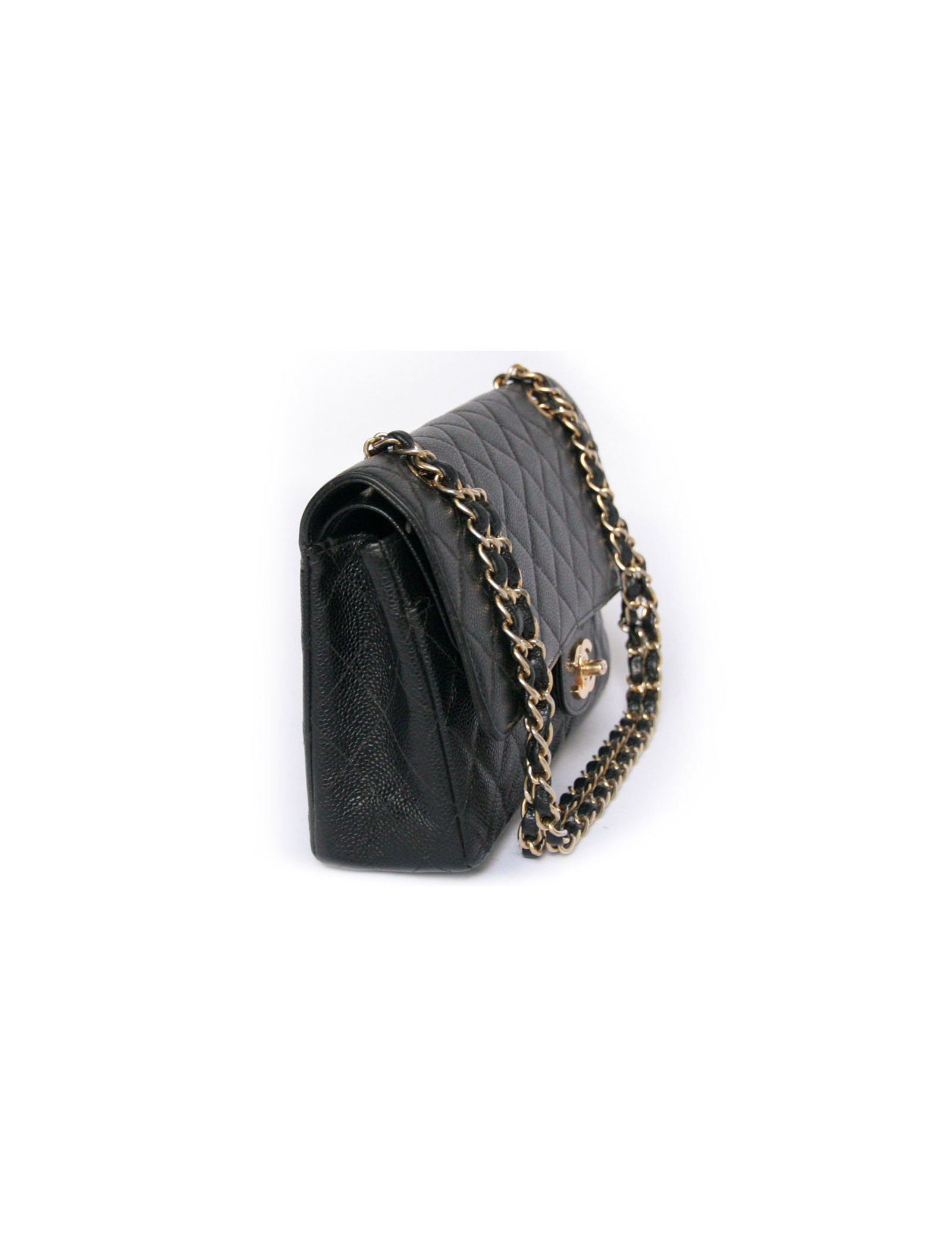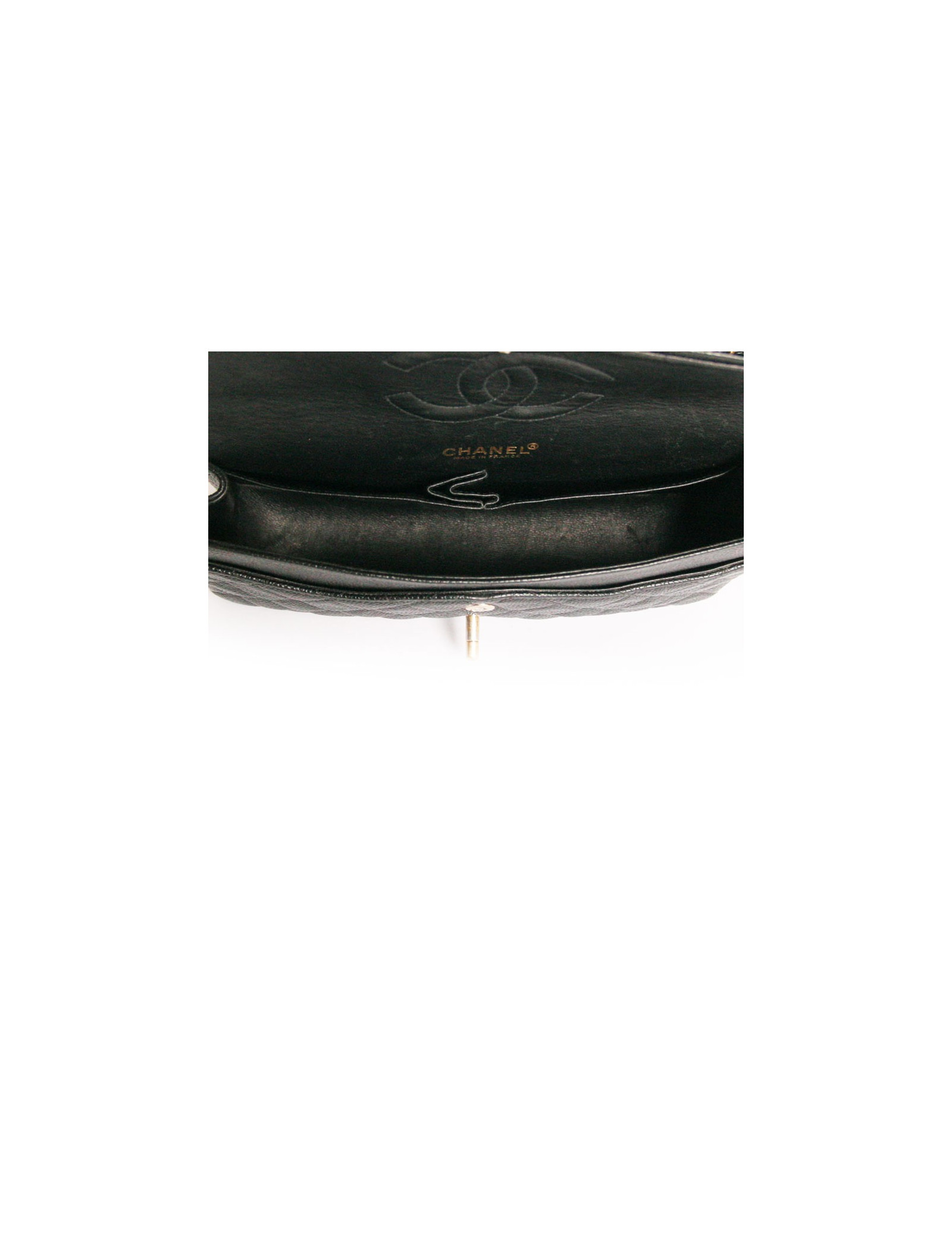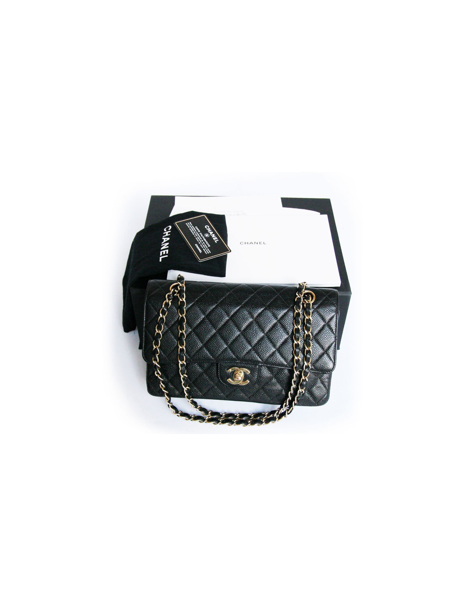 Authentic bag timeless from the House of Chanel in black grained calf "Caviar". The jewelry is gold metal. The shoulder strap is gold metal and chain leather, the same as the bag. Inside, two pockets flat and a larger front and rear. Clasp CC. Double flap. Slight wear on the first flap mark, see picture. Hologramme 7785... and authenticity card. In very good condition. Current public price approximately 3500 euros