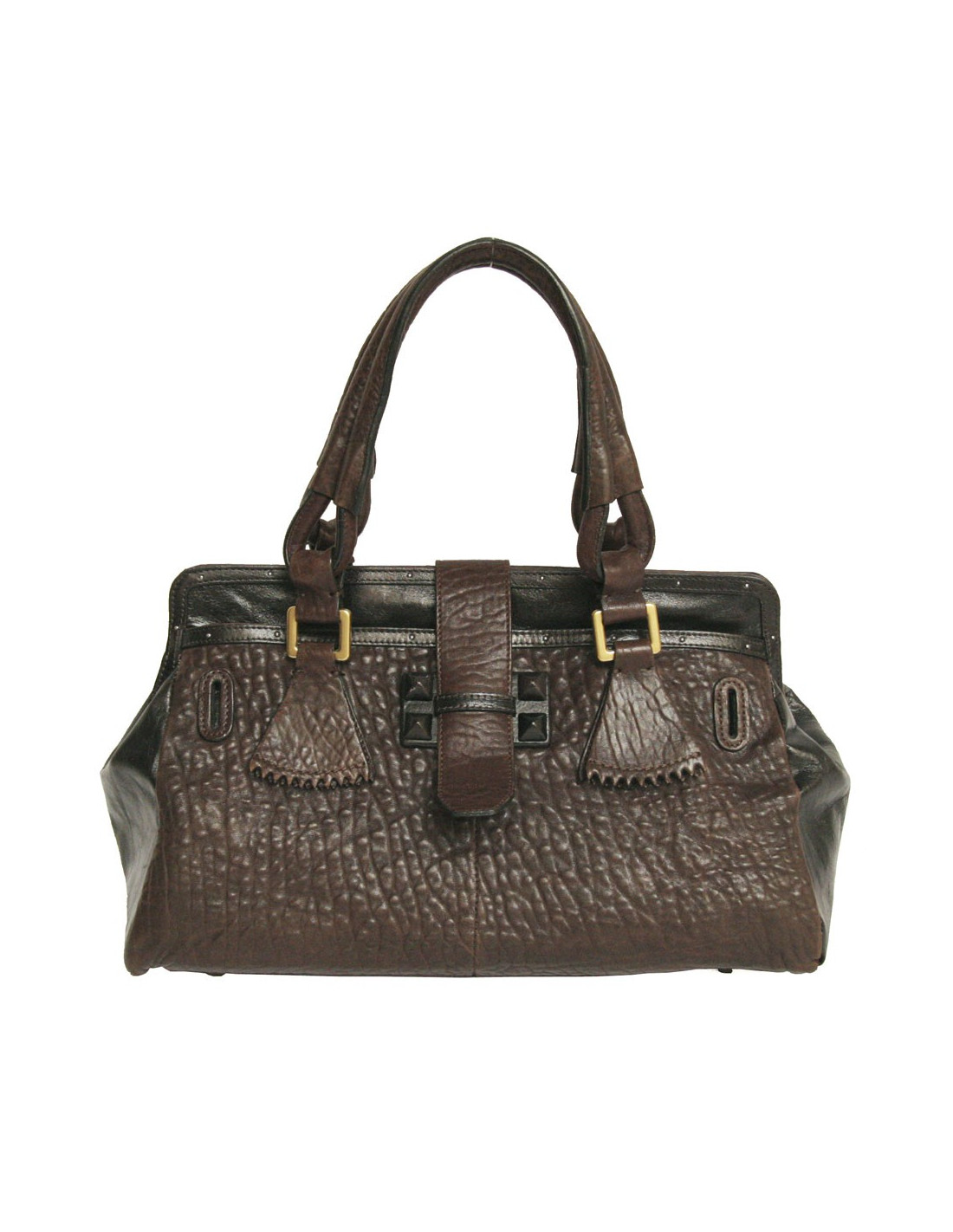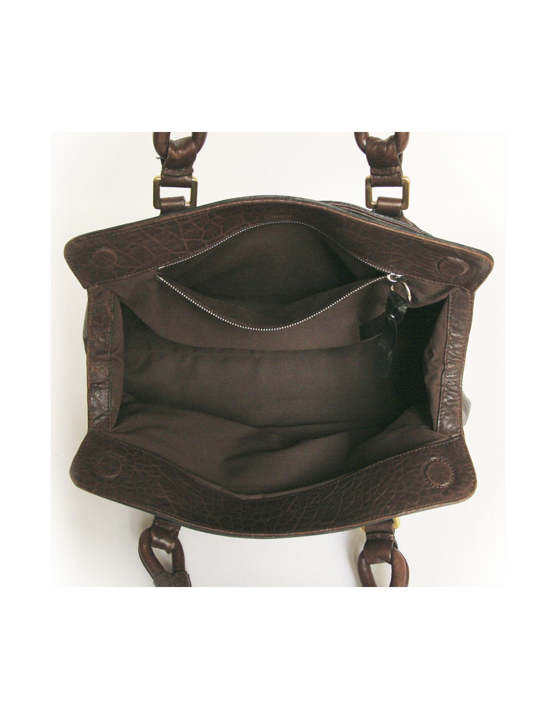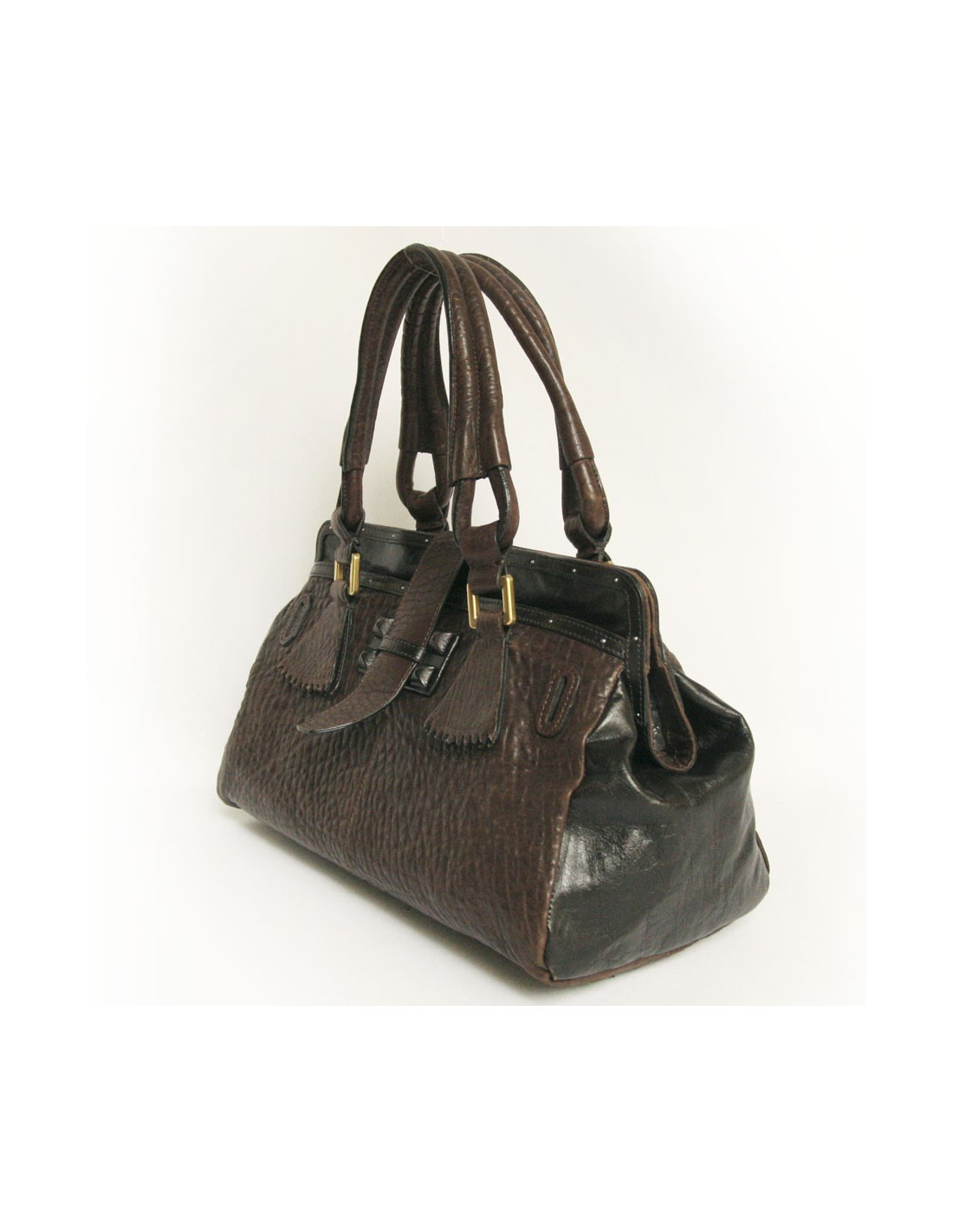 Chloé bag leather brown elephant and chocolate smooth leather on the sides. A pocket on each side and brown leather tabs. The Cove is double brown leather. Magnetic top closure. A large zipped inside pocket. The inner lining is chocolate canvas. The fittings are in golden metal. Made in Italy. In good condition. The underside is slightly worn as well as one of the tabs because of friction.