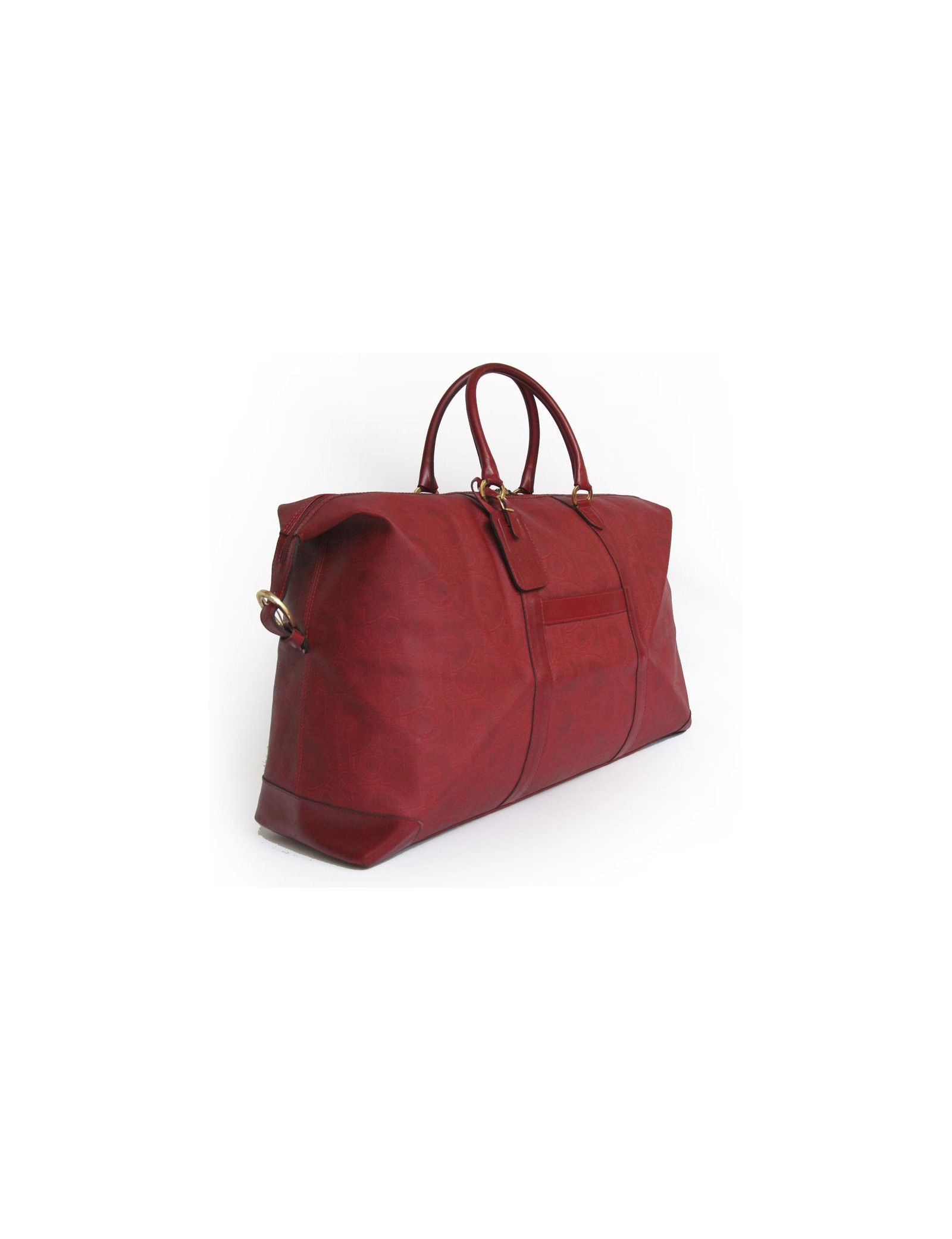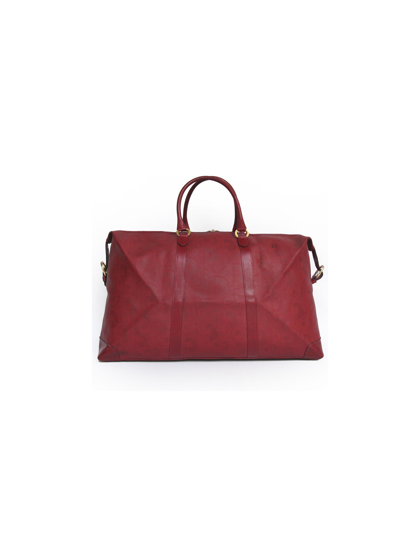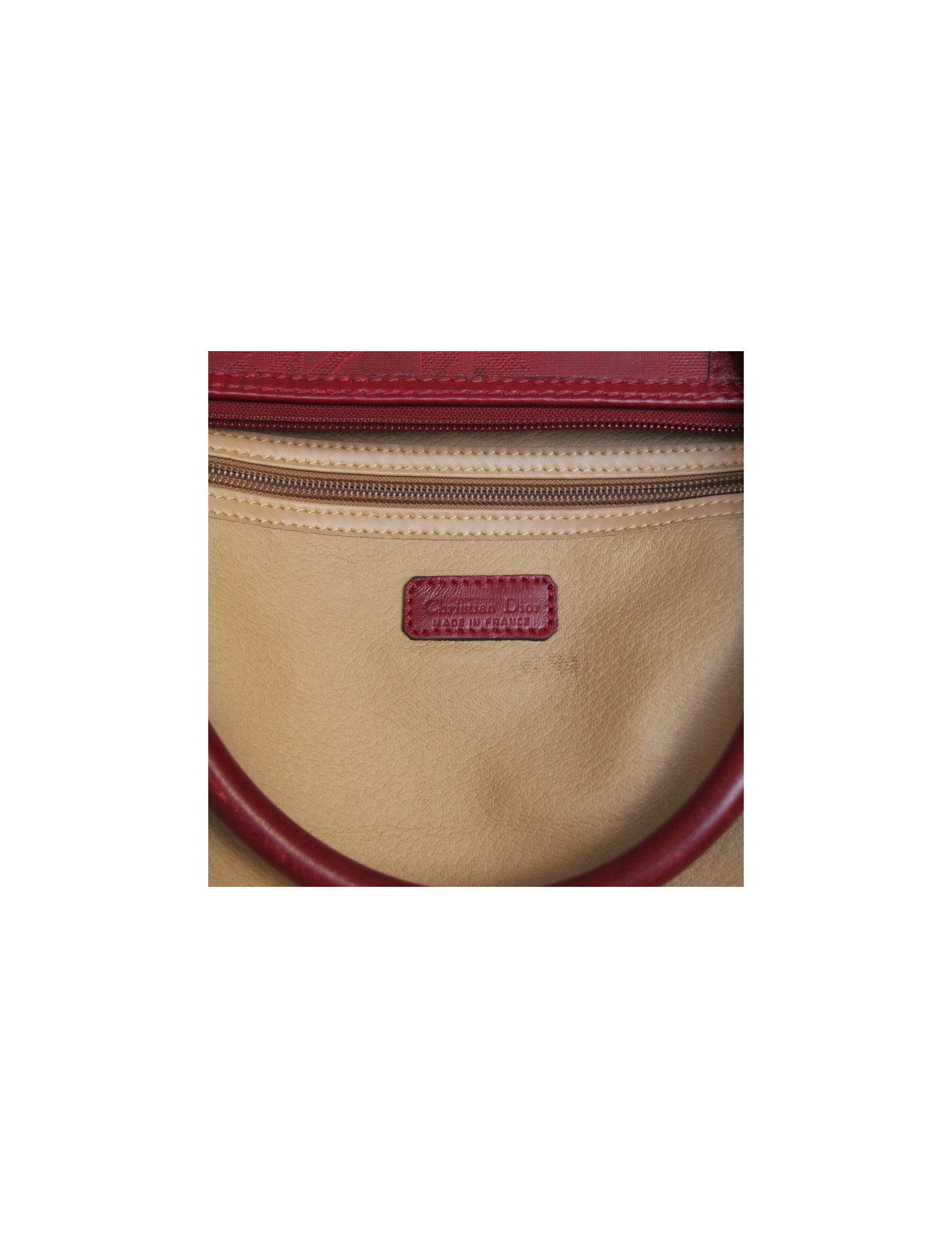 Très pratique !! Sac de voyage de la Maison Christian Dior en toile embossée rouge monogrammé. L'accastillage est en métal doré. Fermeture zippée. L'intérieur est en cuir beige avec une grande poche zippée. Double anses en cuir. En bon état. (une petite tache noire à l'avant ainsi que la patine du cuir sur les anses.)