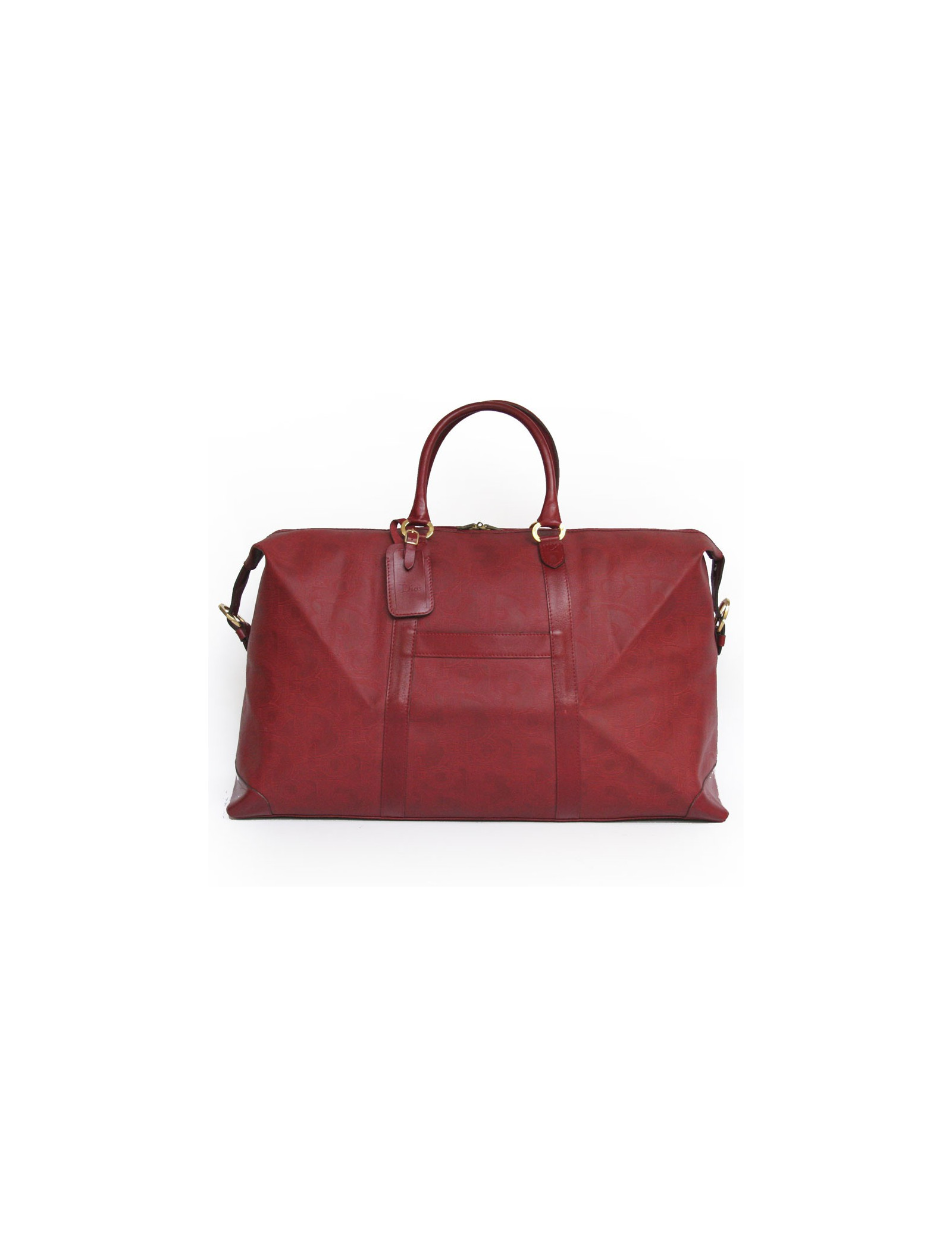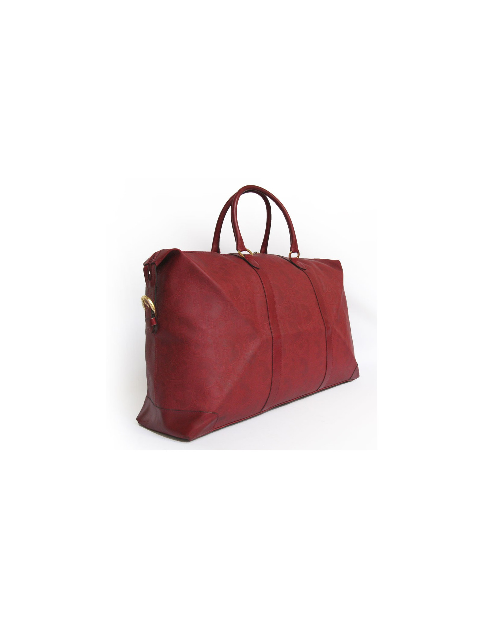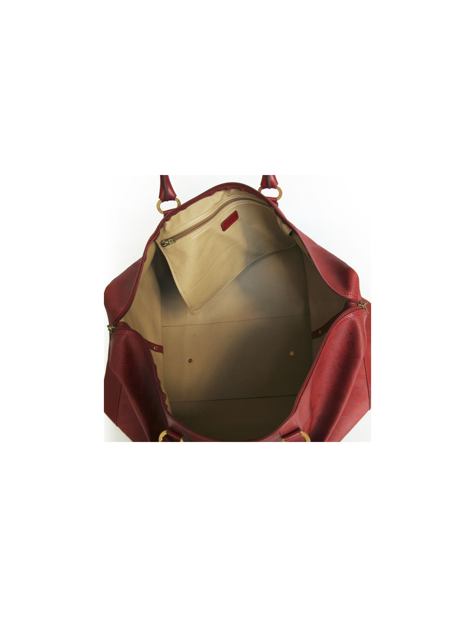 Très pratique !! Sac de voyage de la Maison Christian Dior en toile embossée rouge monogrammé. L'accastillage est en métal doré. Fermeture zippée. L'intérieur est en cuir beige avec une grande poche zippée. Double anses en cuir. En bon état. (une petite tache noire à l'avant ainsi que la patine du cuir sur les anses.)