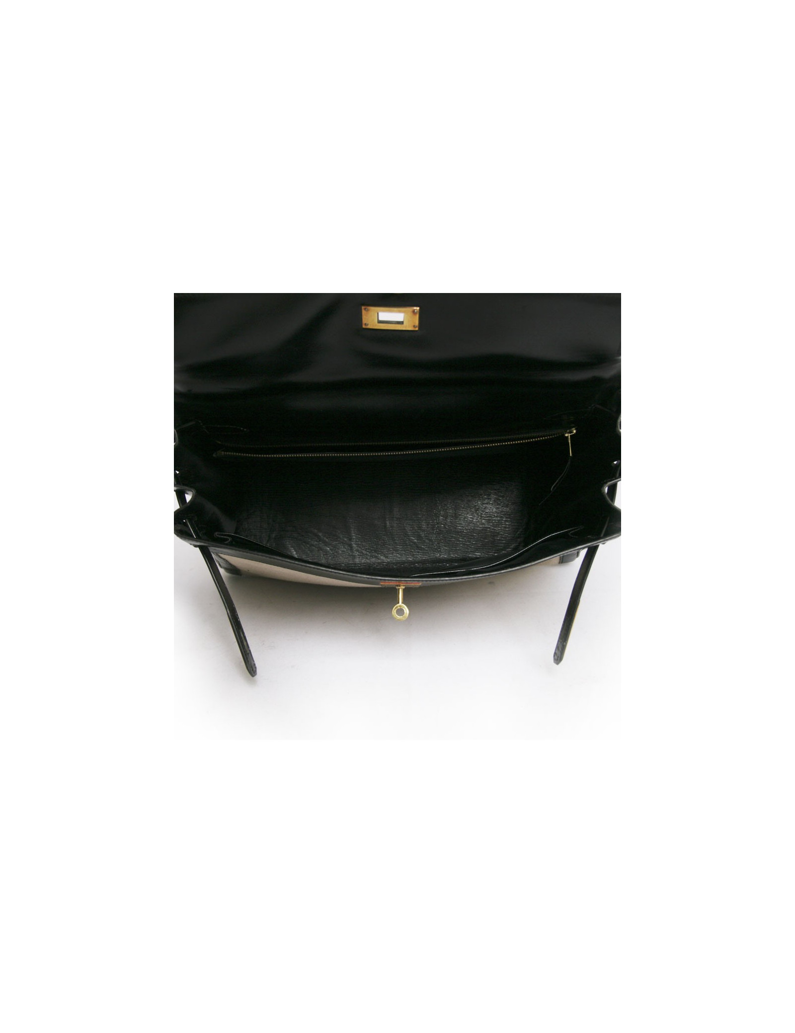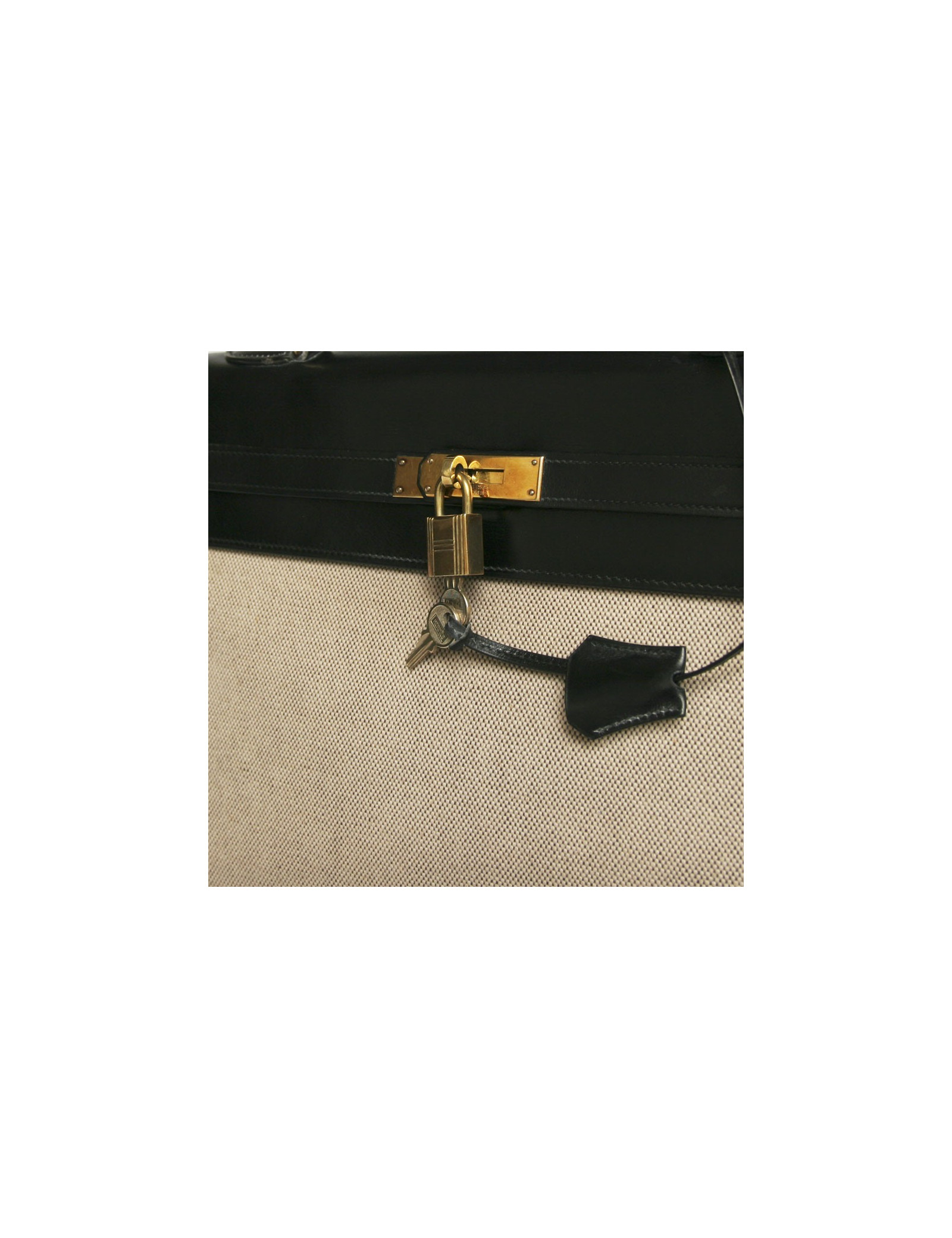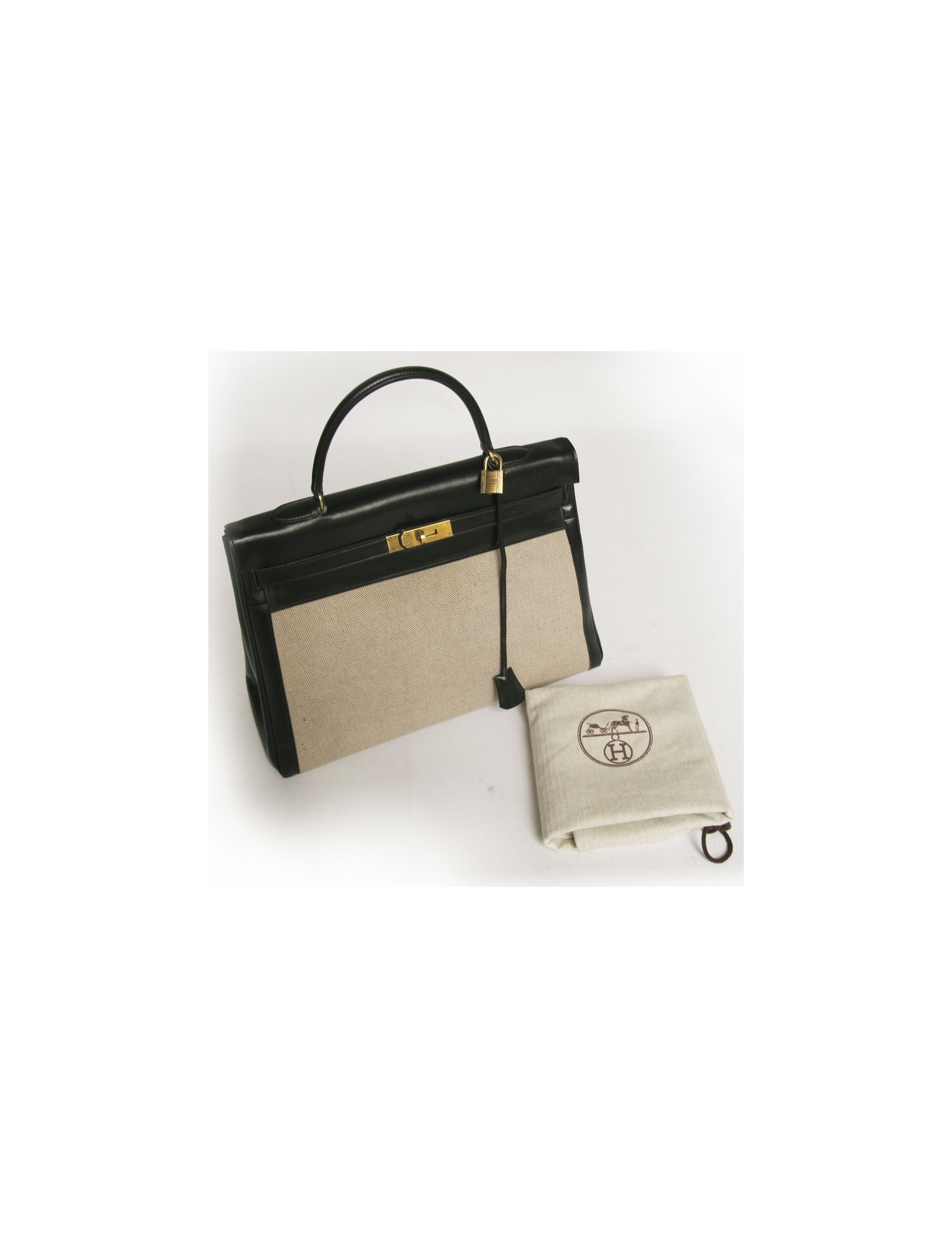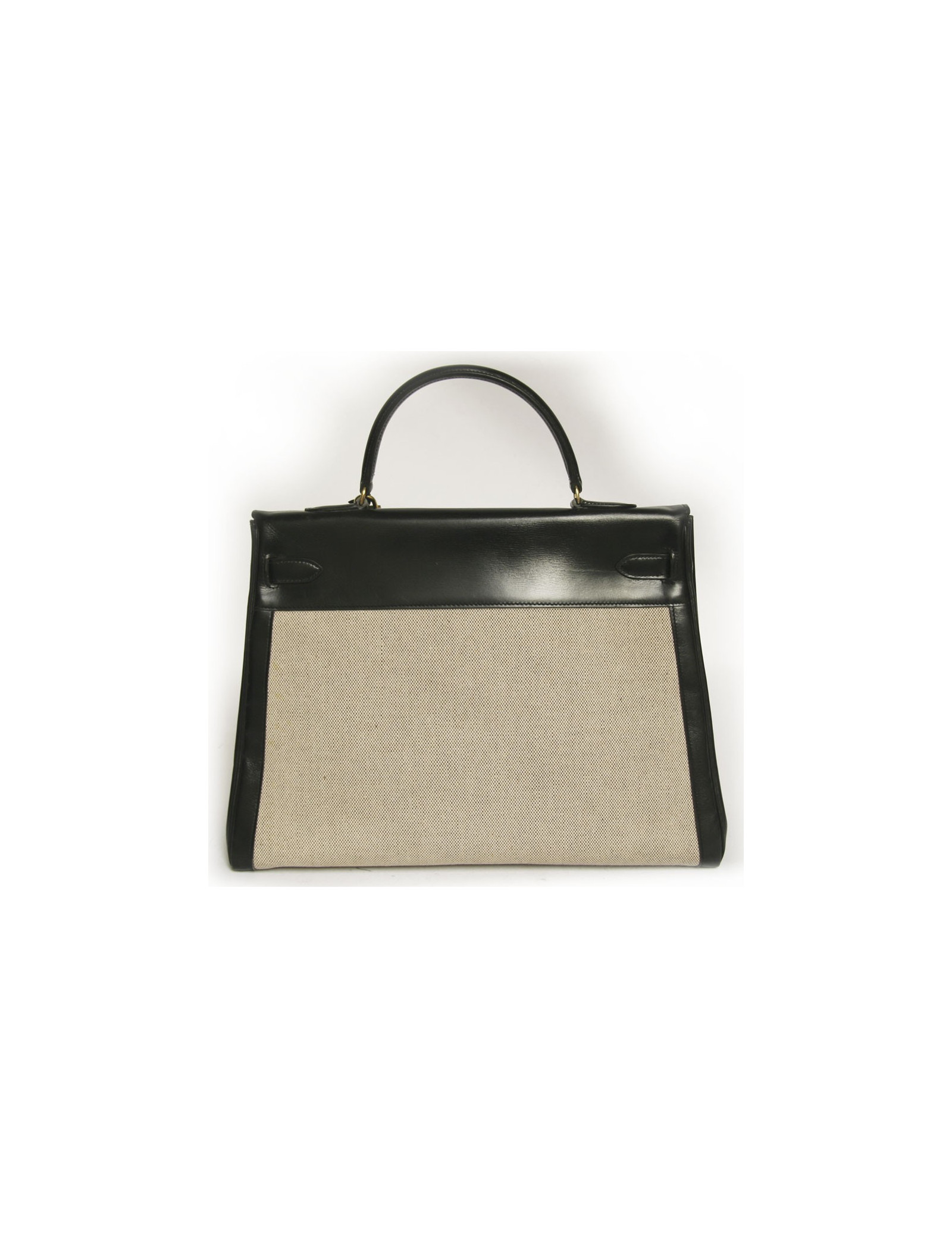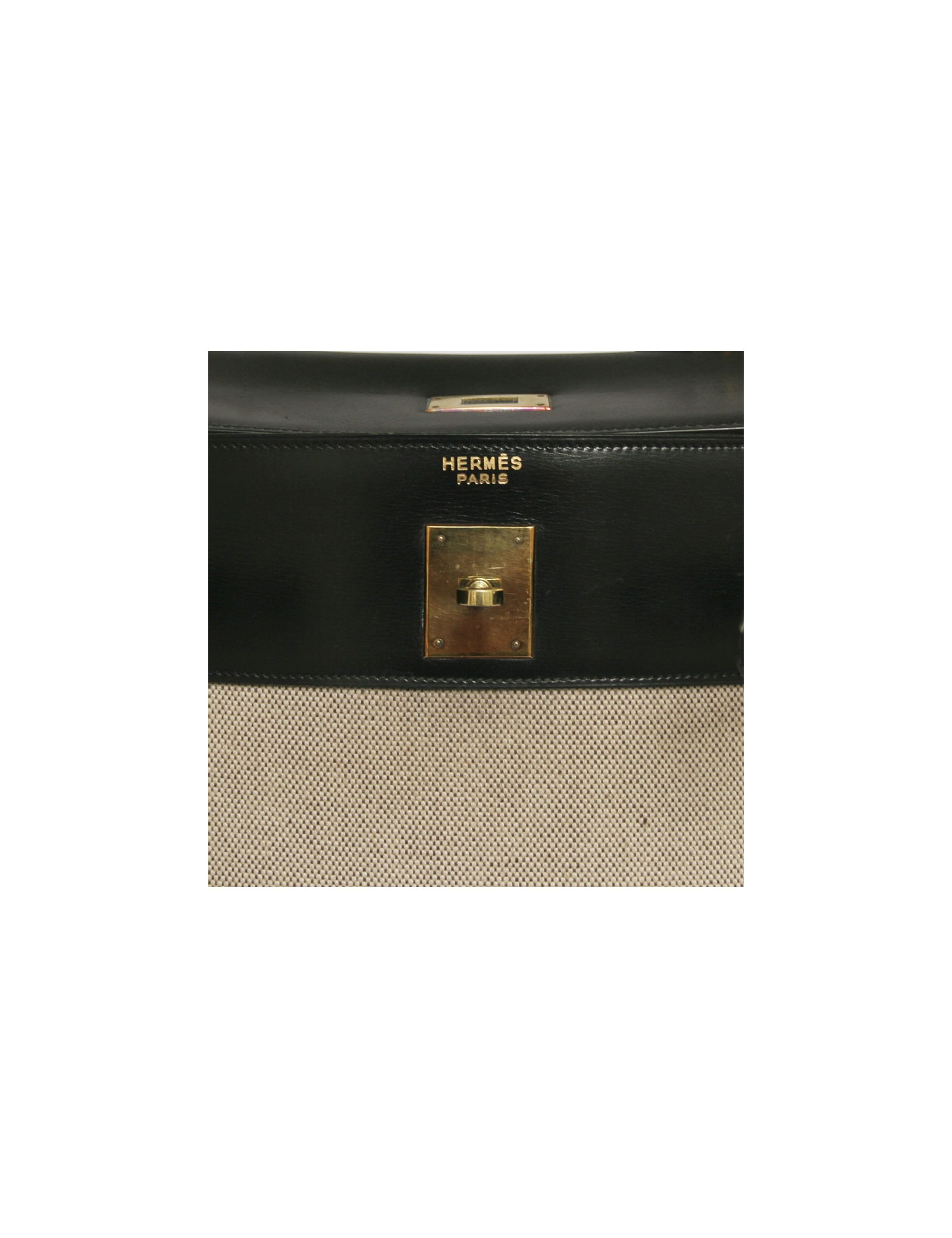 The unbeatable bag Kelly 35 of Hermès in black leather and canvas. Fittings is made of gilded brass. Padlock, Tinker Bell, and two keys. Inside, there are 3 large pockets of which one zipped. In very good condition. Small patina of leather on the handle and on the tongue that helps close the bag and small very light yellow stains on the canvas at the back of the bag.
