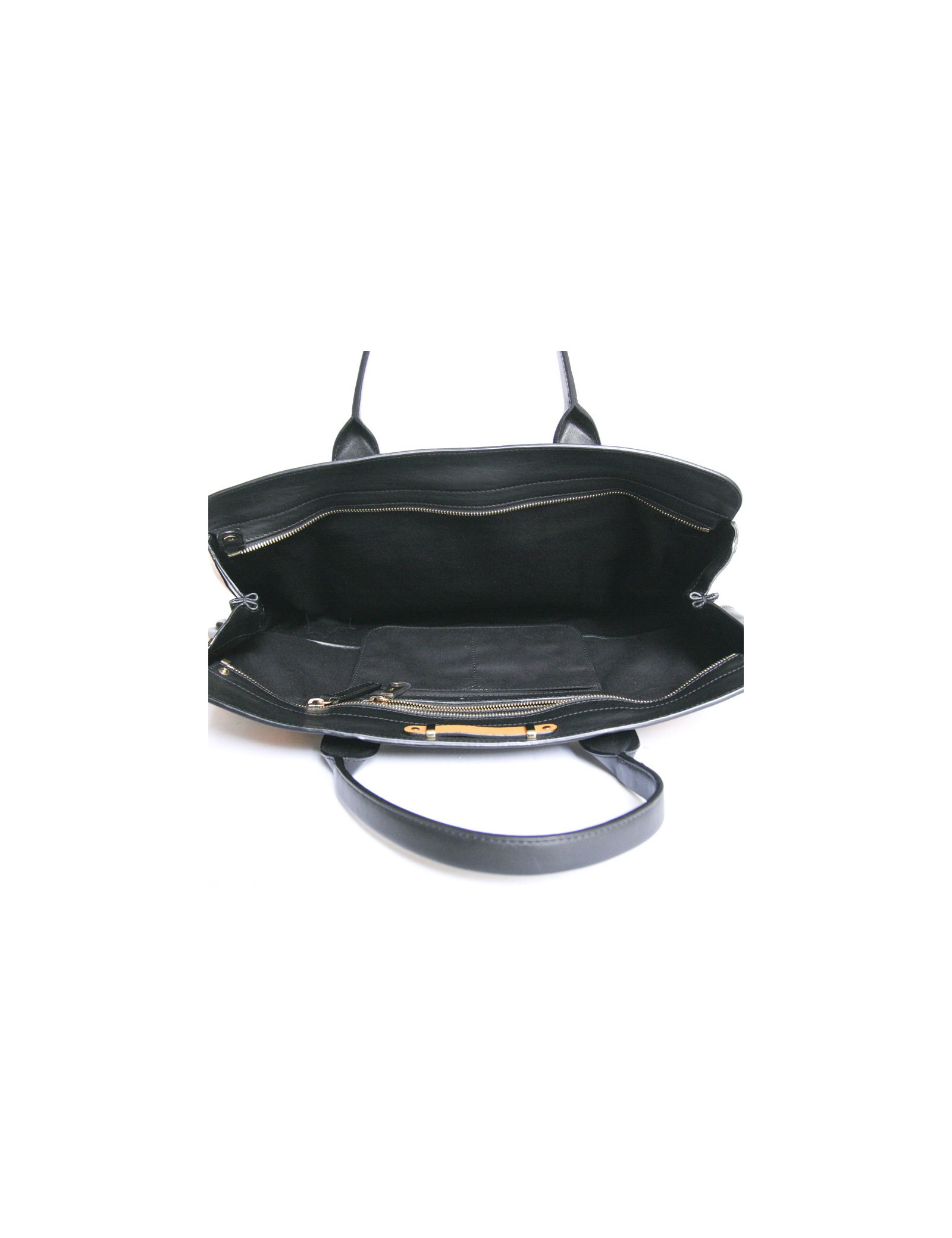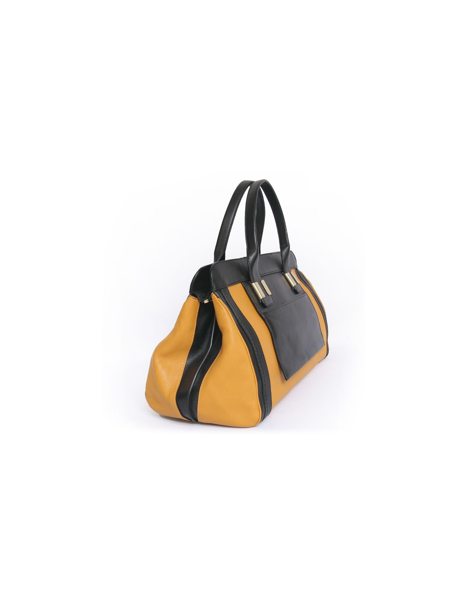 Two-tone Chloe black and mustard-yellow leather bag. Ideal for everyday as it is very convenient to use and it has a large storage space. Double handles for carry in the hand or arm. The hardware is gold metal. The Interior is black cloth with 3 pockets including 1 zipped. There's also a pocket on the front and one at the rear. In very good condition.