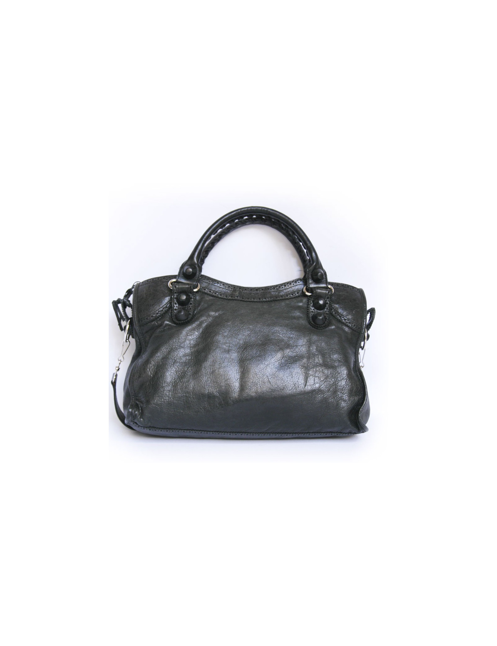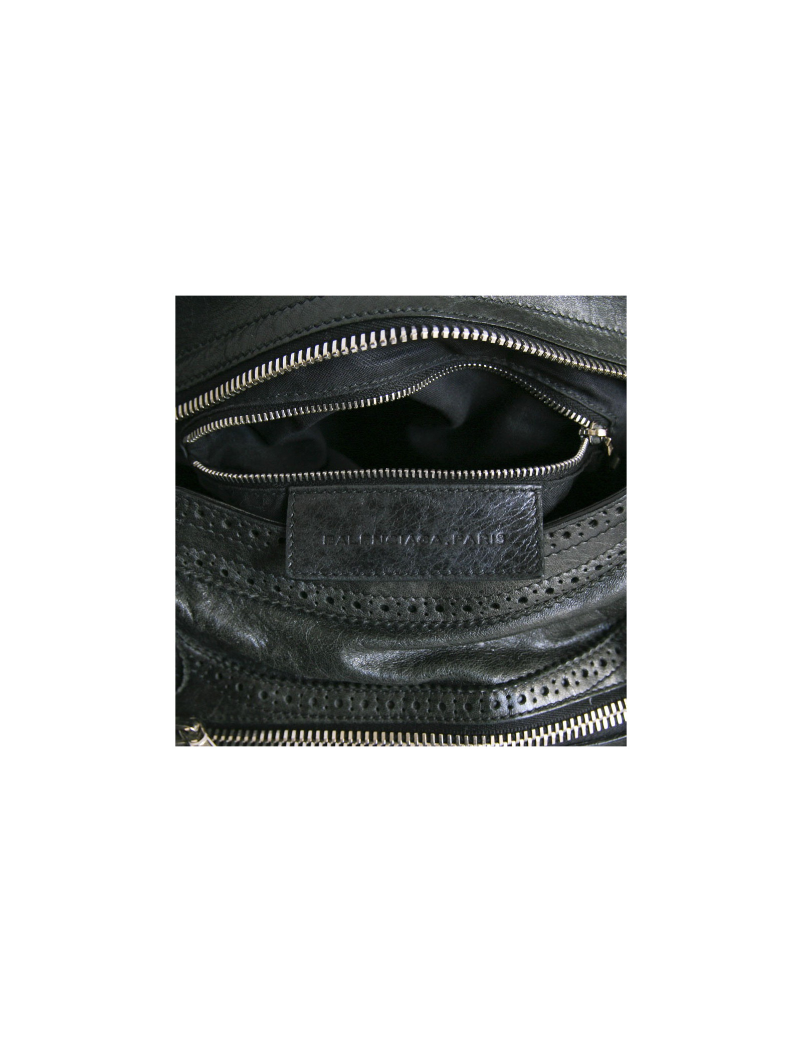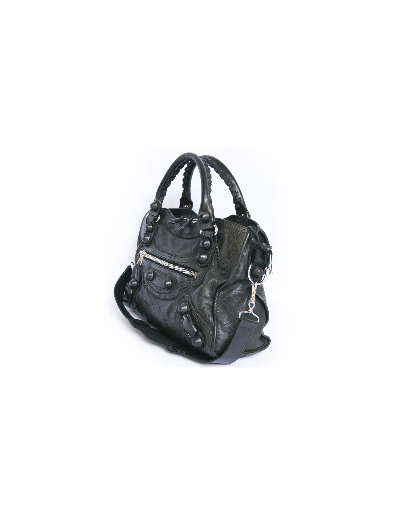 "Giant Brogues City" Balenciaga black leather soft bag of vintage aspect. Two handles for a hand and a removable shoulder strap for a door door shoulder. The Interior is black cloth with a zipped pocket and a mirror on the outside. The hardware is in silver metal. Serial number engraved into the leather on the inside. In very good condition. Nails leather is slightly skated in some places.