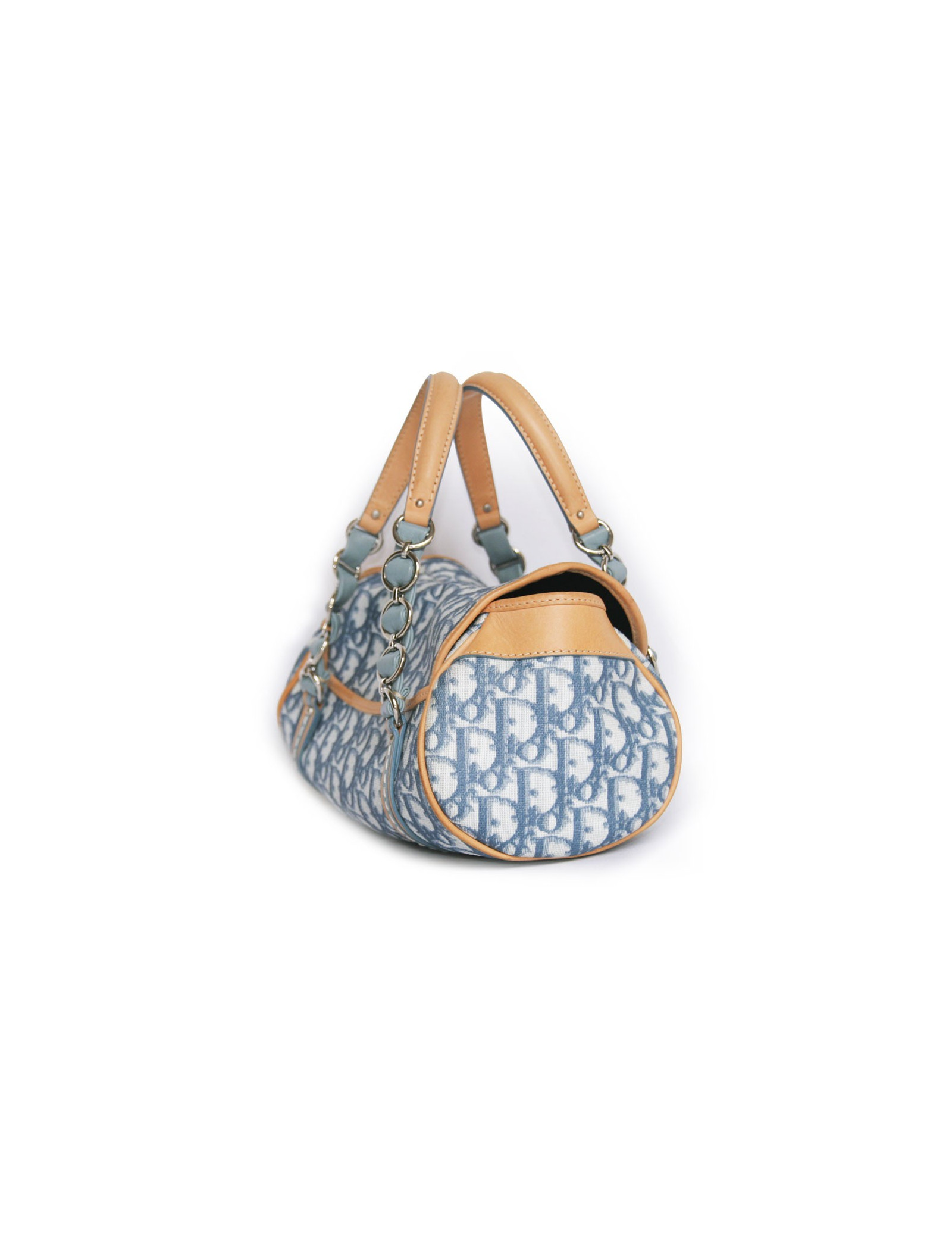 Mini bag CHRISTIAN DIOR coated blue monogram canvas and natural calf leather. The jewelry is Palladium metal. Closing pressure. The Interior is marine blue satin with a zipped pocket. Comes from the balances. In very good condition.