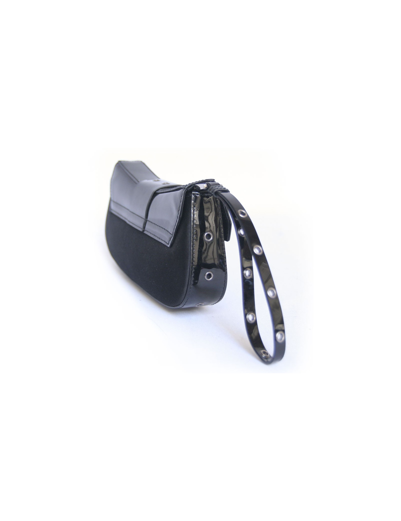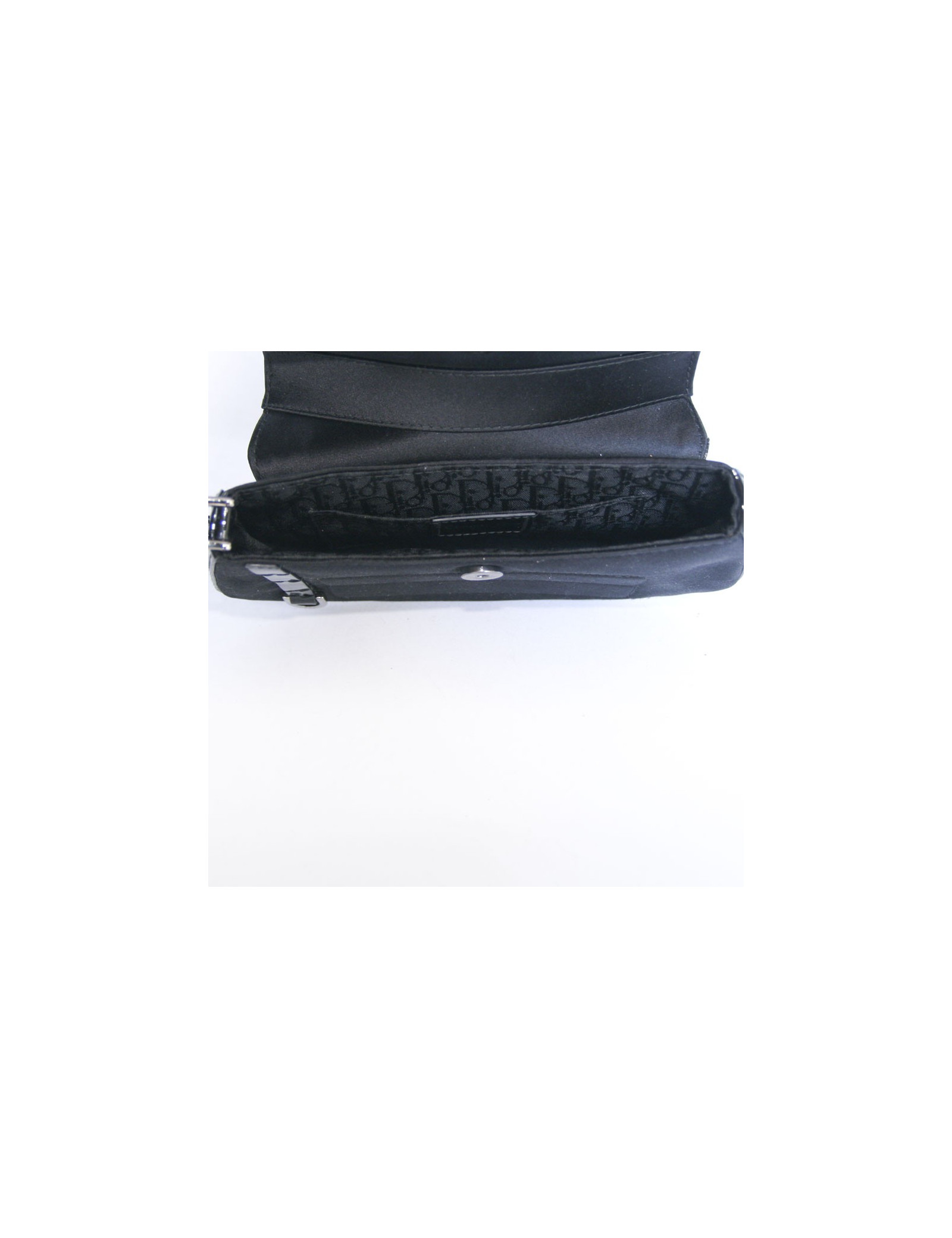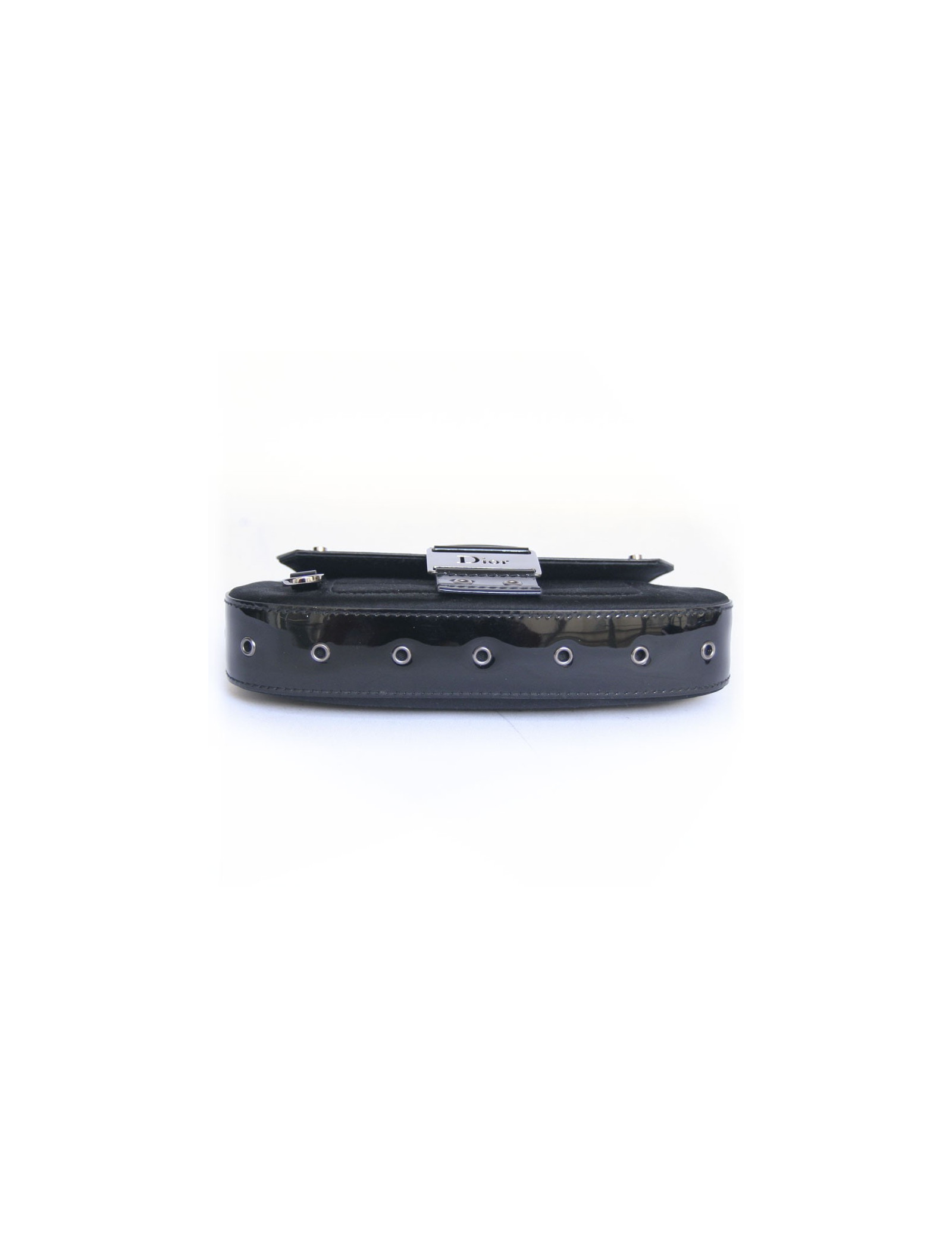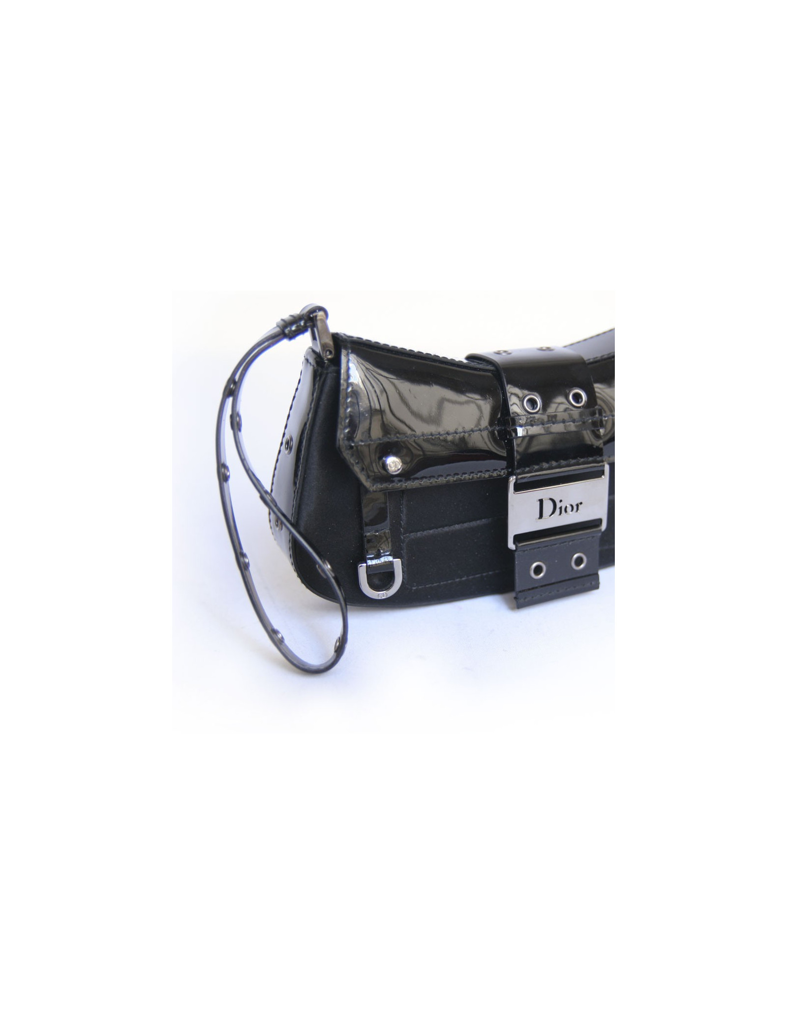 Mini evening bag Christian Dior satin and black patent leather. The hardware is in silver metal. Closing pressure. The Interior is canvas monogram with a small patch pocket. It is handmade using a leather handle. In very good condition.