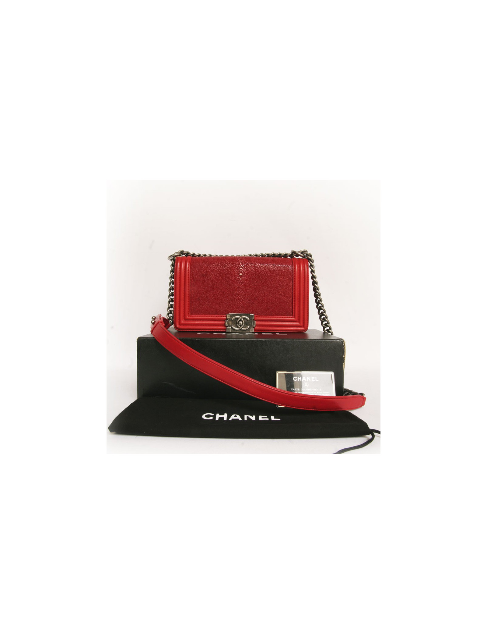 Legendary bag "Boy" from the House of Chanel in leather and Red Stingray. THECove is aged silver chain and red leather. Rabat and iconic push button closure. The borders are red leather. The lining inside the bag is grey fabric with a zipped pocket. Sold with his dustbag and box Chanel. Made in Italy. Hologramme number 1612... and authenticity card. In very good condition.