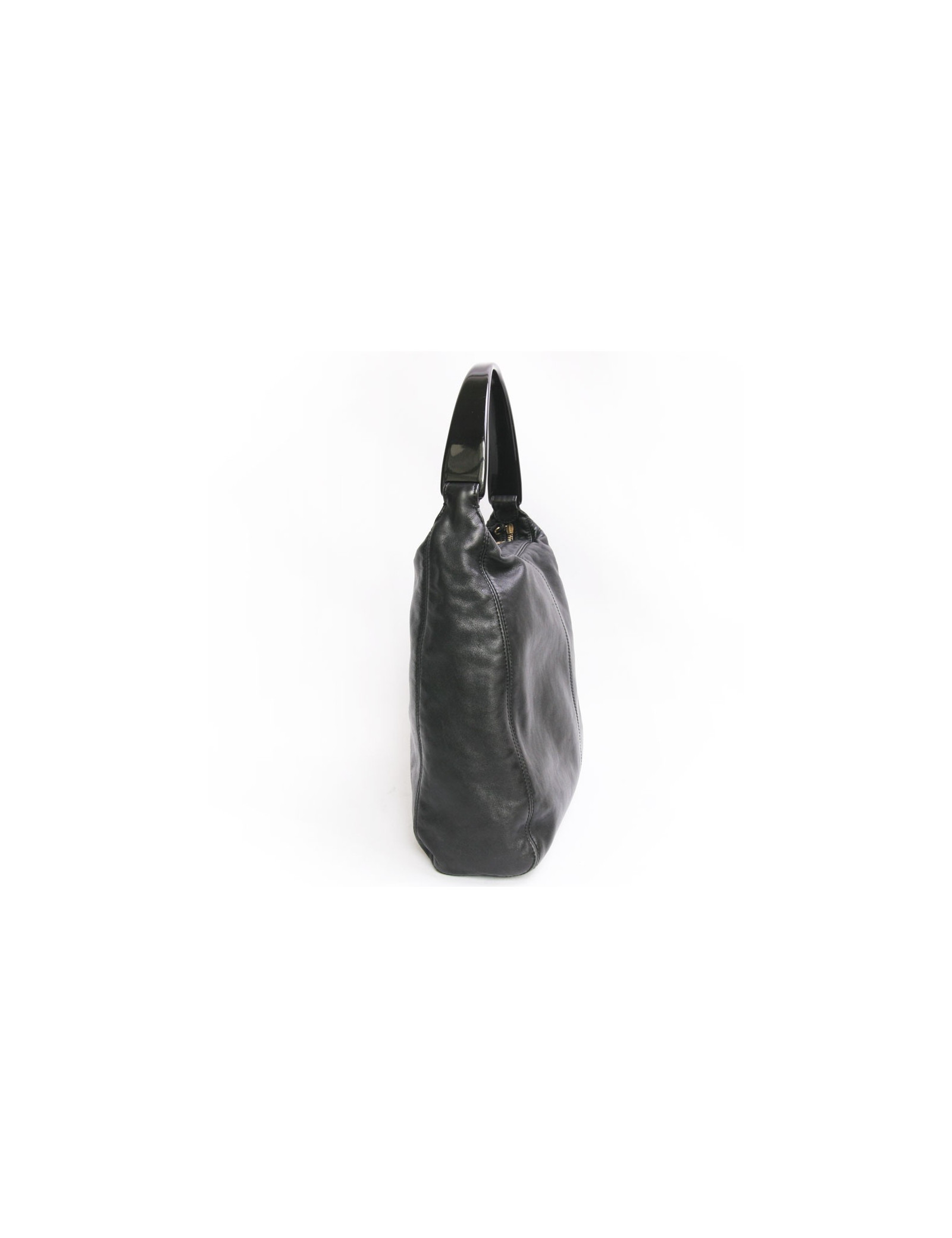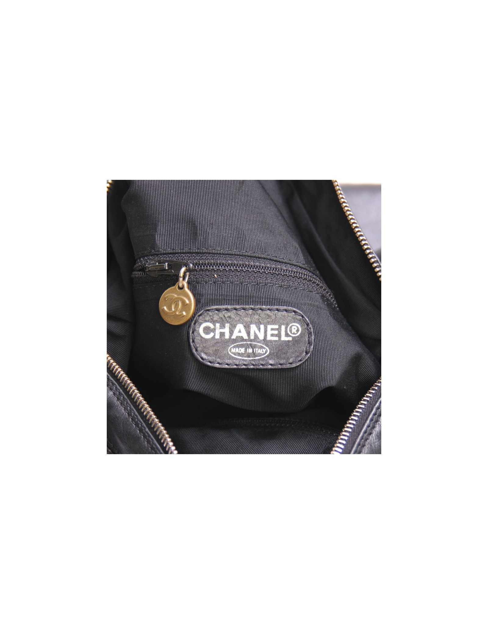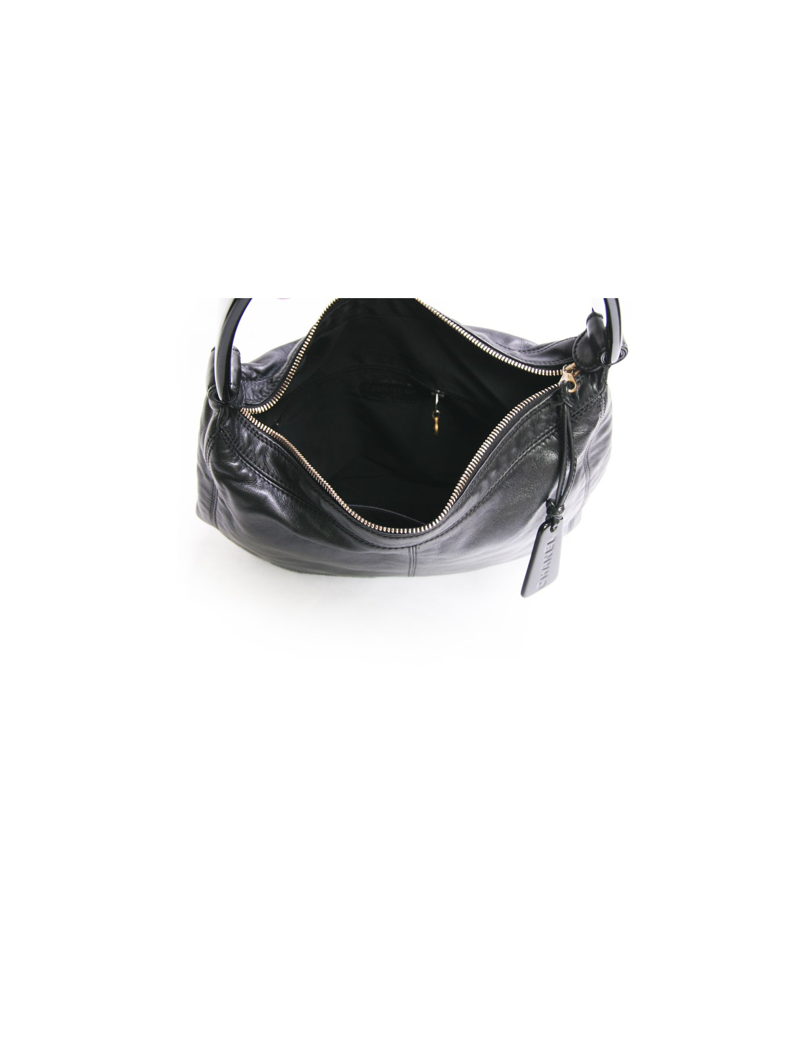 Great bag Chanel bag black soft leather. The handle is black Plexiglas. Zipped. The Interior is black cloth with two zippered pockets. The acronym 'CC' is surpiqué with black seams at the bottom left of the bag. Hologram: 5594... In very good condition. micro scratches on the Cove.