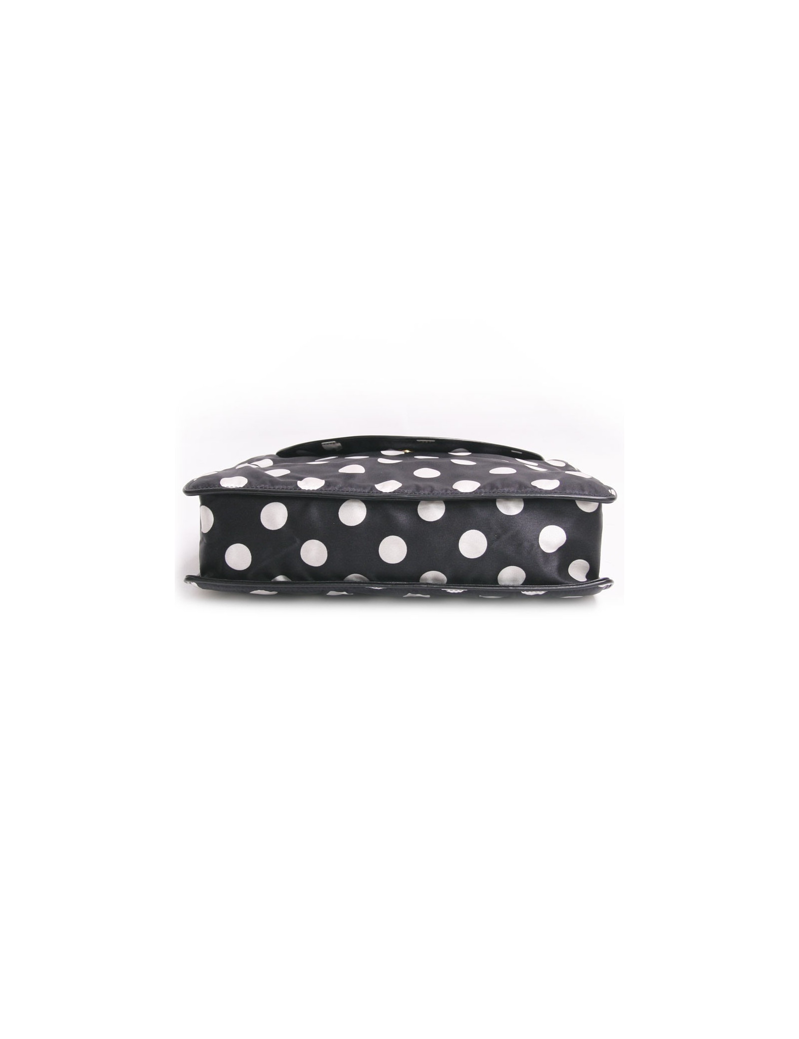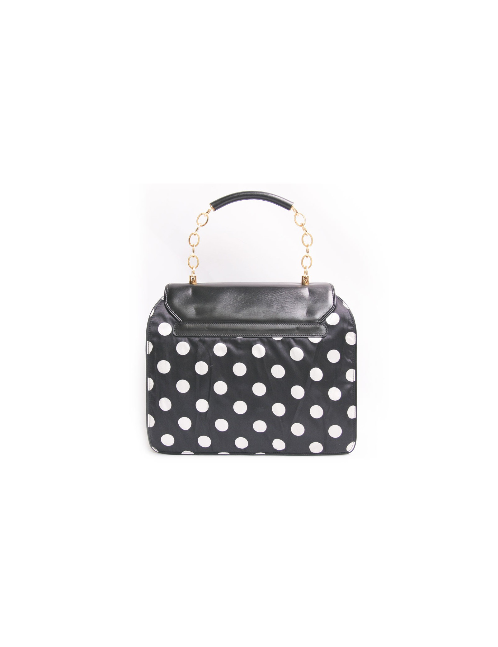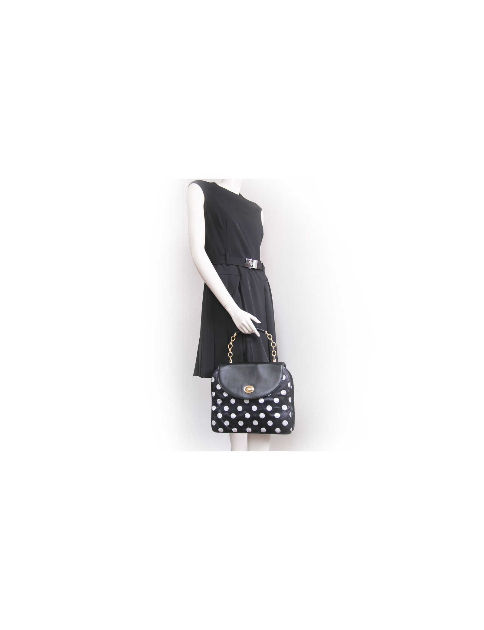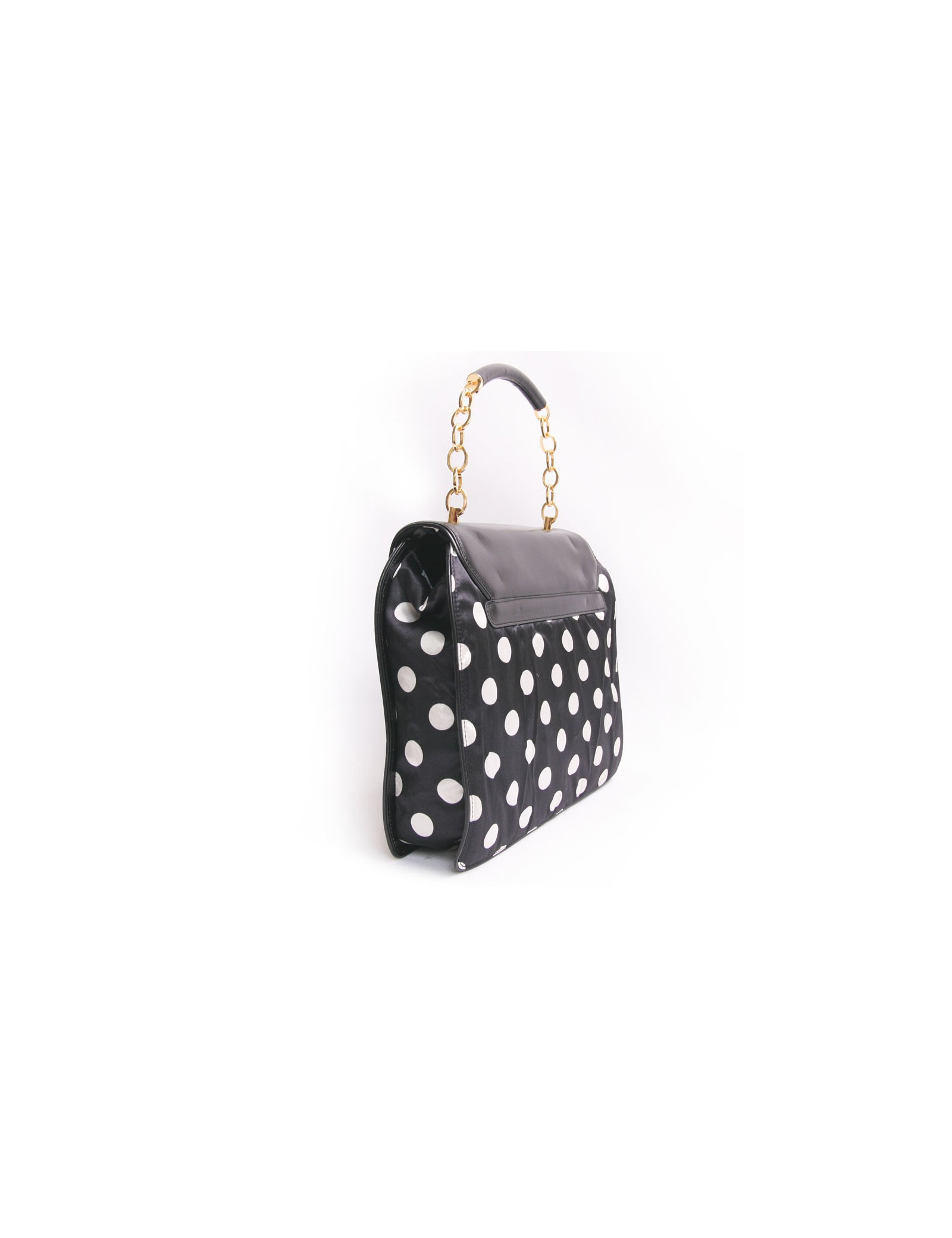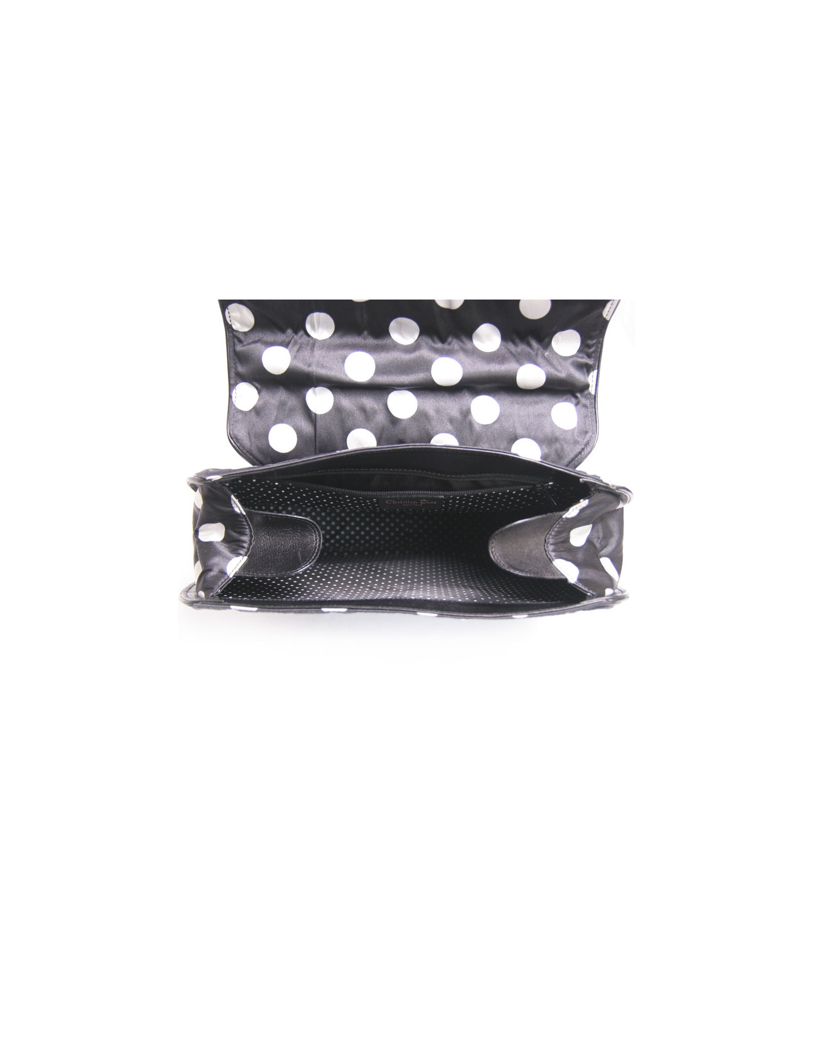 Trend! White dots on black vintage Christian Dior bag. Closing pressure. The Interior is black cloth with white polka dots with a large zippered pocket. It is worn to arm using a handle in black leather and gold metal rings. In very good condition. A few light scratches on the flap in black leather.
