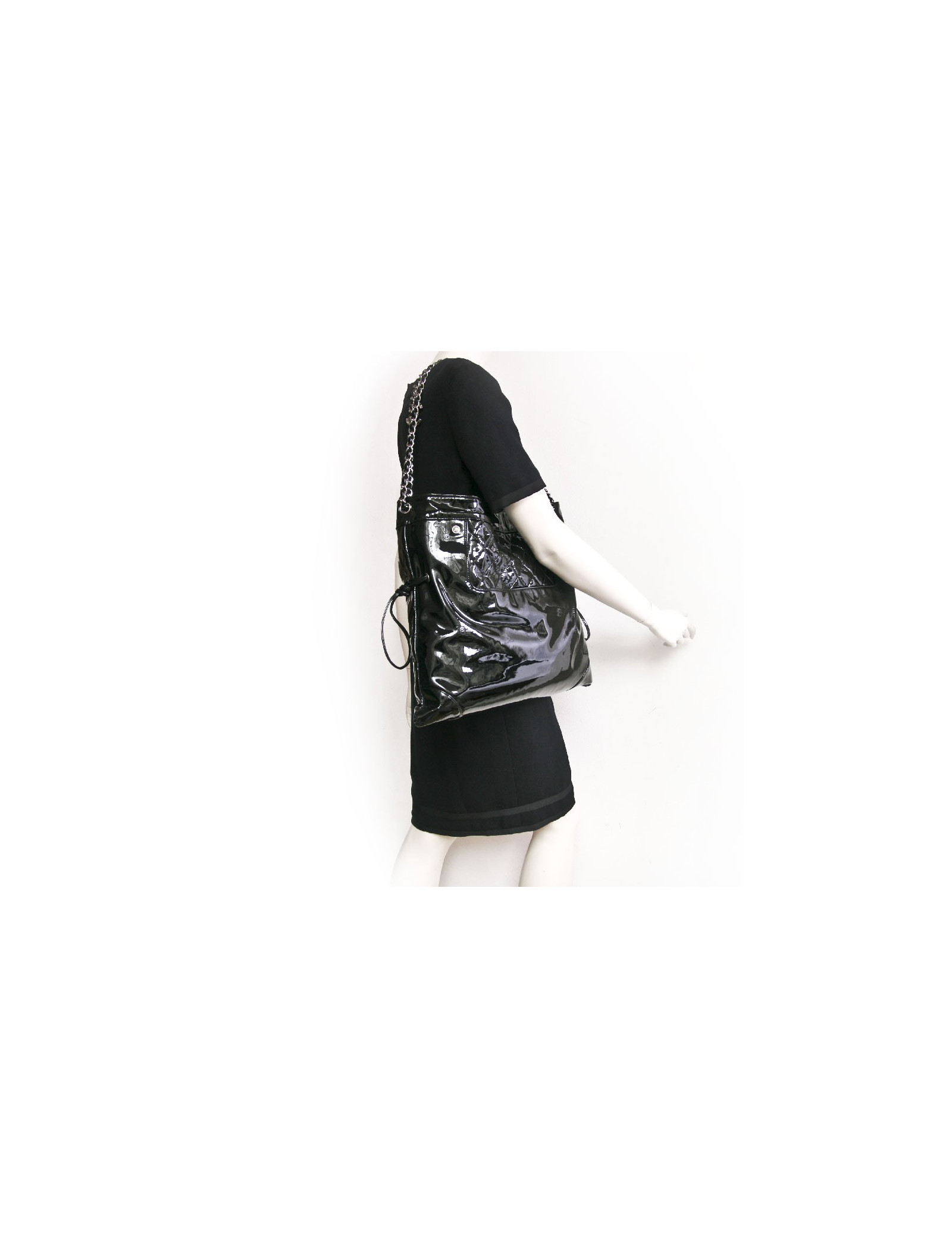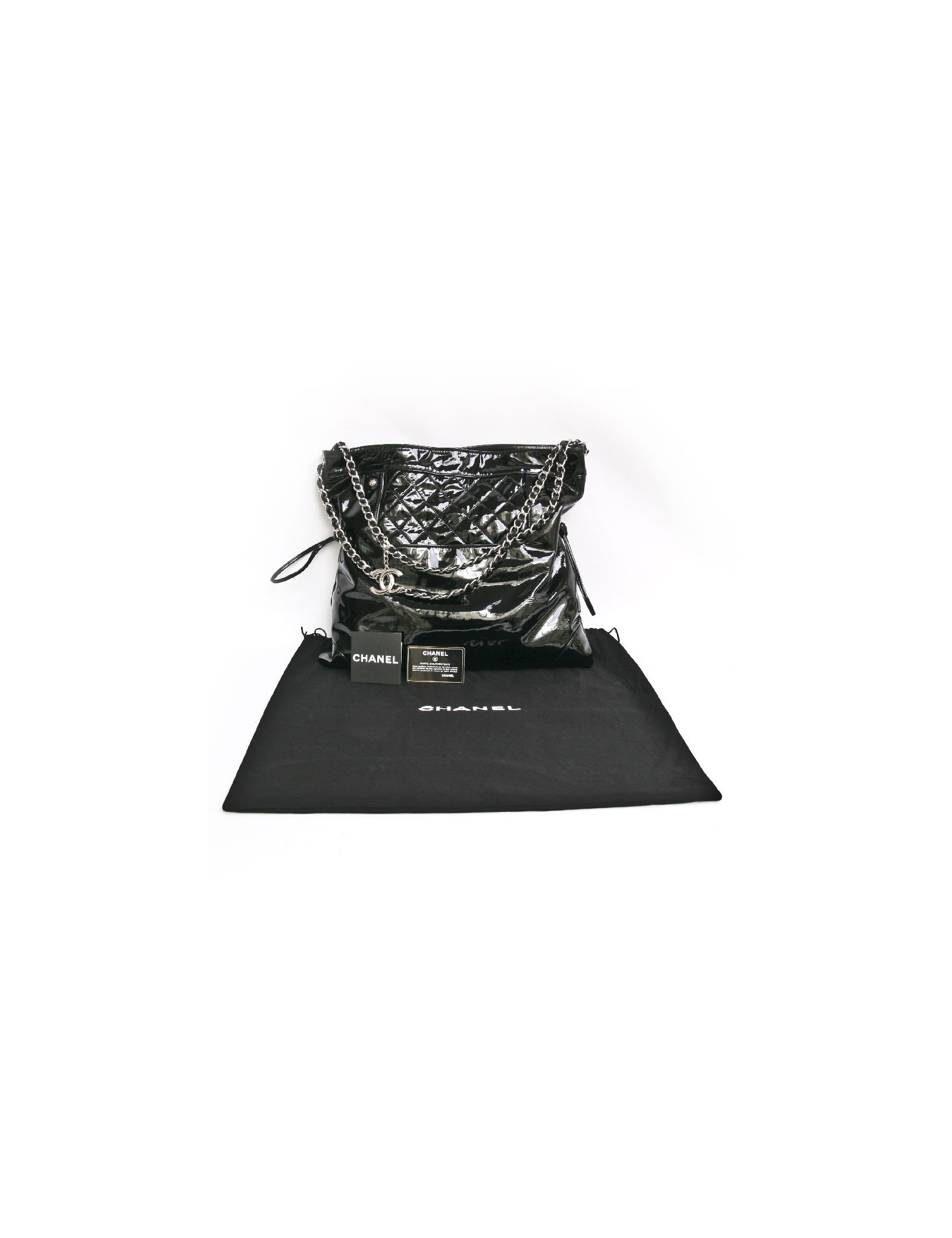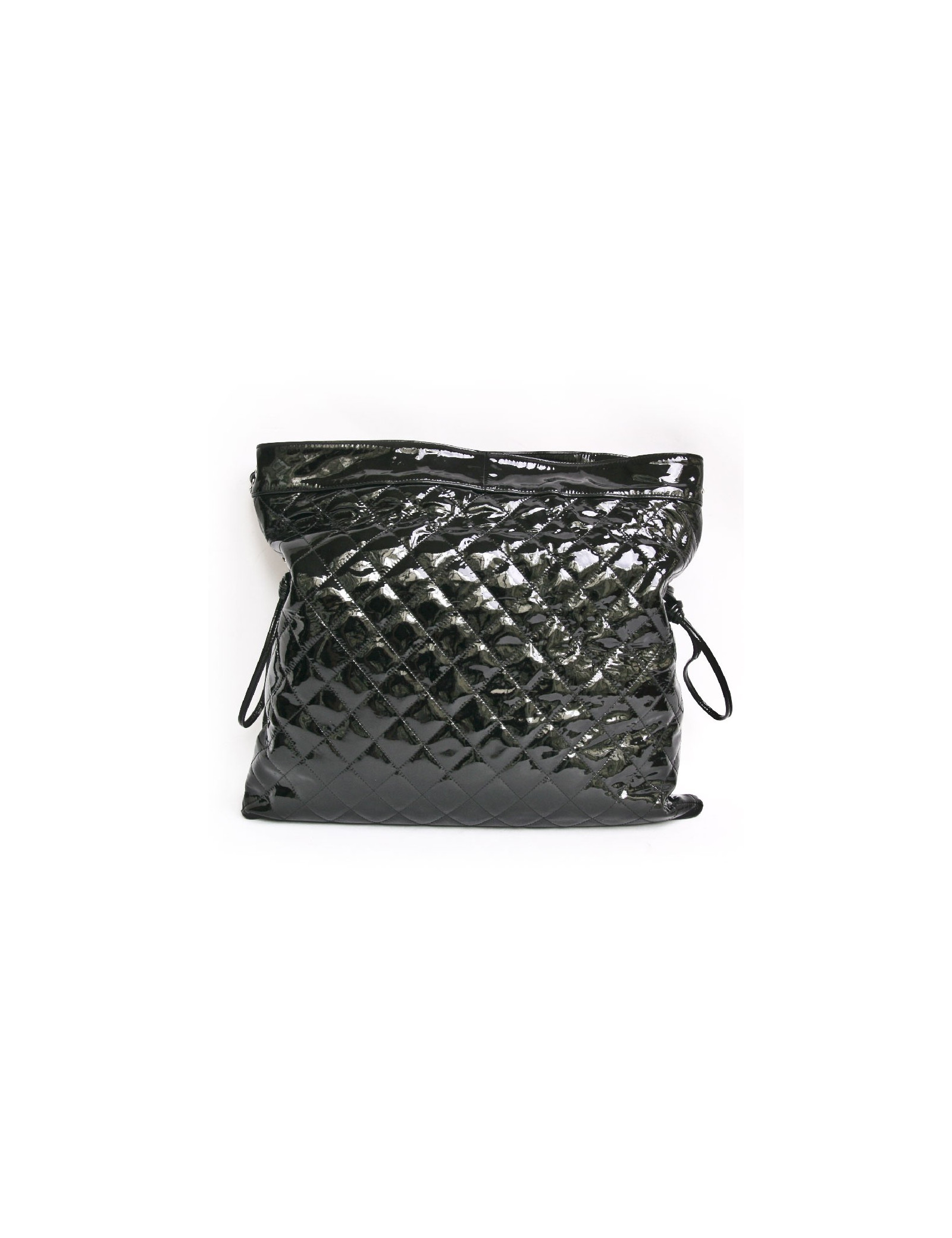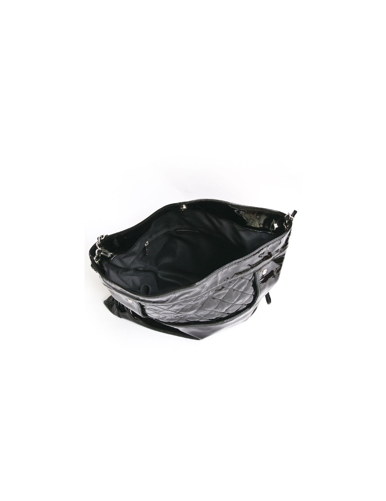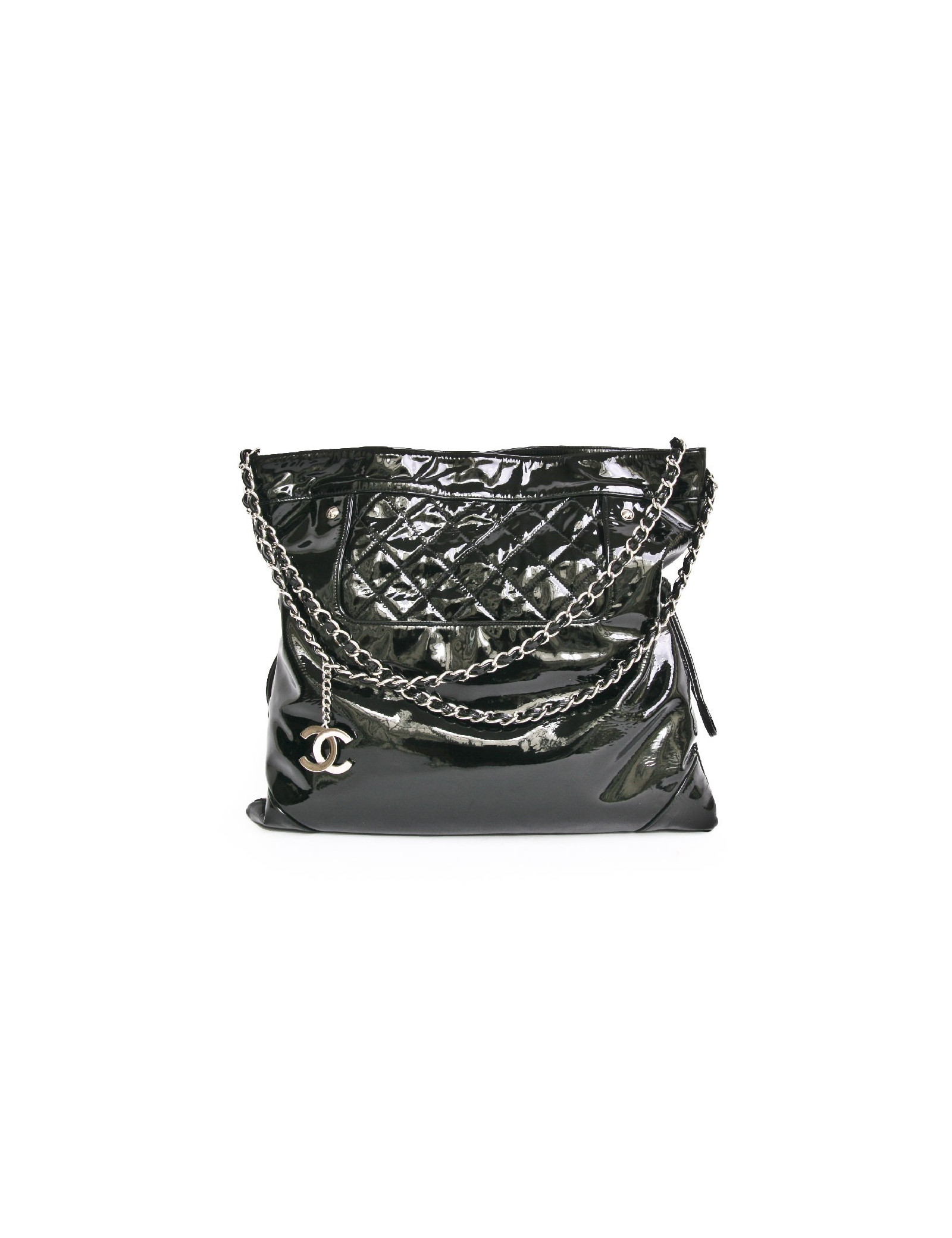 Chanel GM messenger bag in black patent leather. One part is smooth and the other part is quilted. Snap closure. The hardware is in silver metal. The interior is in black canvas with 3 pockets including one zipped.