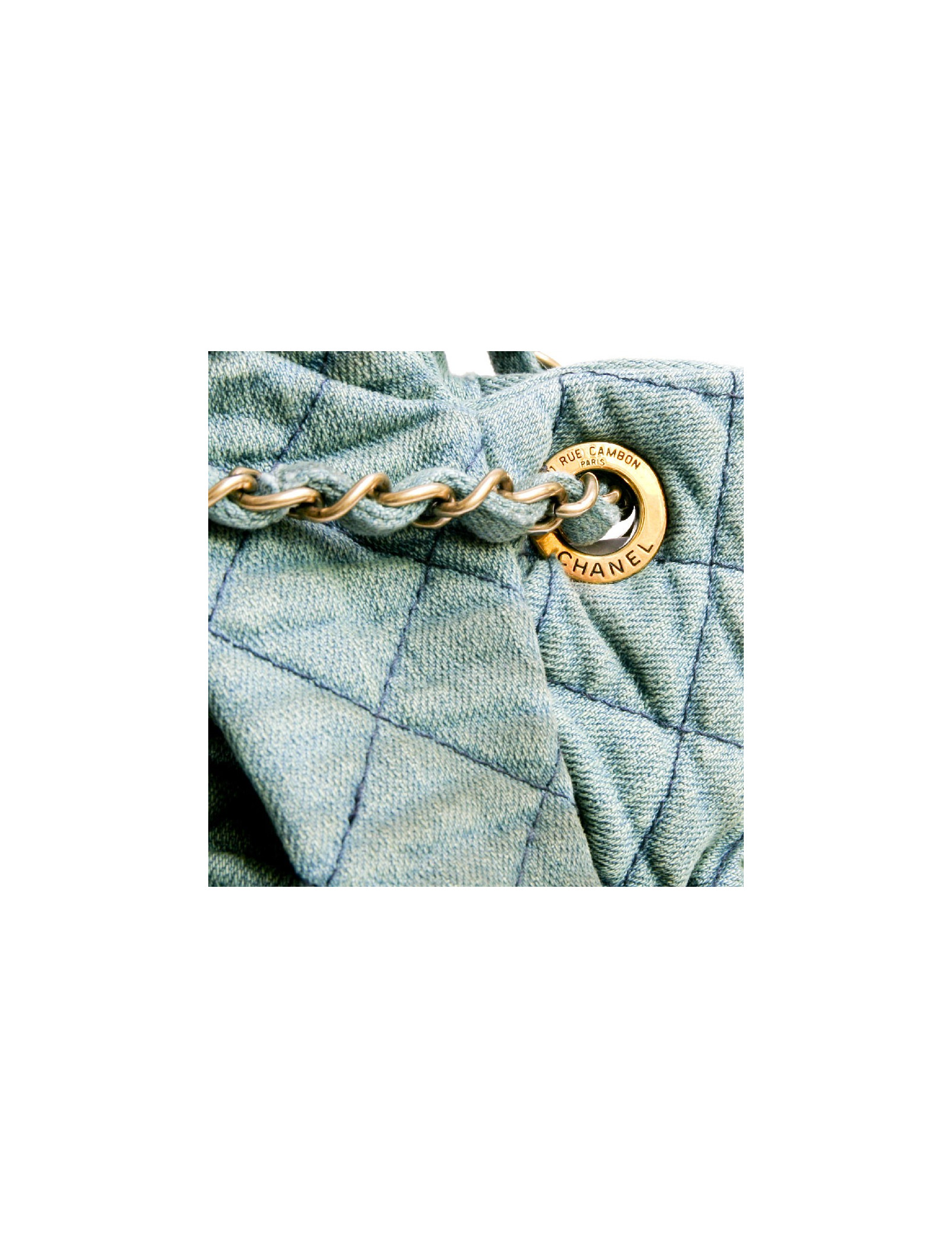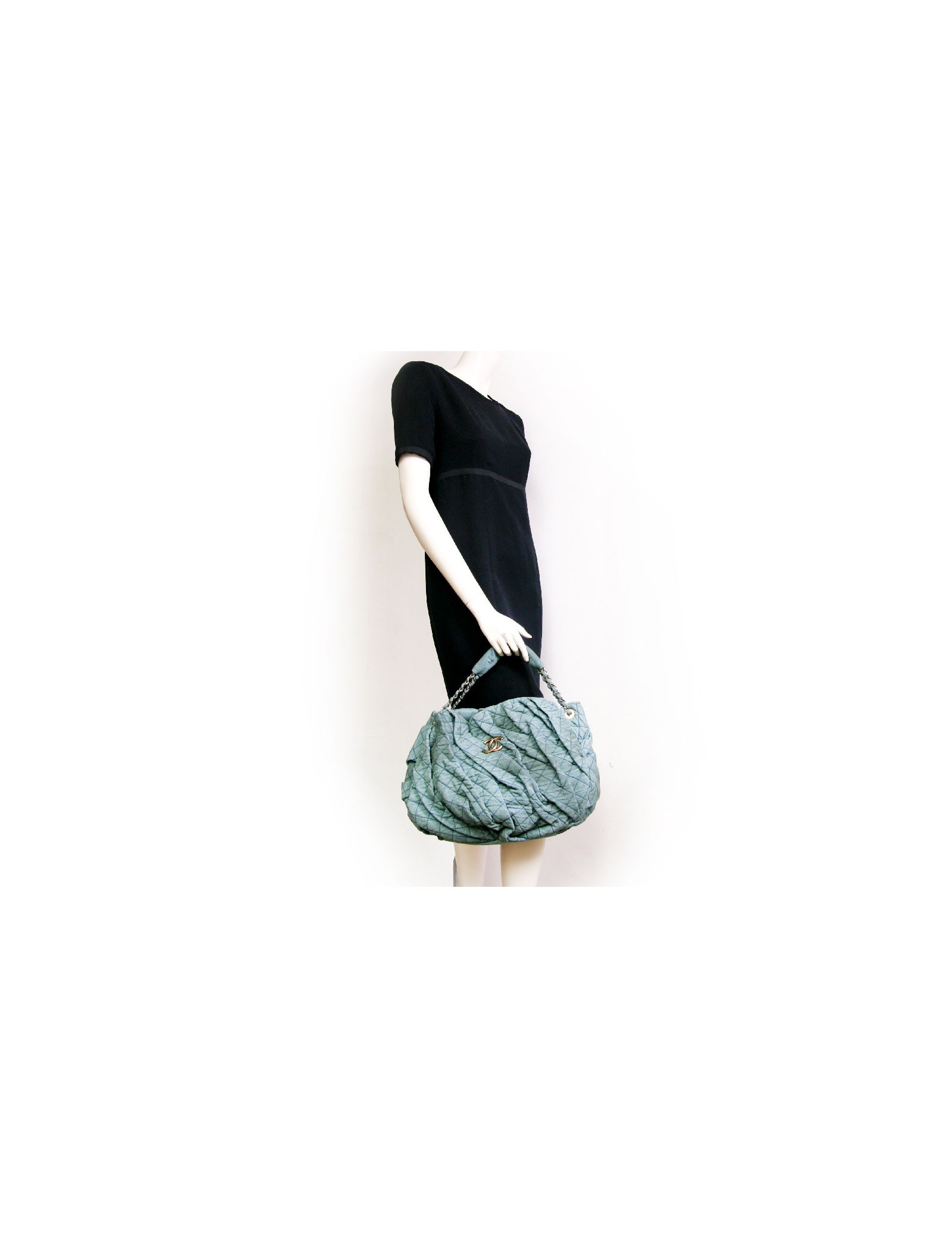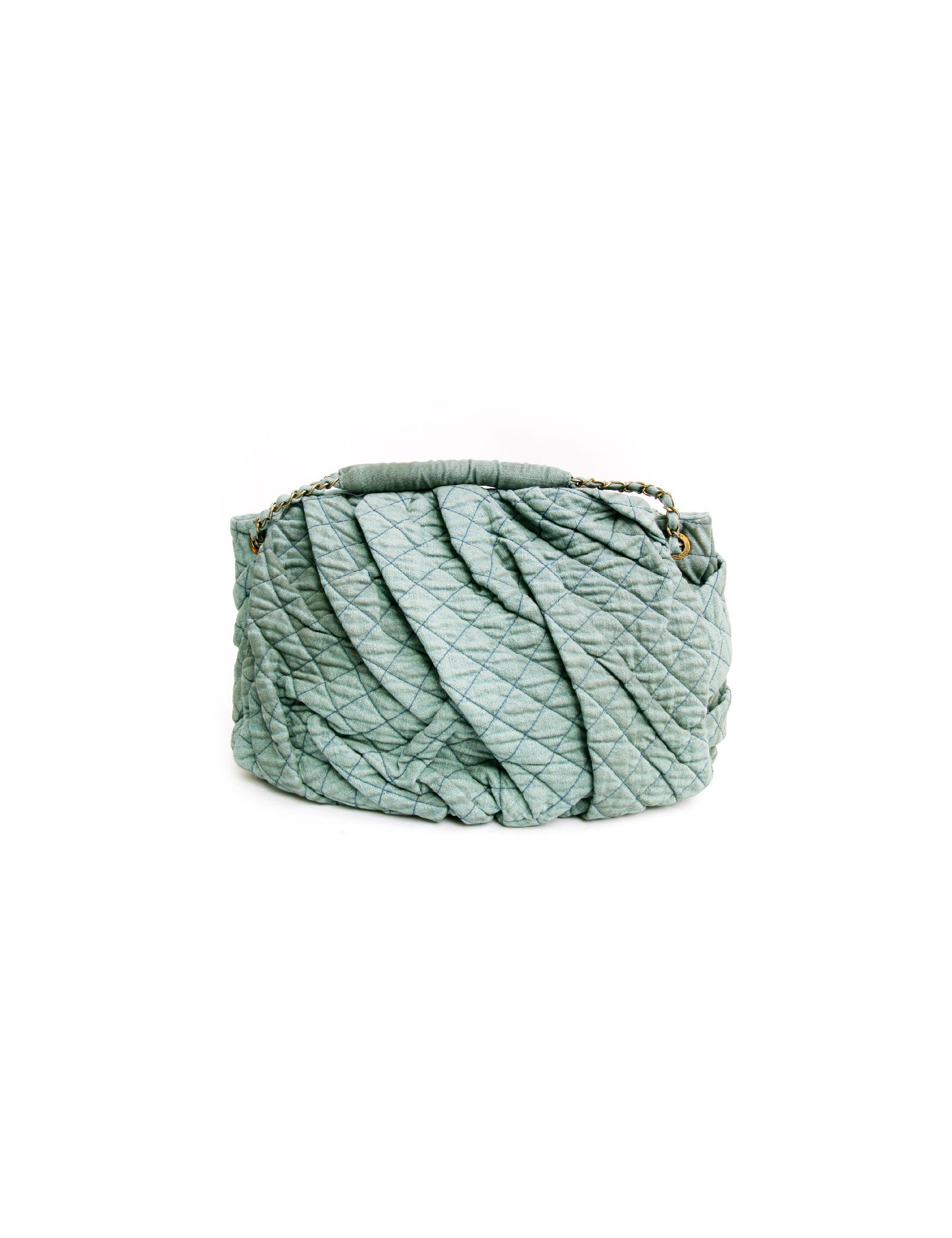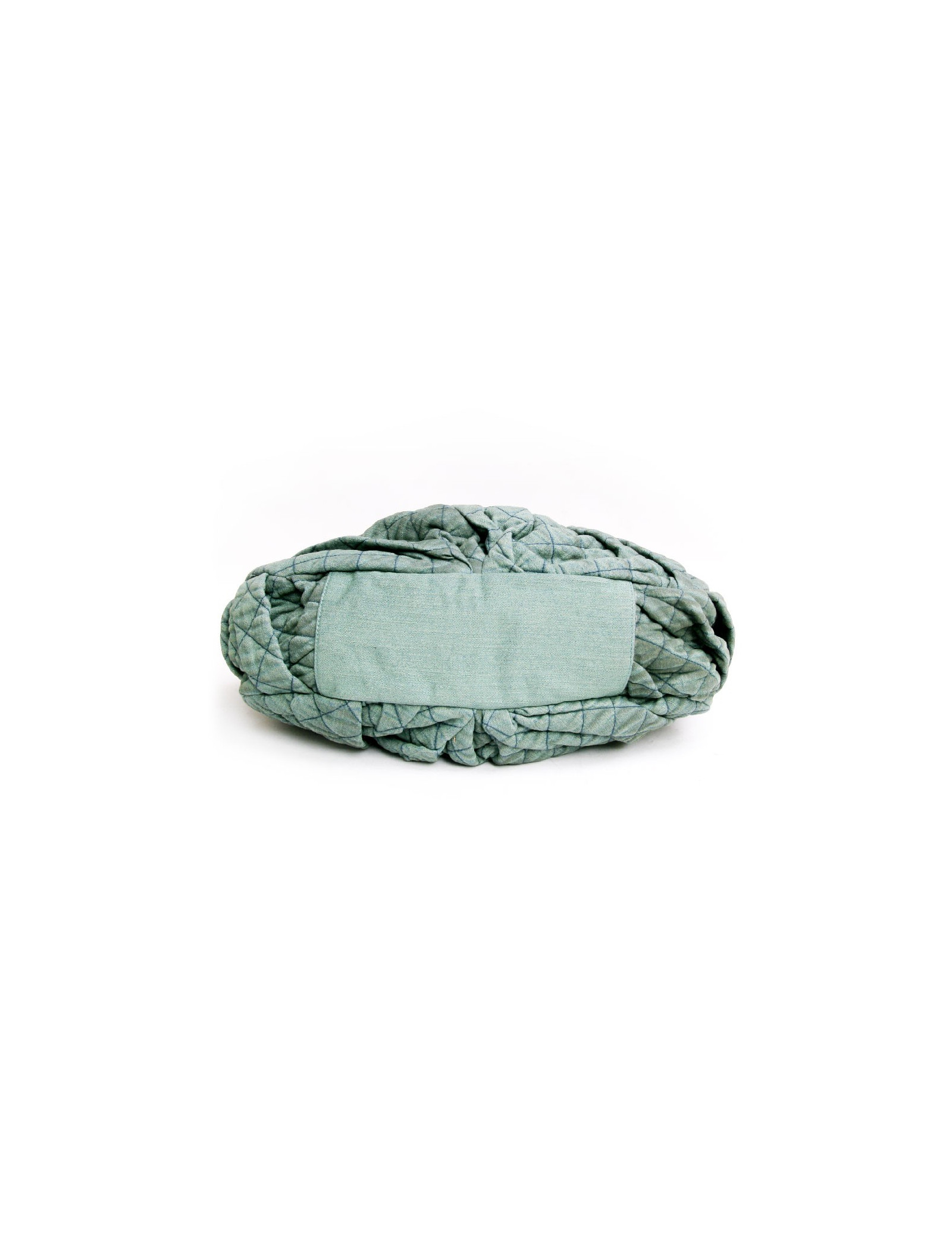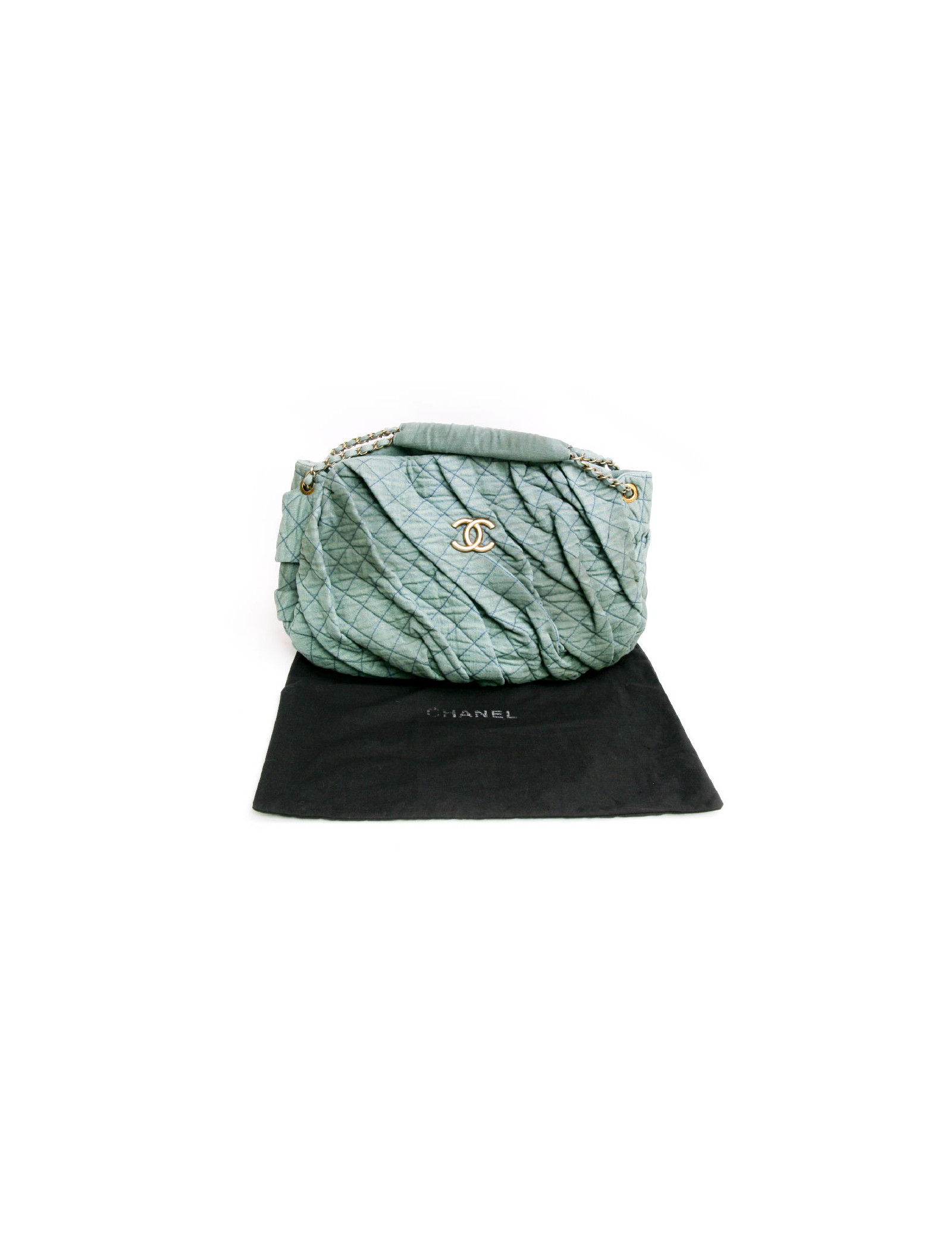 Bag Chanel House in old turquoise green quilted fabric bag. The jewelry is aged gold metal. Closing pressure. The Interior is brown satin with 3 pockets including 1 zipped and 1 for smartphone. In very good condition.