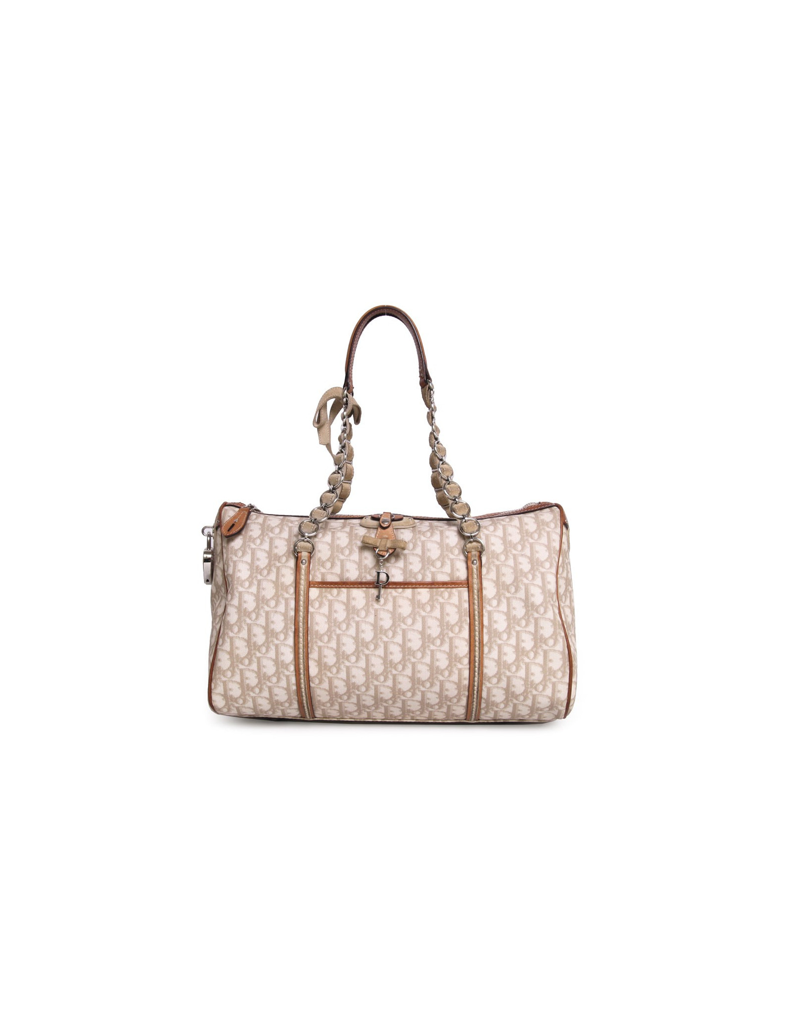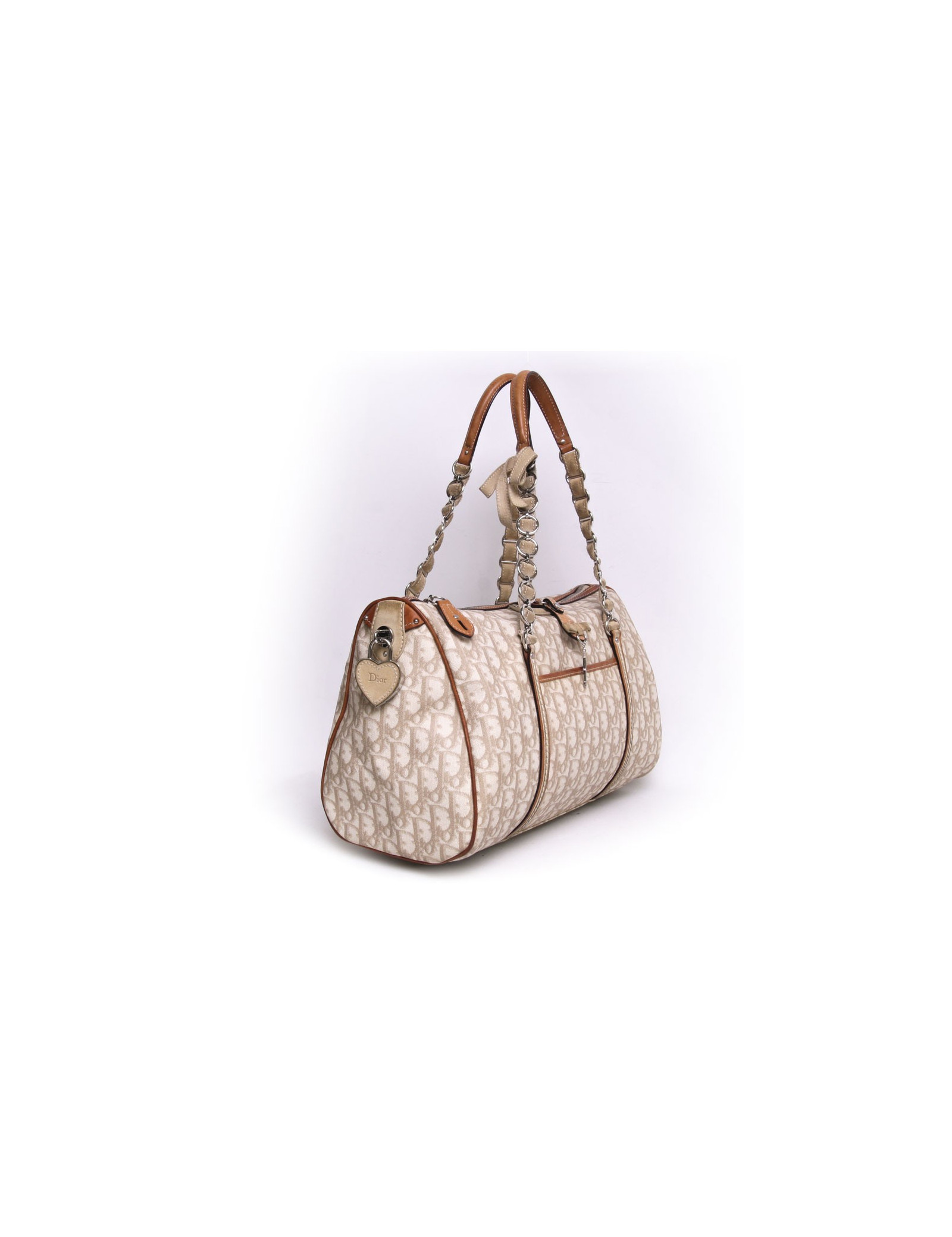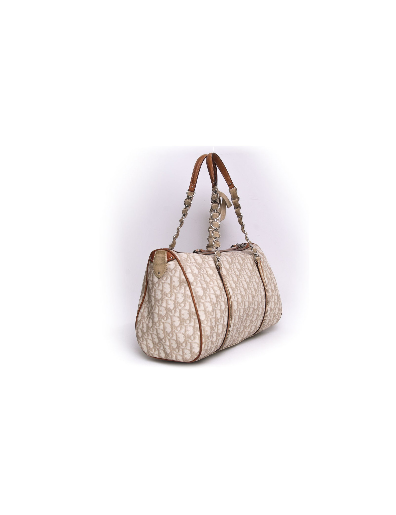 Bag Christian Dior in monogram canvas coated ivory and Brown. The jewelry is silver metal. Zipped. The inside is pink satin with a Pocket zipper as well as a pocket for smartphone. It is worn at the shoulder using two handles in brown leather, beige suede and silver chain. It has a flat front pocket. In very good condition.