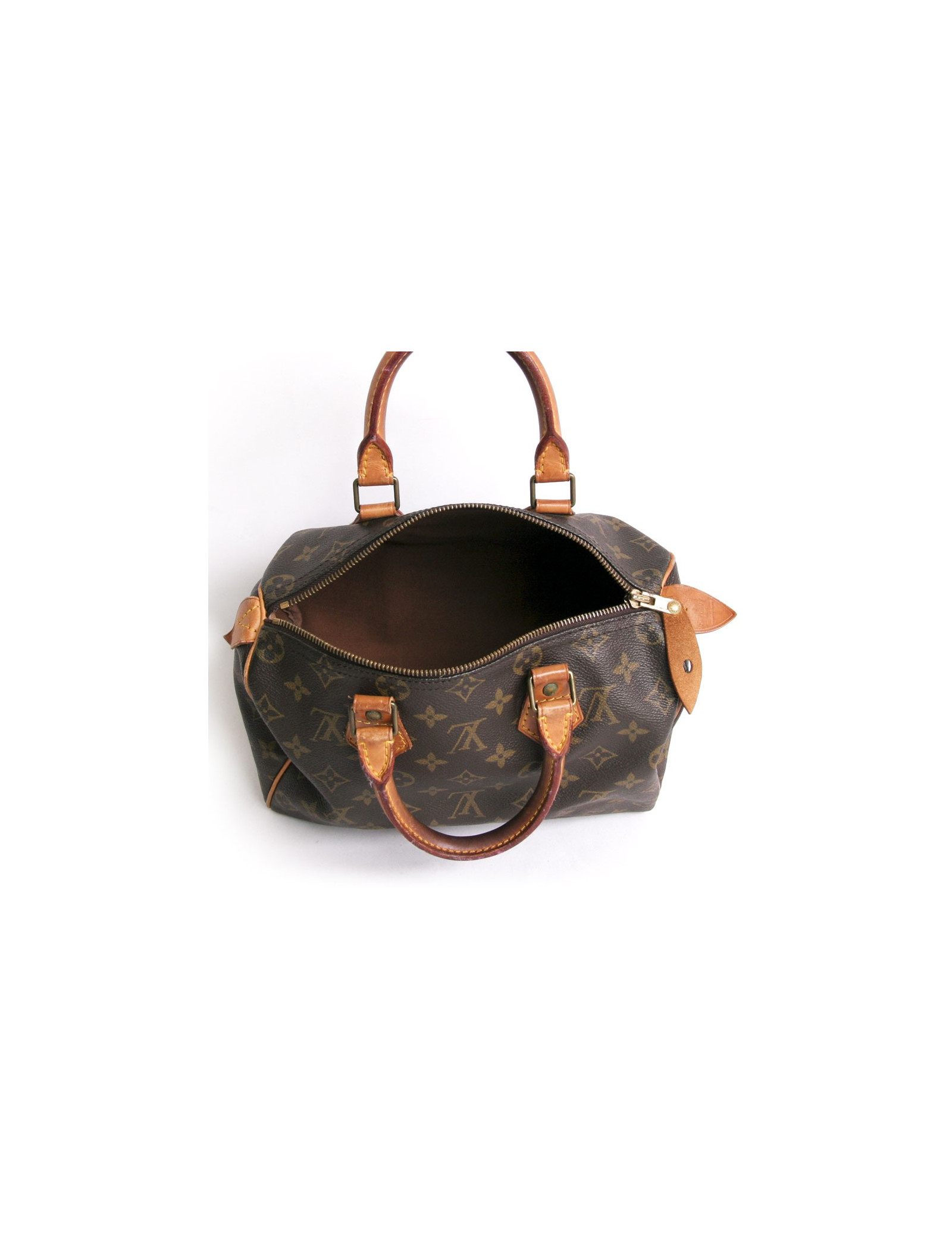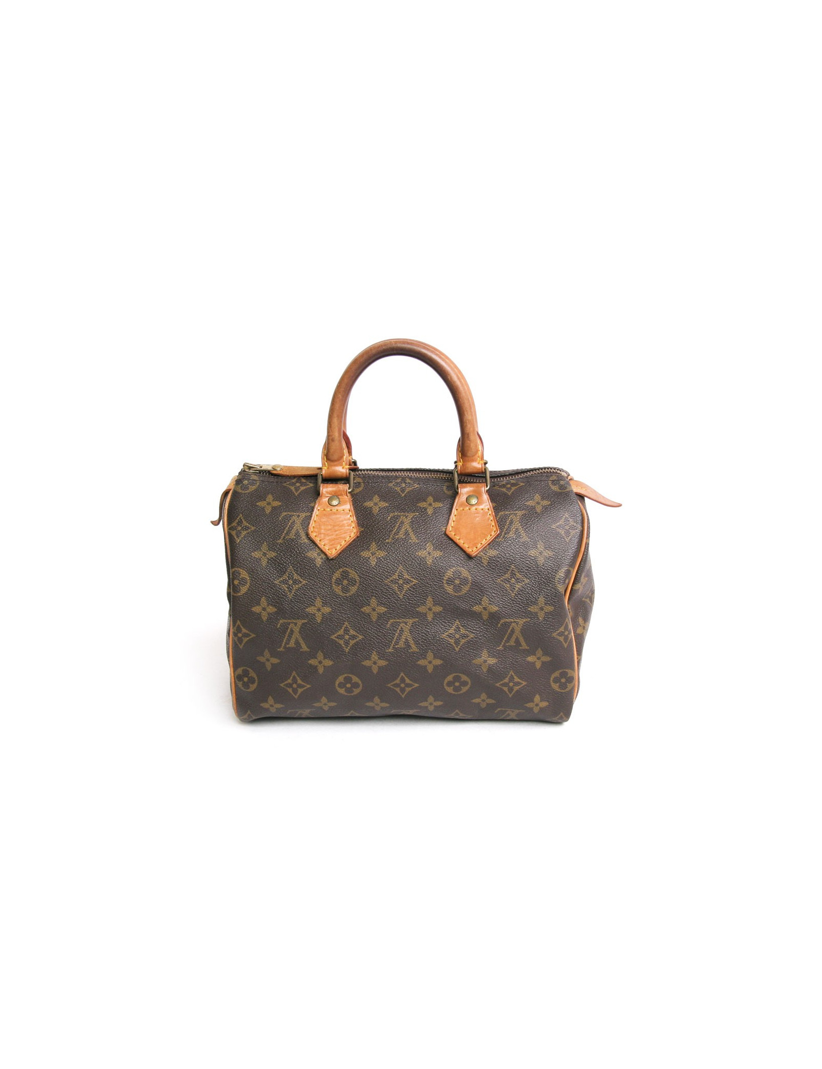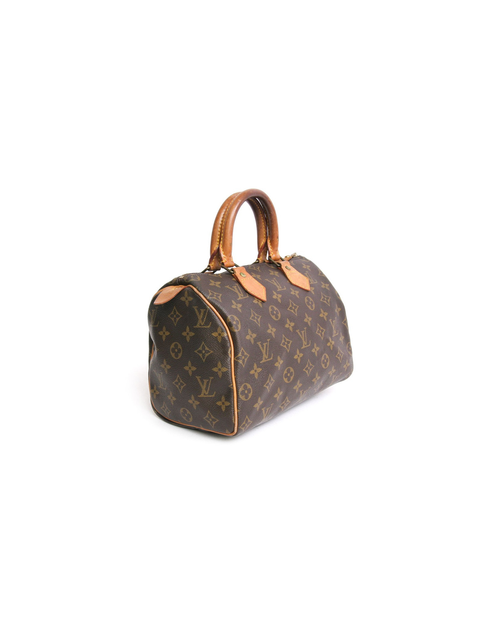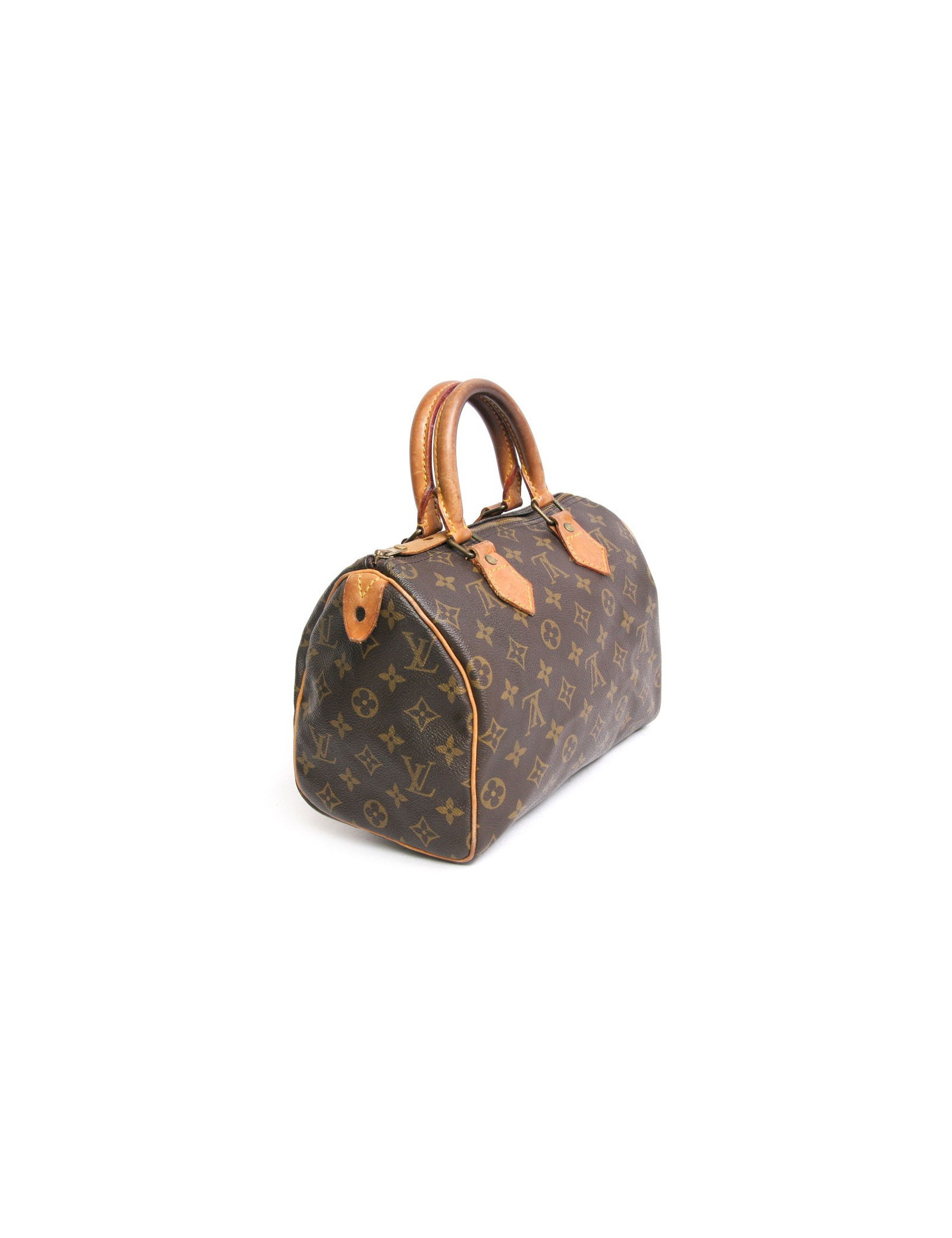 The must-have accessory, the "speedy 25" bag of the Maison Louis Vuitton monogram canvas. Of its size, it adapts to the fast pace of modern life. Zipped. The filling is made of gilded brass. Door hand using two handles in natural cowhide. In very good condition. The leather is skated. Very slight wear to corners under the bag.